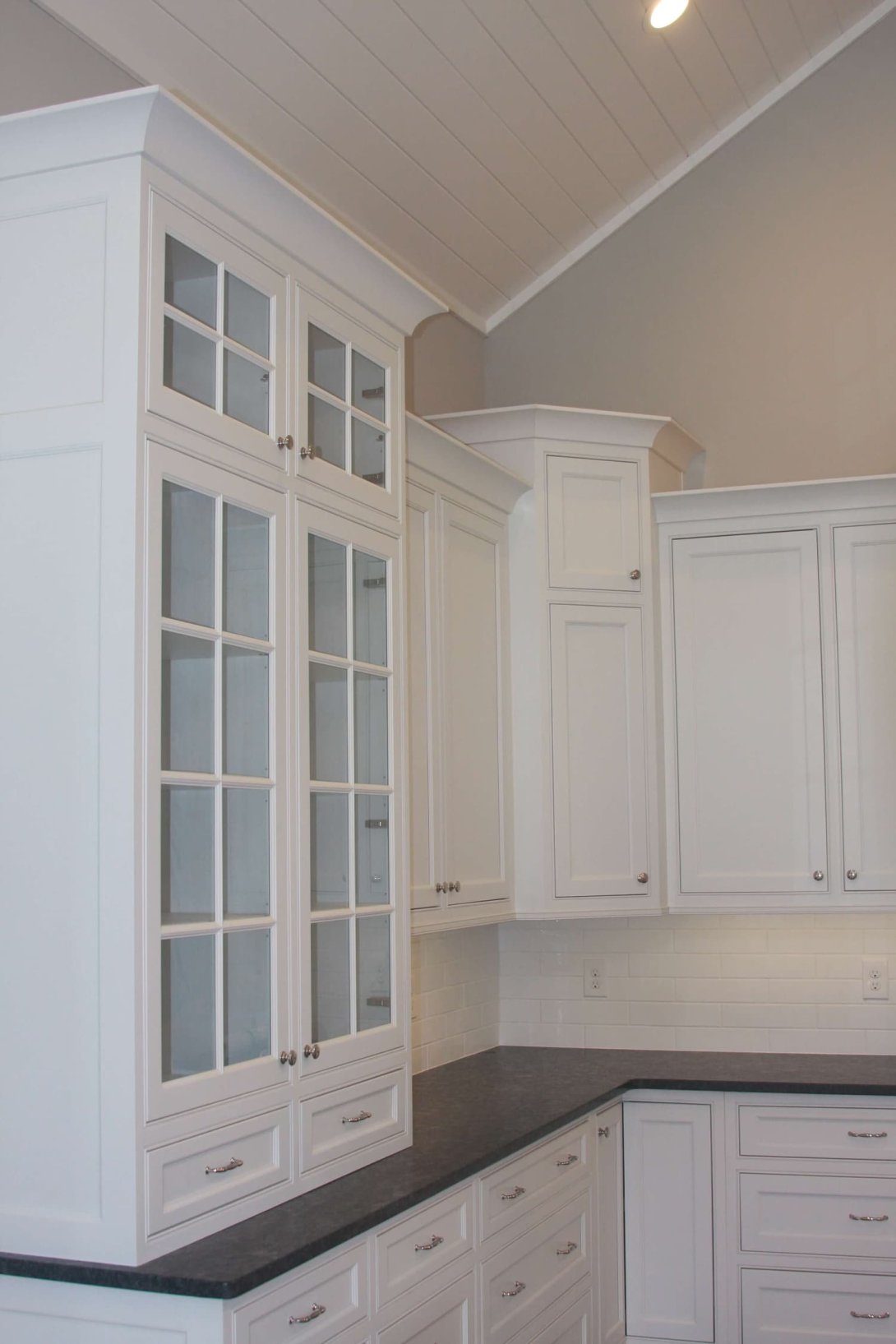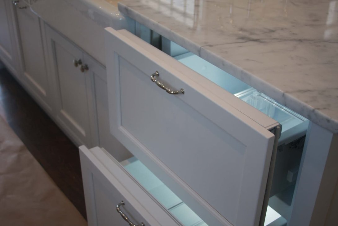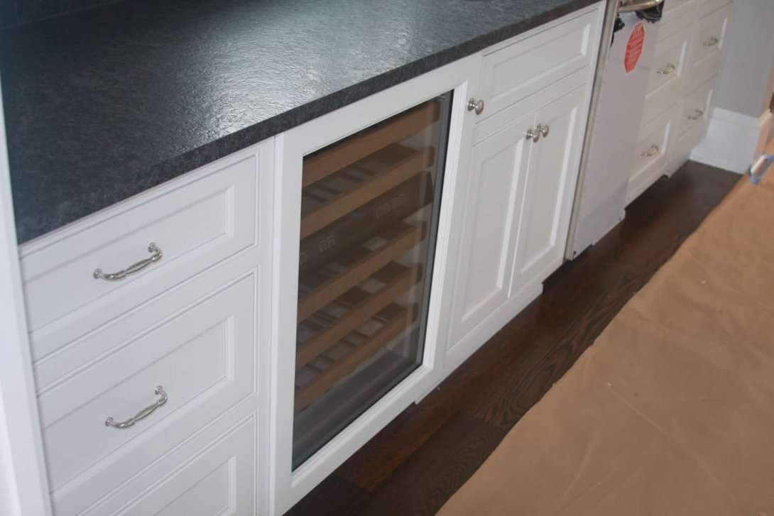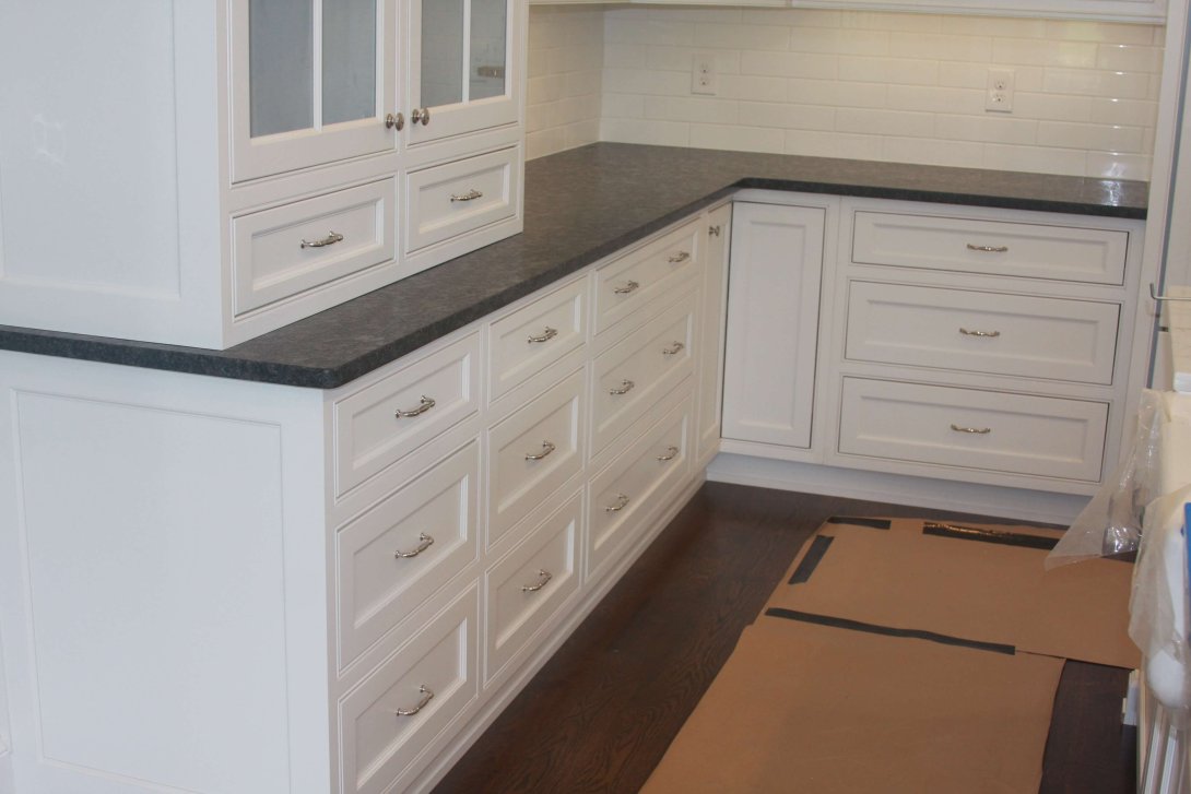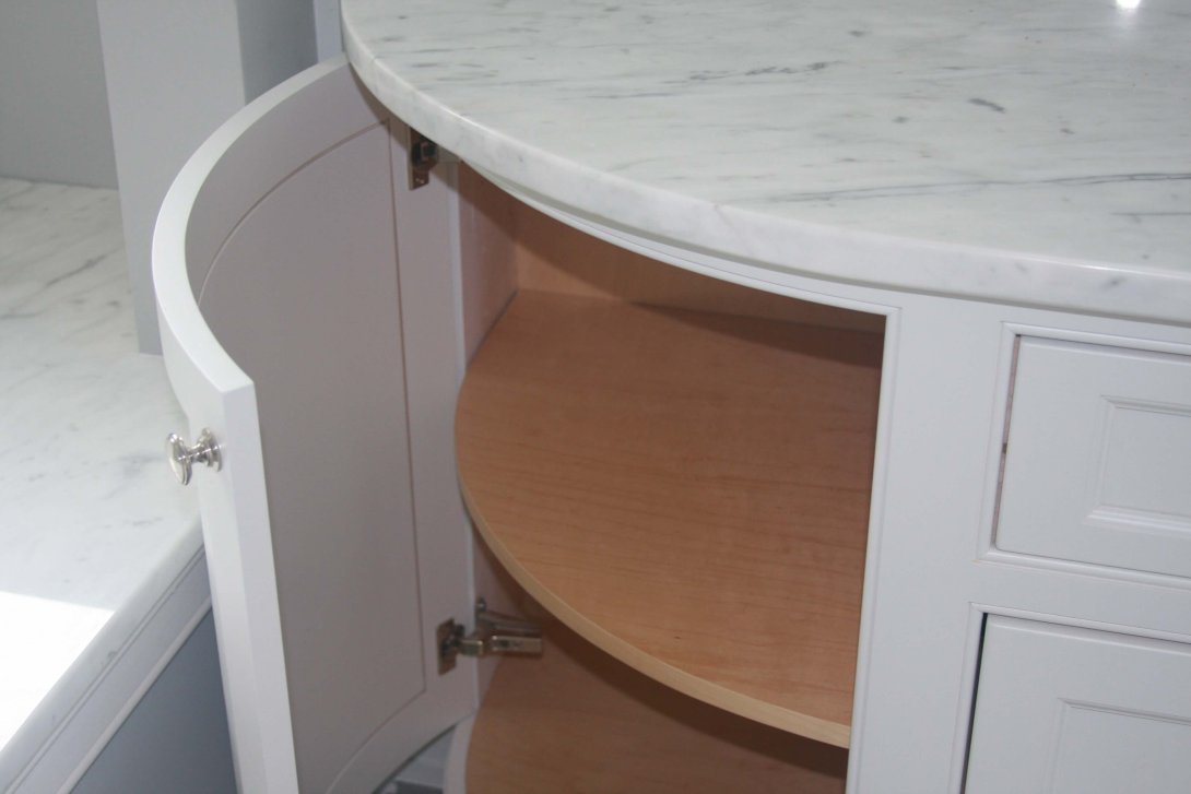 The Adams kitchen remodeling project exudes refined elegance and superb craftsmanship, combining timeless design with high-end functionality. Featuring beautifully crafted custom cabinetry in a crisp white finish, the kitchen offers ample storage with a thoughtful layout of drawers, cabinets, and glass-front display units. A particularly striking detail is the curved corner cabinet with custom shelving, maximizing accessibility and visual appeal.