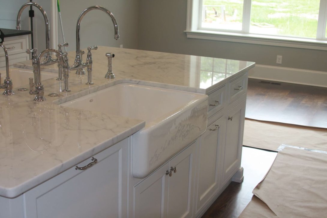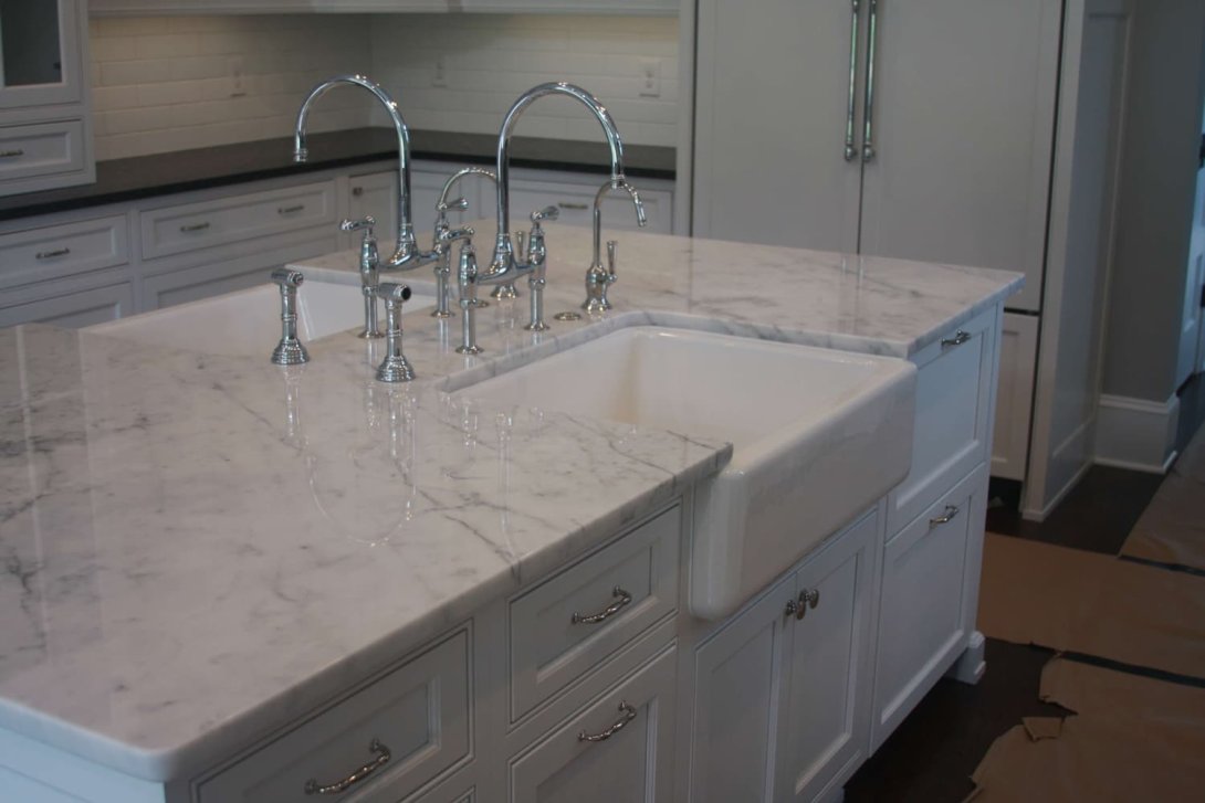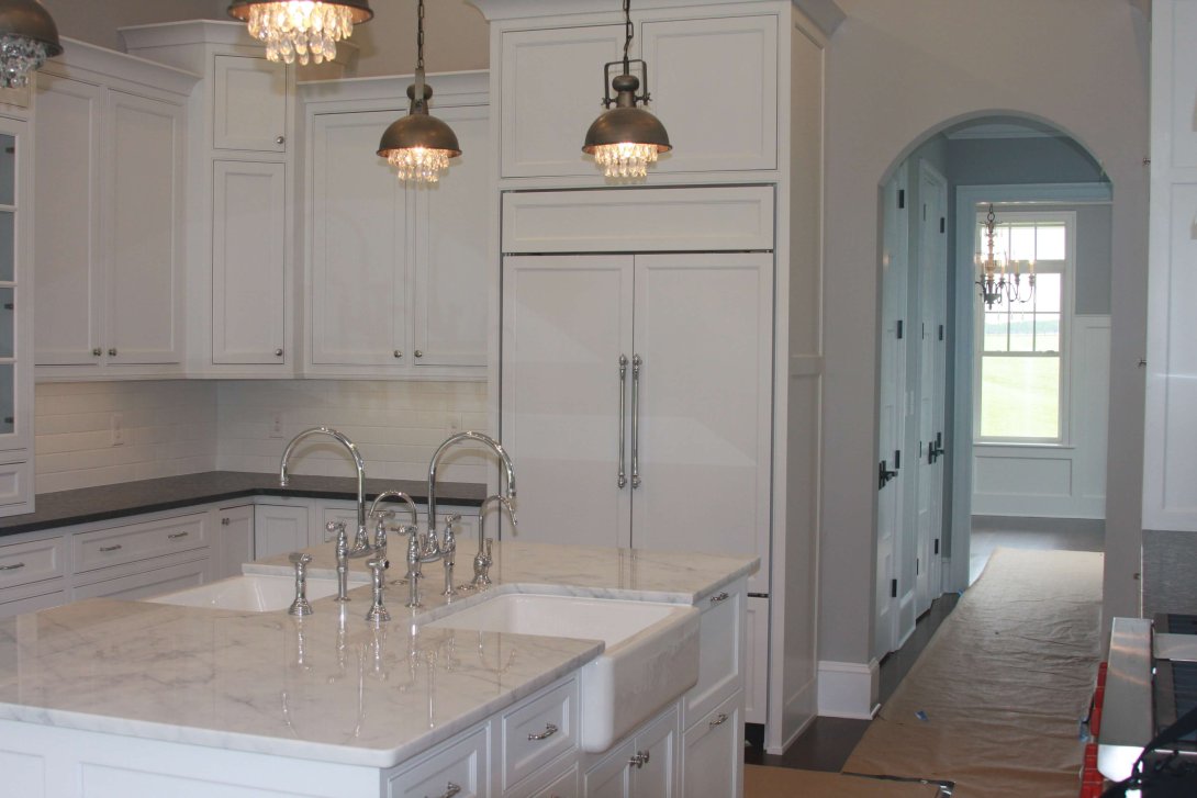 The countertops feature a sophisticated mix of surfaces: dark, textured stone lends a dramatic contrast to the cabinetry, while luxurious marble tops the generous center island. This spacious island serves as a true focal point, featuring dual farmhouse sinks with gleaming polished chrome fixtures, along with integrated deep storage drawers and pull-outs for optimal organization. The cabinetry is finished with stylish, classic hardware that ties the look together beautifully.