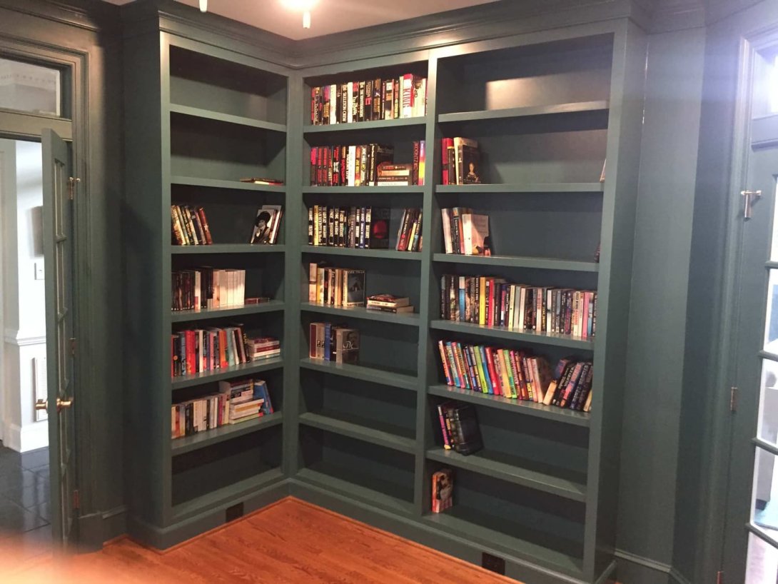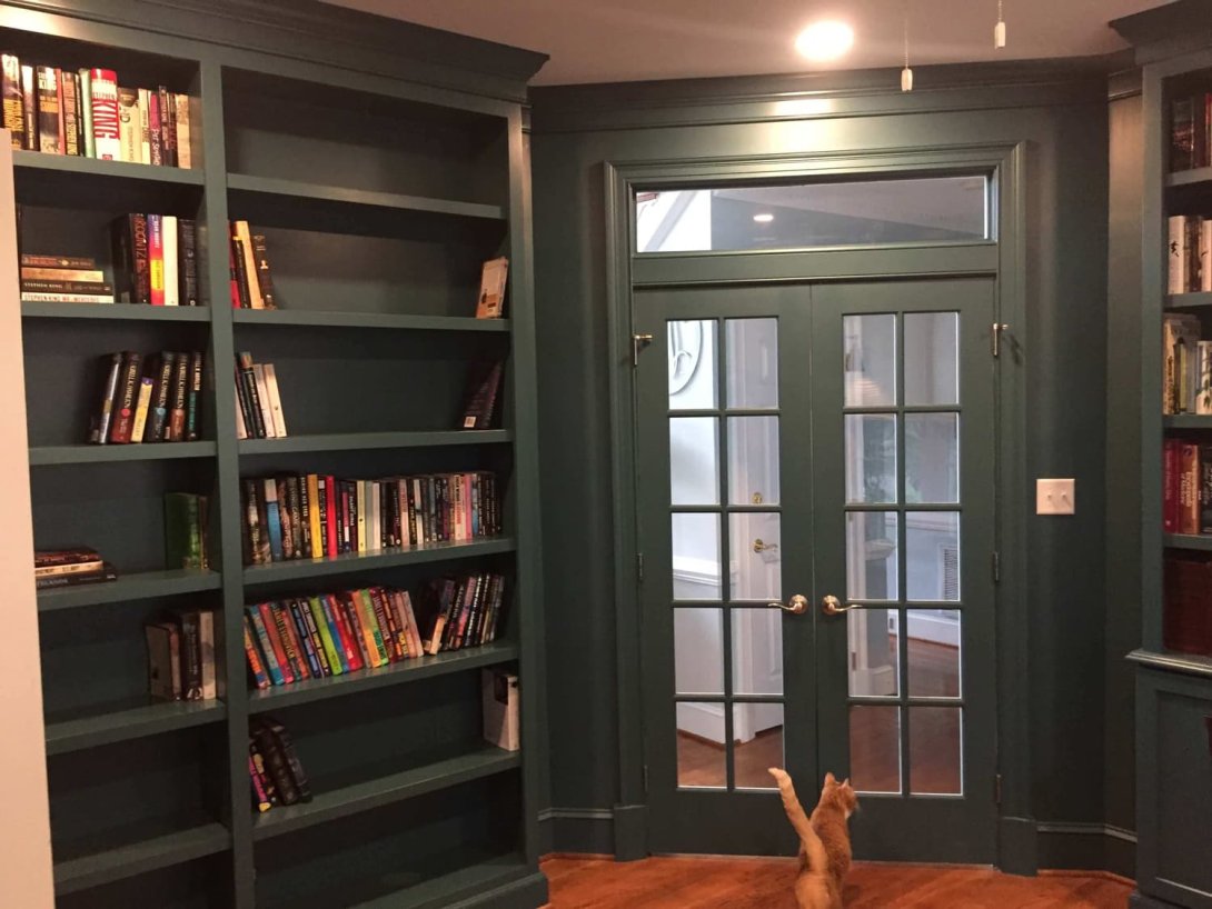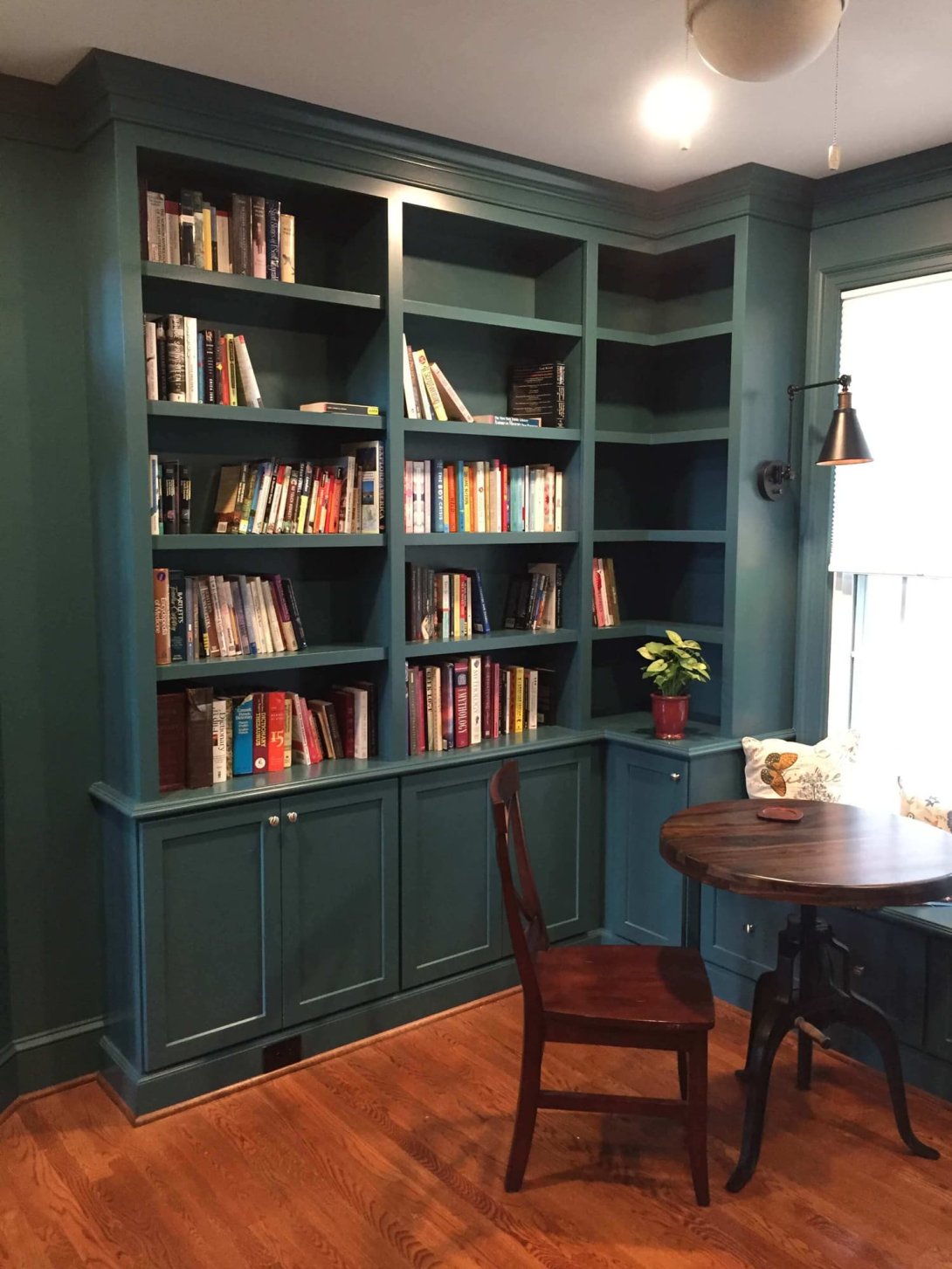 This library remodel is a stunning example of how a bold, monochromatic color scheme can create a sophisticated and immersive retreat. The entire room—including the walls, trim, French doors, and extensive custom bookcases—is enveloped in a deep, moody teal. This dramatic choice creates a seamless, cohesive, and enveloping atmosphere perfect for a cozy study.