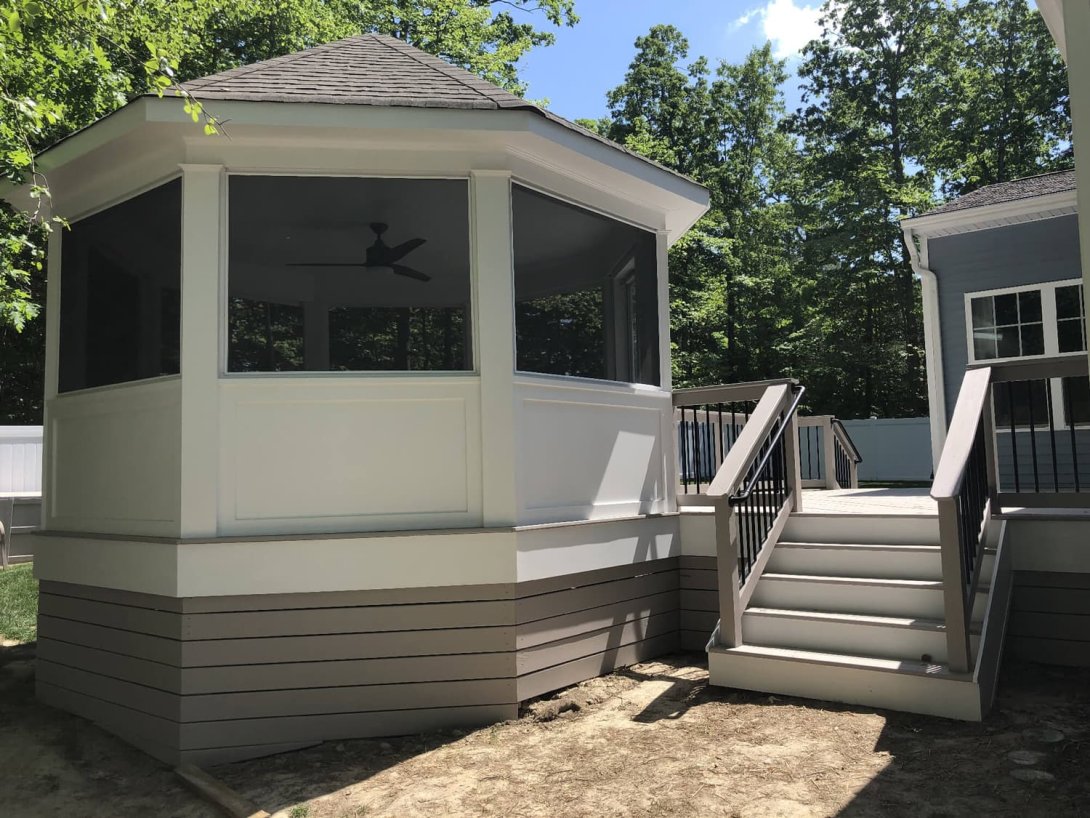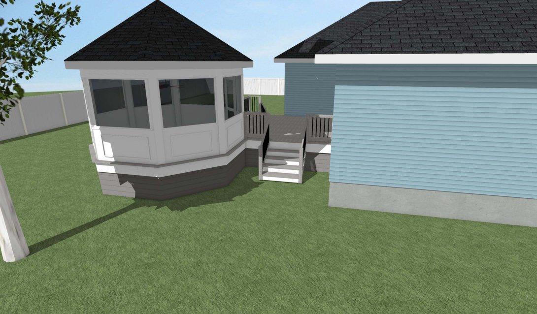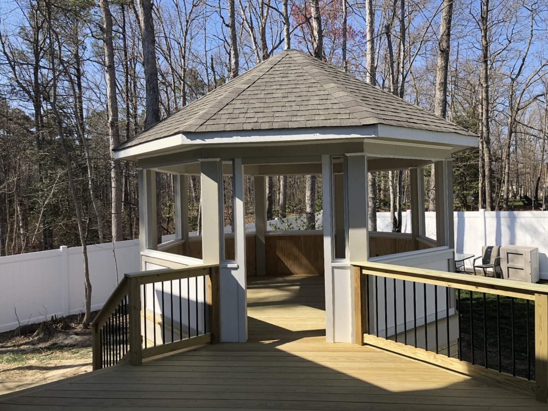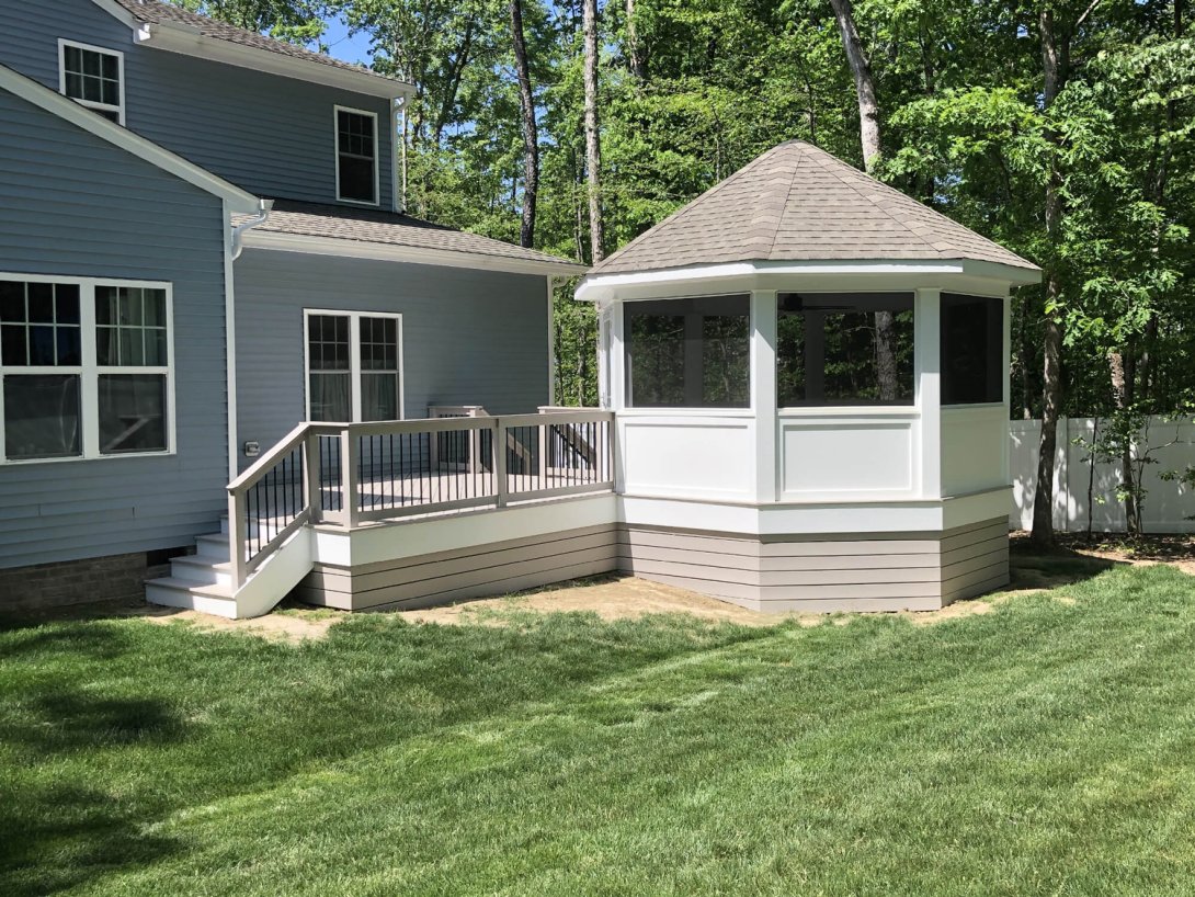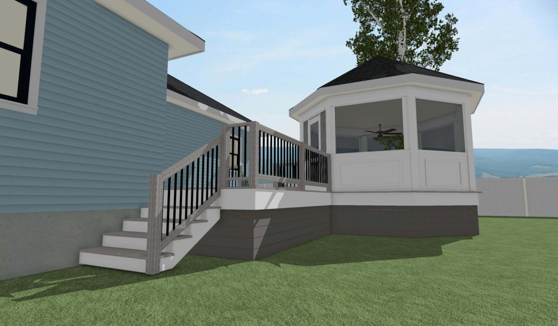 This project showcases the complete creation of a beautiful, multi-zone outdoor living space, expertly guided from 3D design rendering to final construction. The space features an open-air deck that flows seamlessly into a large, octagonal screened gazebo, offering both sunshine and shade. The entire structure is crafted with modern, low-maintenance materials for lasting beauty and minimal upkeep.