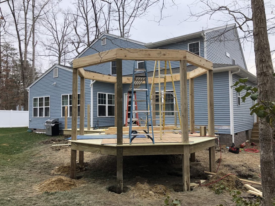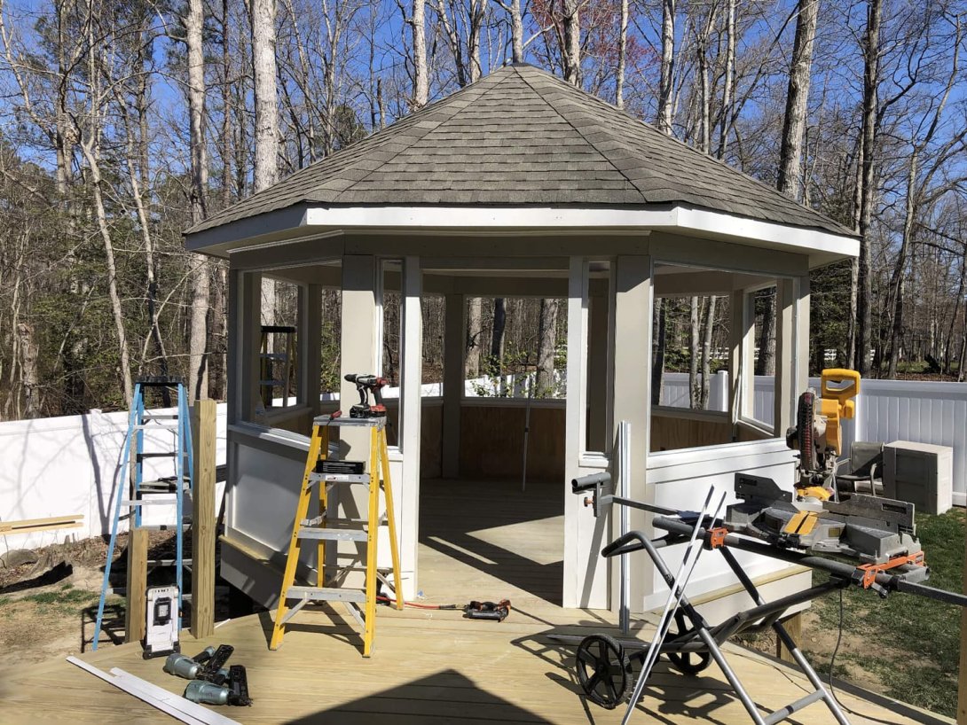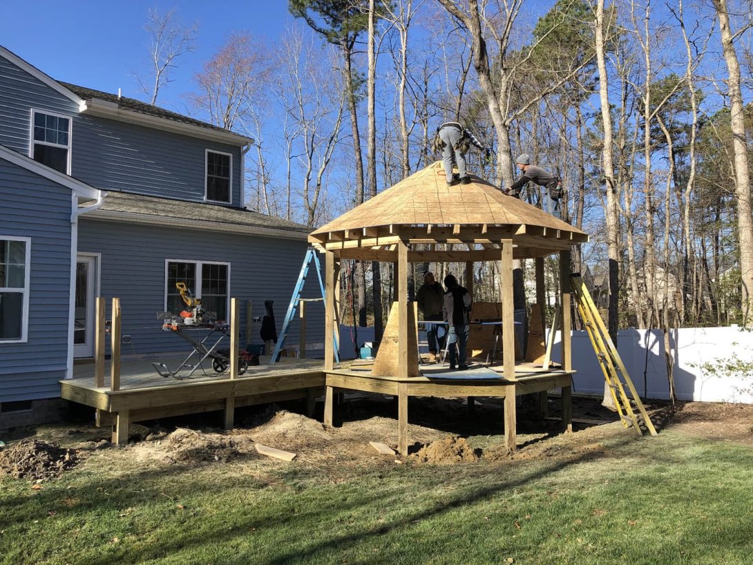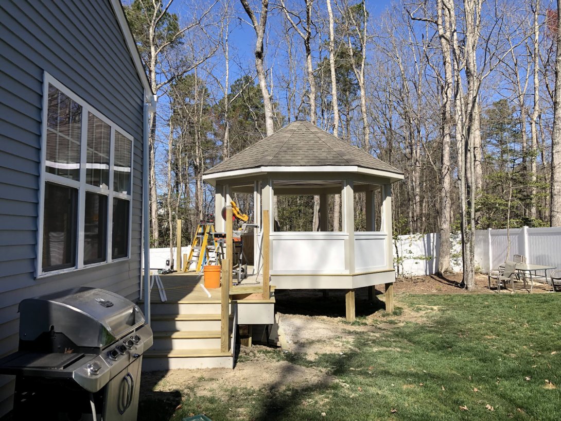 This project showcases the complete creation of a beautiful, multi-zone outdoor living space, expertly guided from 3D design rendering to final construction. The space features an open-air deck that flows seamlessly into a large, octagonal screened gazebo, offering both sunshine and shade. The entire structure is crafted with modern, low-maintenance materials for lasting beauty and minimal upkeep.