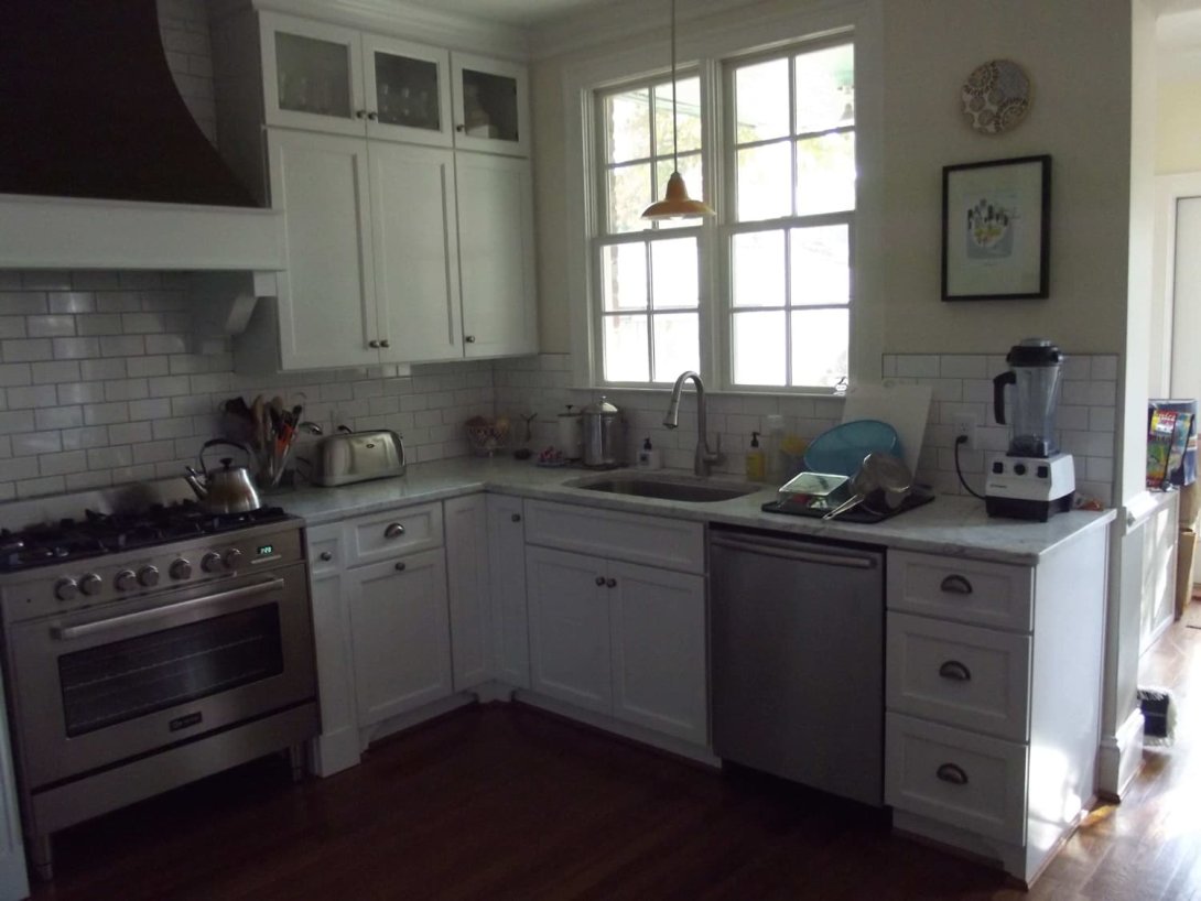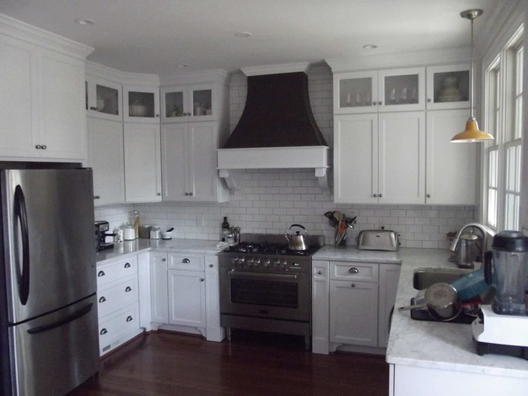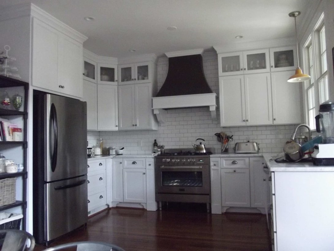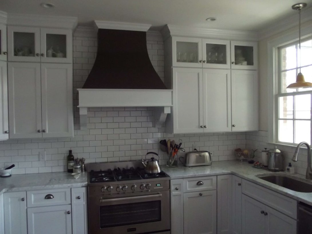 The focal point is a striking custom-built range hood with a deep, contrasting finish, creating a dramatic statement against the classic white subway tile backsplash. Luxurious marble countertops with subtle grey veining flow throughout the kitchen, providing a durable and sophisticated workspace. Professional-grade stainless steel appliances are seamlessly integrated, while the warm, dark hardwood floors ground the bright space. A combination of brushed nickel cup pulls and knobs on the cabinetry adds a final touch of polished detail to this bright and inviting kitchen.