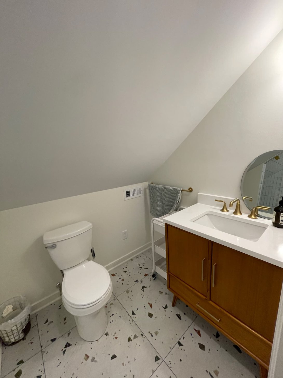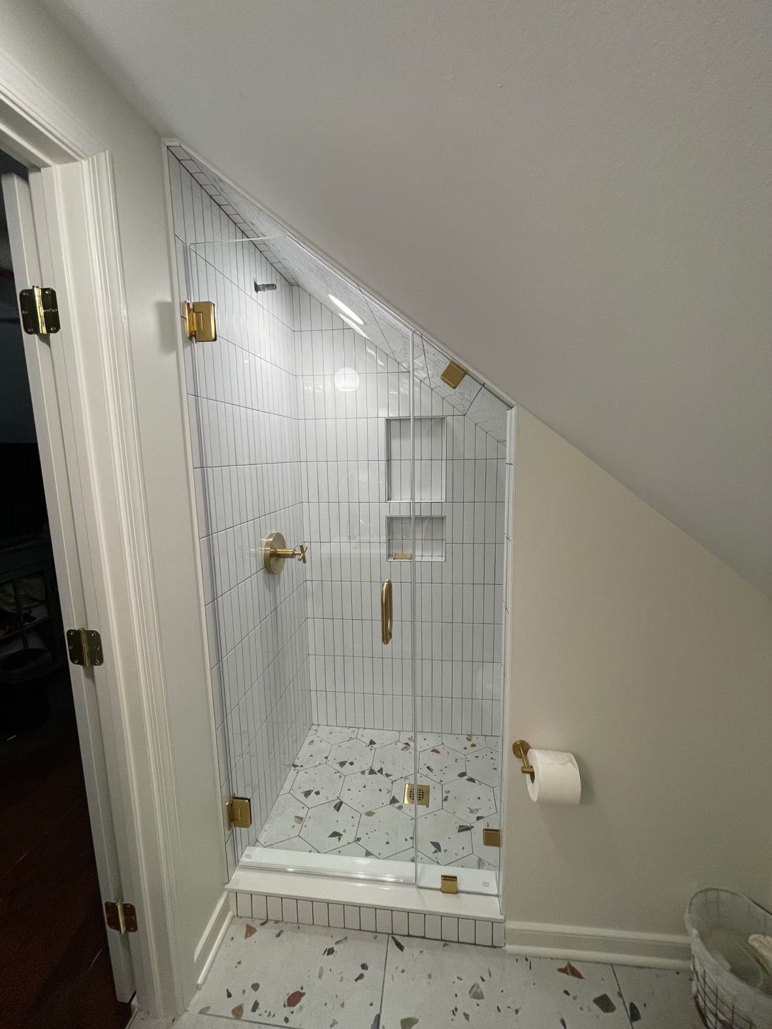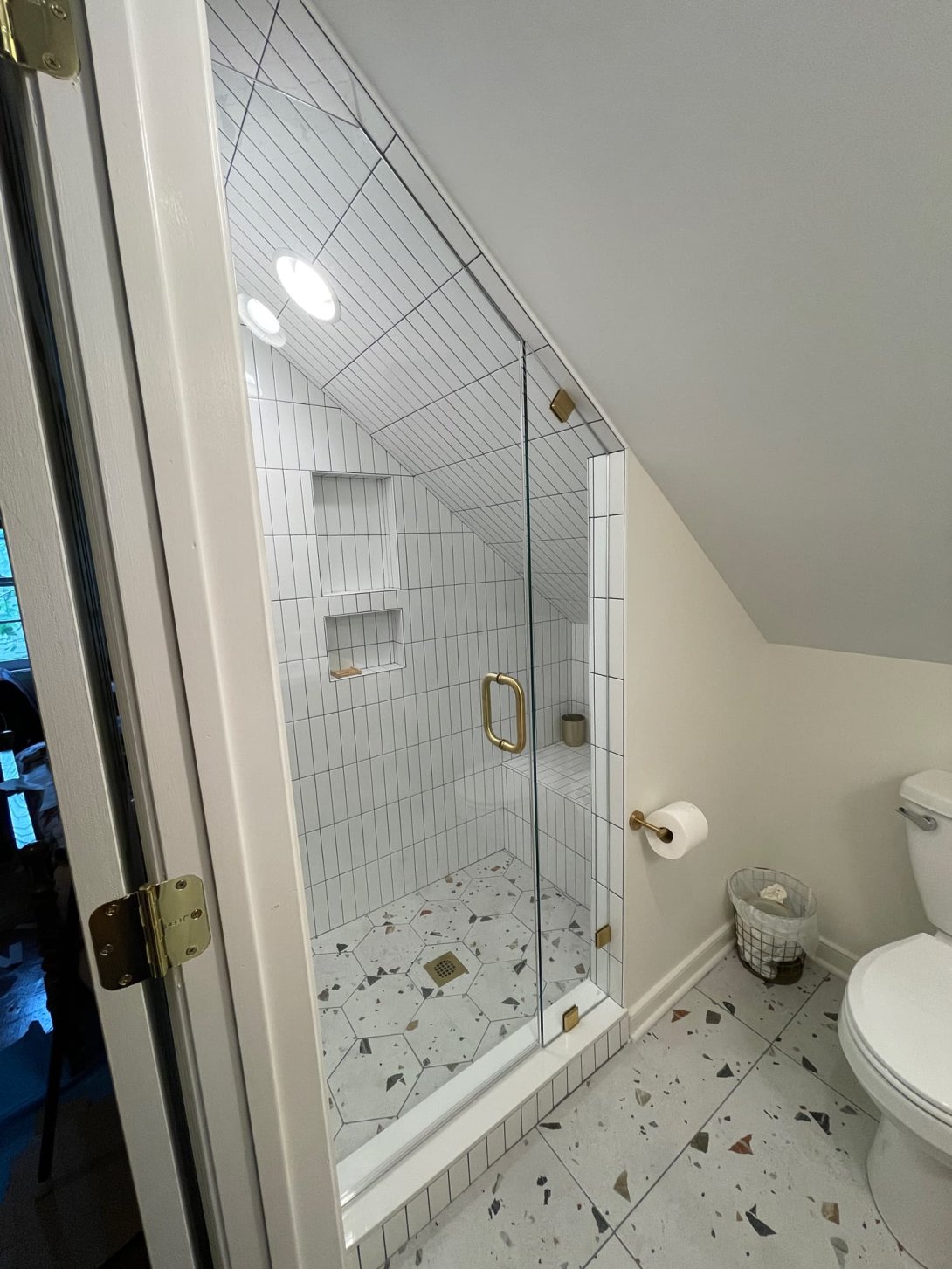 This compact bath renovation showcases clever design and a playful use of materials, transforming a smaller space into a bright, highly functional, and stylish sanctuary. The room features an eye-catching white terrazzo-style tile floor, speckled with warm-toned aggregates that add a contemporary, energetic feel. The most striking element is the custom-designed shower, ingeniously fitted into the sloped ceiling space. It boasts vertical white subway tiles with dark grout, creating a clean, modern aesthetic that draws the eye upward and visually expands the area. Integrated niches within the shower provide convenient storage, while a custom-cut glass enclosure with sleek gold hardware maximizes light and maintains an open feel.