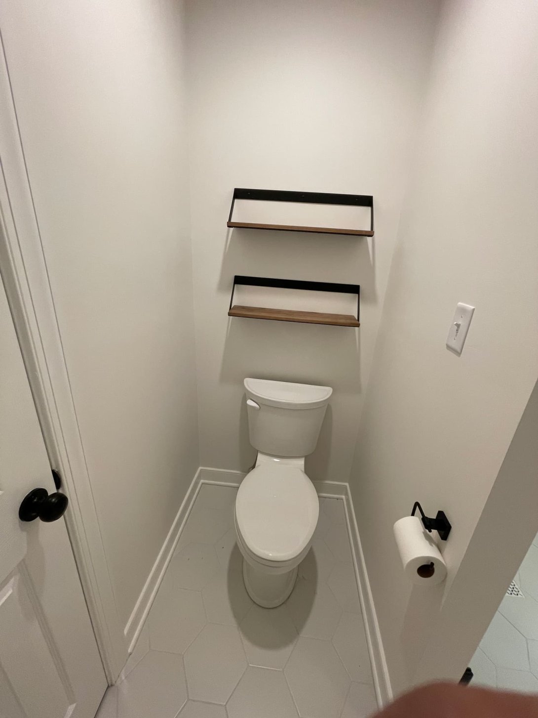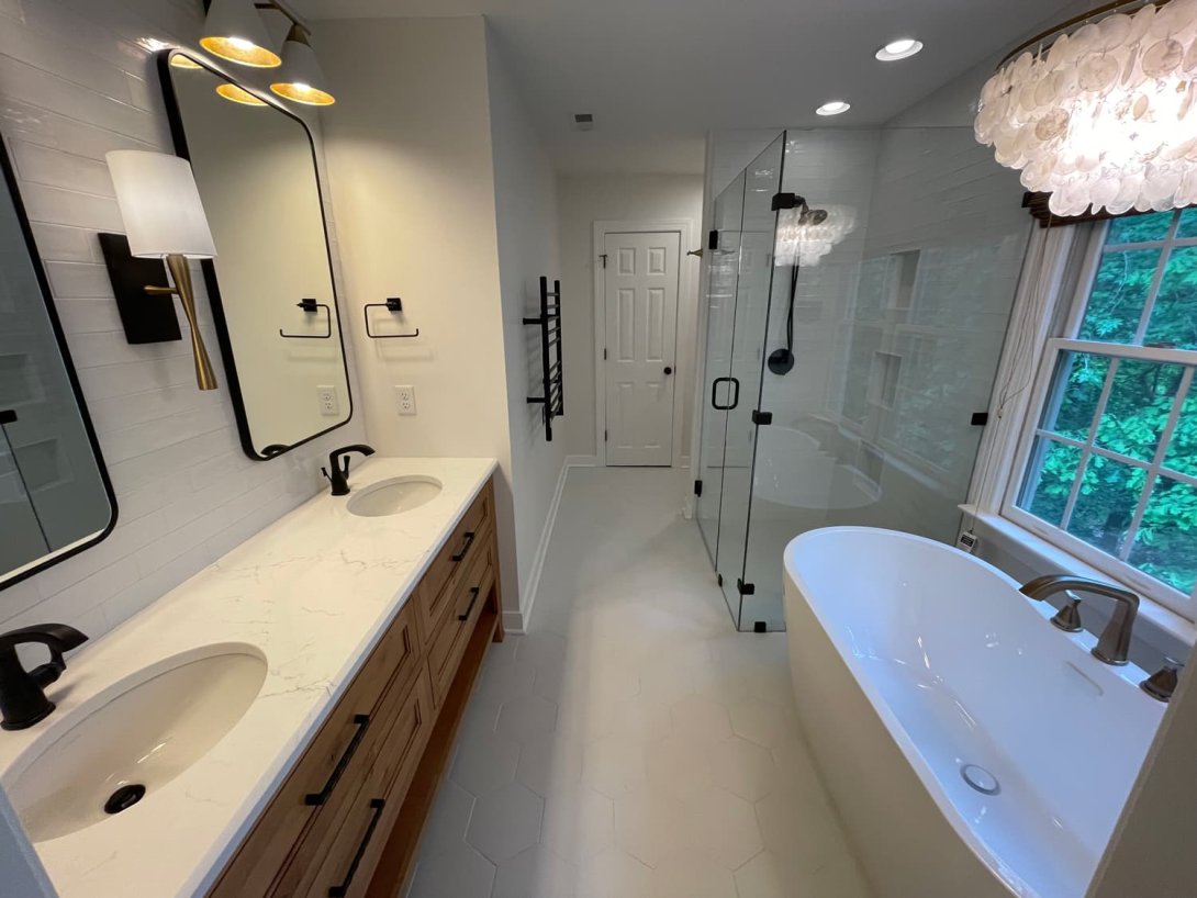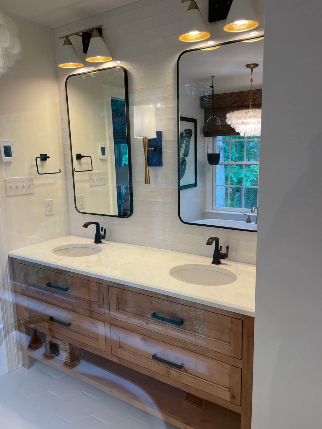 This designer bath remodel is a masterful fusion of contemporary style and timeless luxury, creating a space that is both visually stunning and highly functional. The floor is covered in large, modern, light gray hexagonal tiles, providing a subtle yet sophisticated geometric base for the room. A stunning double vanity with a warm, natural wood finish and sleek black hardware anchors the space. The vanity is topped with a clean white countertop and features a pair of sinks, each with elegant matte black faucets and framed by twin, black-edged mirrors. Sleek gold and black light fixtures above the mirrors add a touch of modern glam and warmth.