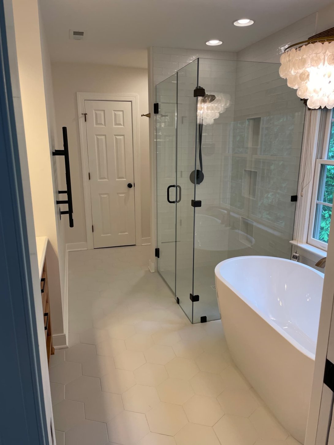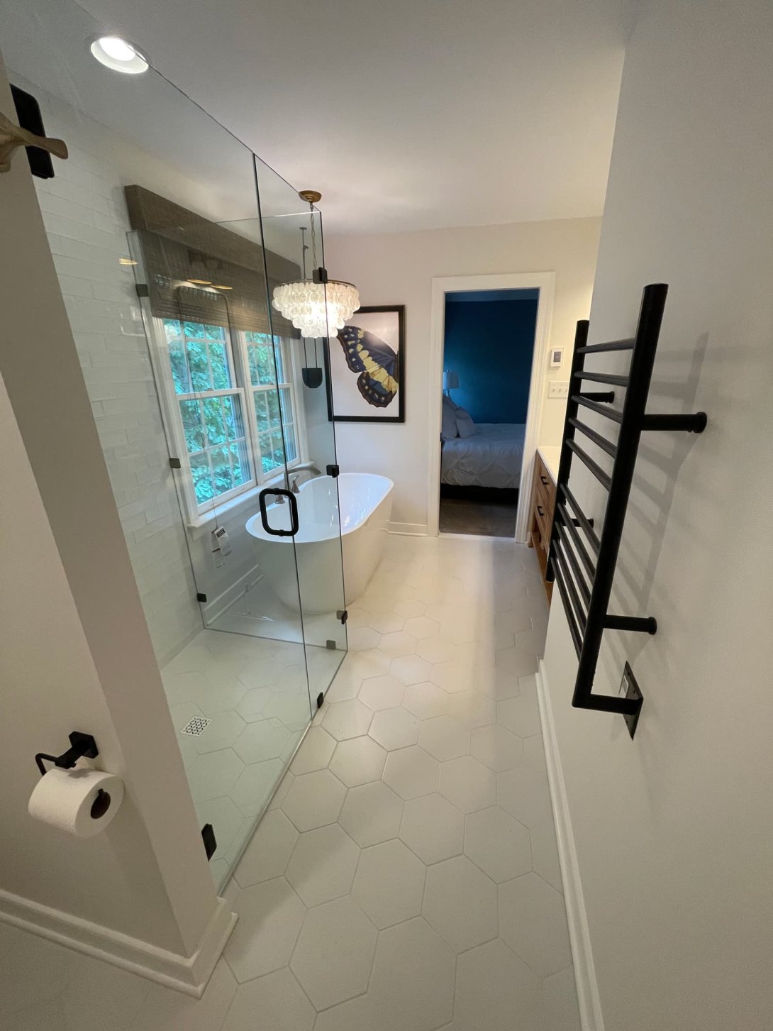 The adjacent wet room is a testament to minimalist design and luxurious comfort. It houses a freestanding sculptural bathtub and a spacious walk-in shower, all enclosed by a frameless glass wall that enhances the open and airy feel of the room. The shower walls are clad in pristine white subway tile, laid horizontally to create a clean, continuous line. Matte black fixtures, including a sleek towel warmer, provide a striking contrast and a cohesive design element throughout the space. A unique, decorative chandelier with opalescent shell accents hangs above the tub, adding an artistic, organic touch and a soft, ambient glow to this serene and stylish retreat.