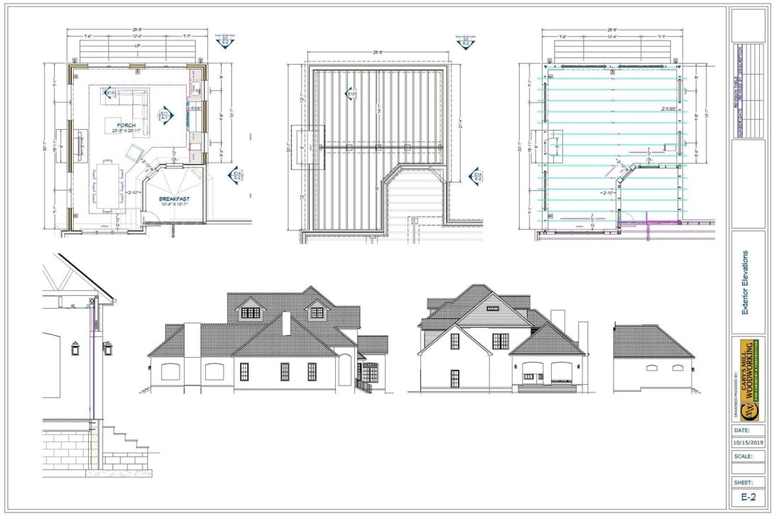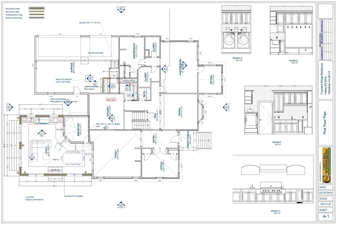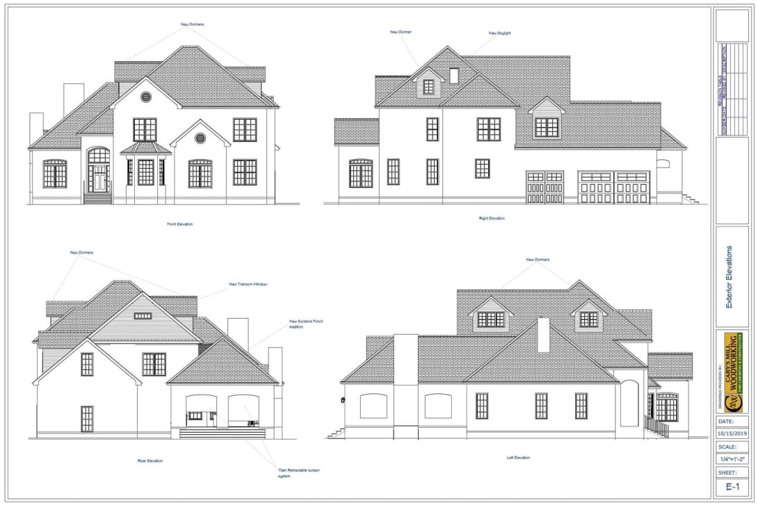 This comprehensive design for the Founders Bridge home showcases a large-scale renovation project aimed at modernizing and expanding a classic suburban residence. The provided blueprints detail a complete overhaul, with a focus on both interior functionality and exterior aesthetic. The exterior elevations reveal an updated facade with new dormers and a new screened-in porch addition, which adds a significant amount of living space and enhances the home's connection to the outdoors. The plans also include a new skylight and transome window, designed to bring more natural light into the home's interior.