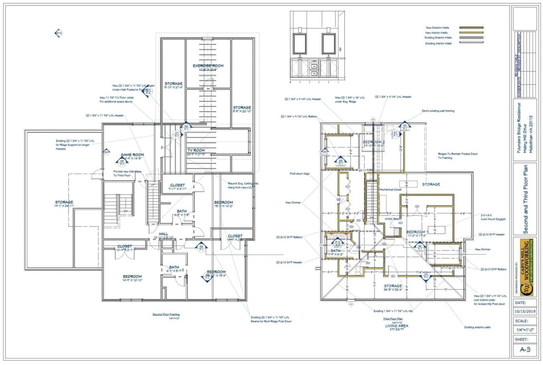 The interior floor plans are a testament to strategic spatial redesign. The first-floor plan indicates the addition of a new screened porch and a breakfast nook, creating a more casual and inviting dining space. It also outlines the renovation of the master bath, laundry room, and kitchen, with detailed cabinet elevations provided to showcase a modern, clean-lined design. The second and third-floor plans illustrate a reconfiguration of the space to include new bedrooms, baths, and a large game room, maximizing the home's livable square footage. This project is a comprehensive example of how a well-thought-out design can transform a traditional home to meet contemporary needs, adding both value and style.