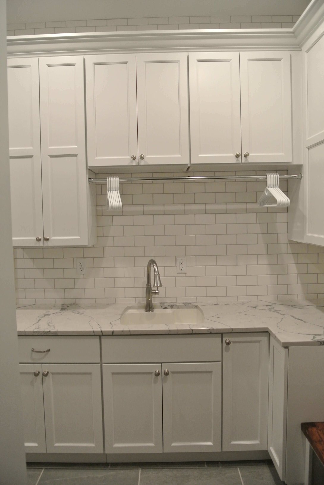 A key feature of the new suite is a bright and highly functional laundry room, complete with crisp white cabinetry, marble-look countertops, and a convenient built-in clothes-hanging rod. This addition masterfully creates a quiet, self-contained retreat with high-end finishes and thoughtful, practical amenities.