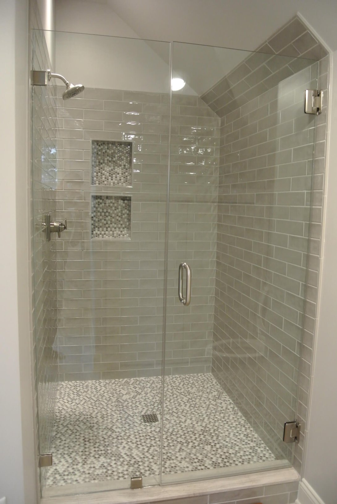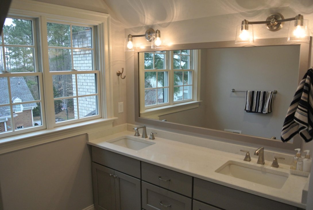 This complex third-floor addition transformed a raw, unfinished attic into a complete and luxurious private living suite. By expertly building within the existing roofline, we added significant, valuable square footage to the home without altering its footprint. The new floor includes a spacious and beautifully appointed full bathroom. This modern, spa-like space features a sleek, gray double-sink vanity with a quartz countertop and a custom walk-in shower with glossy subway tile and decorative mosaic accents.