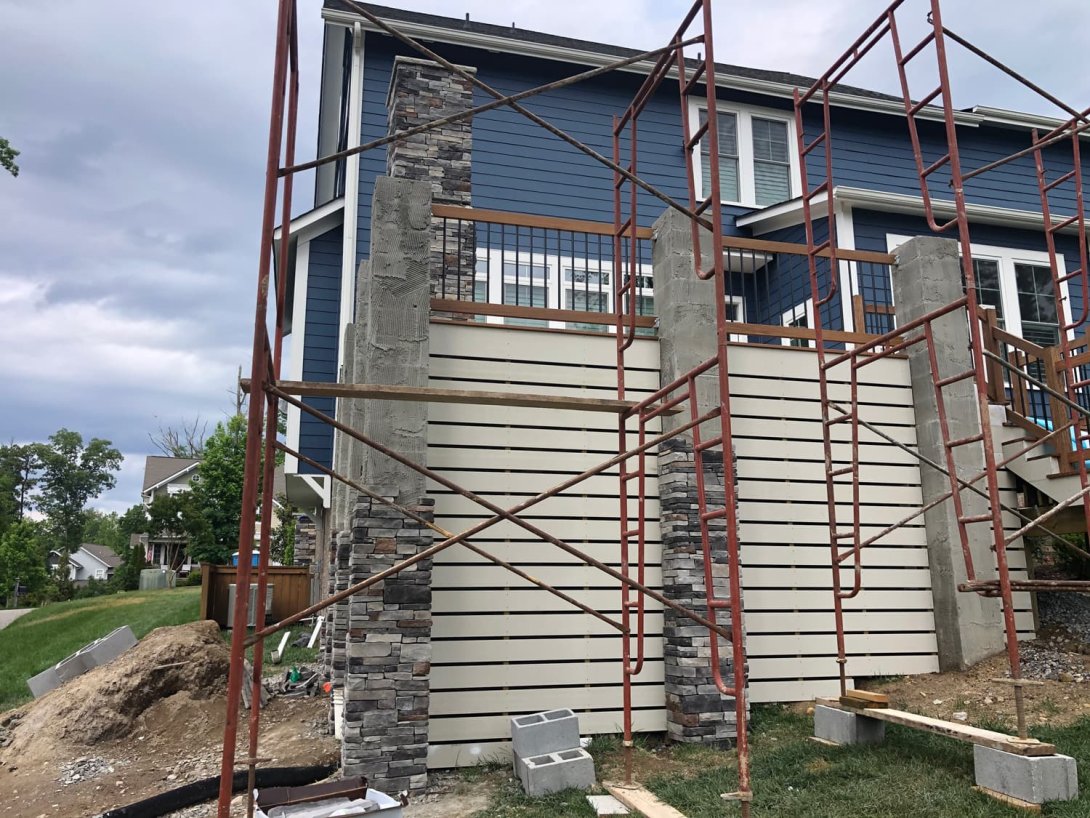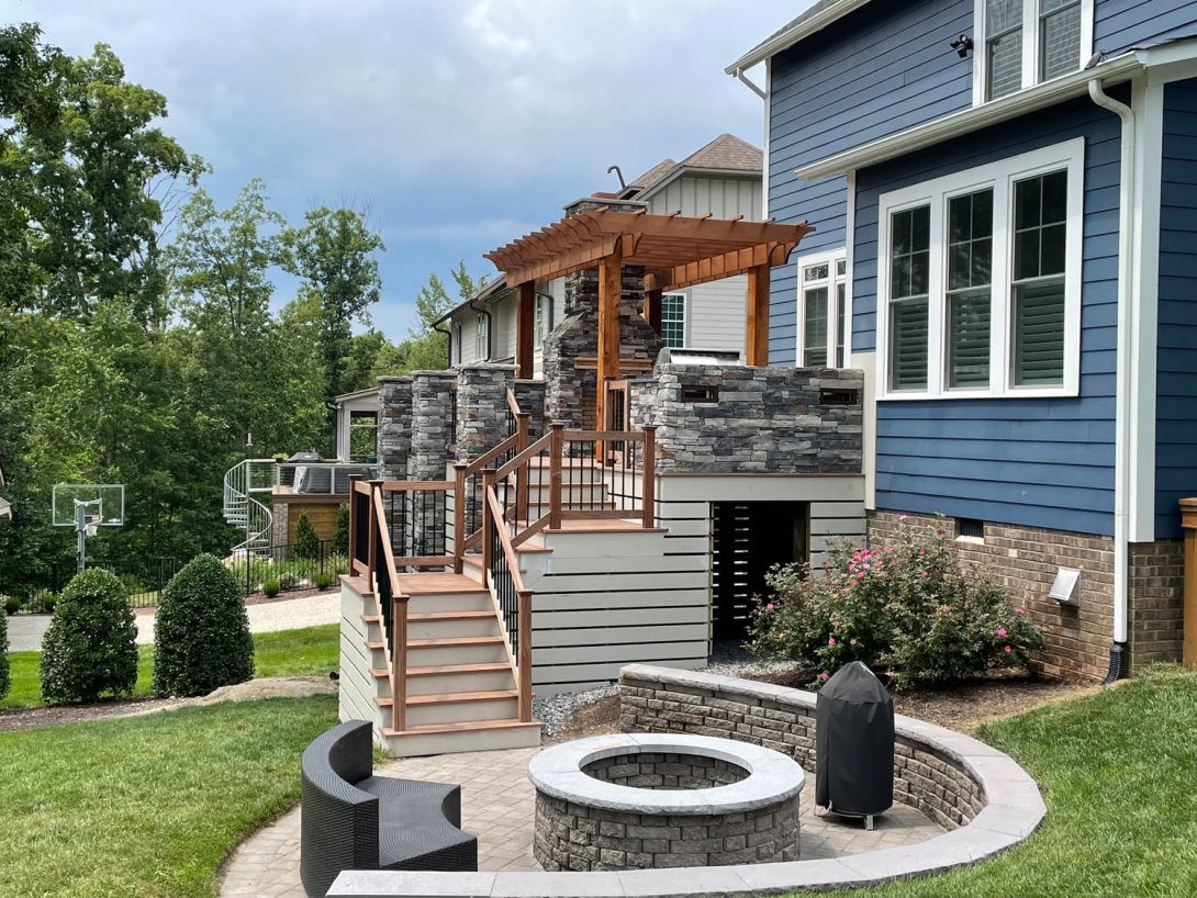 Massive columns and a kitchen base clad in earthy, multi-toned stacked stone anchor the space with a sense of rustic elegance. Below the deck, a modern horizontal slat wall stylishly conceals a large storage area. The living space flows seamlessly to a lower paver patio, where a custom stone fire pit and matching seating wall create an inviting gathering spot. This project masterfully integrates distinct zones into one cohesive and luxurious outdoor oasis.