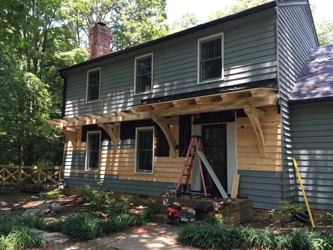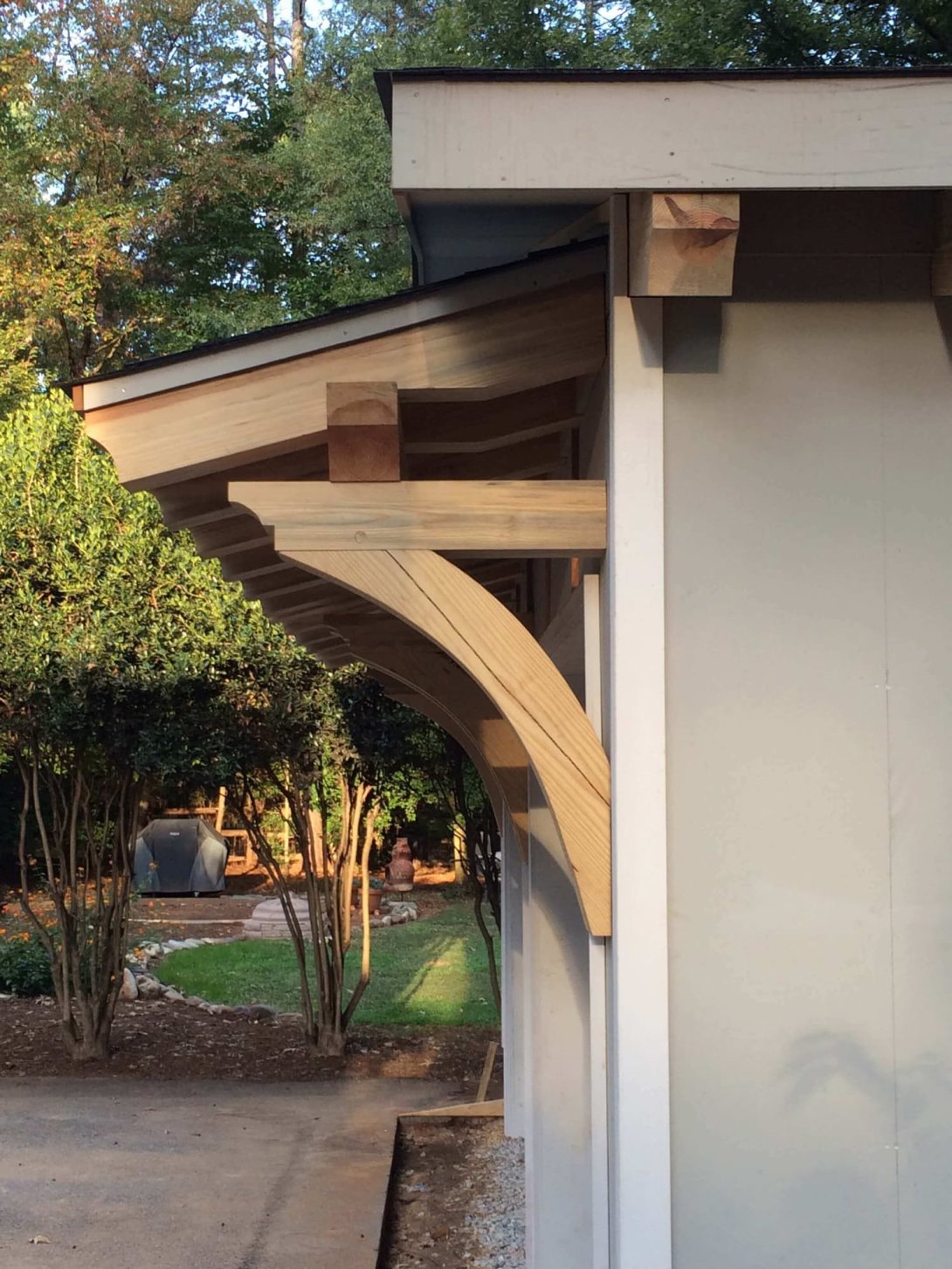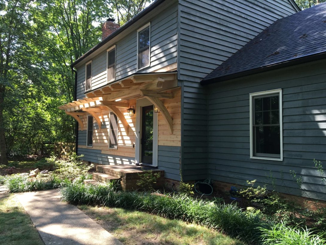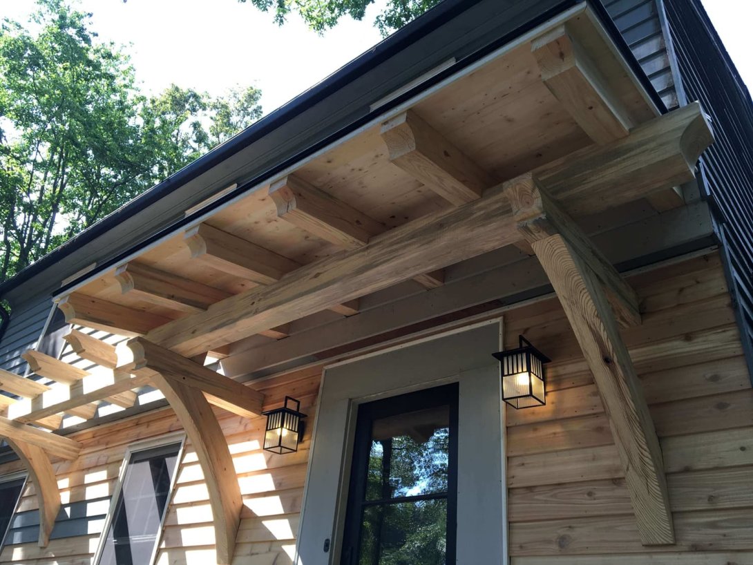 This same design language was then masterfully applied to an existing home, transforming a flat facade with the addition of a handsome new front portico. This smaller awning features the same custom-milled brackets and exposed wood structure, adding much-needed dimension and a powerful focal point to the entryway. Both projects demonstrate a mastery of natural wood craftsmanship, turning functional structures into works of architectural art with a timeless, handcrafted and substantial feel.