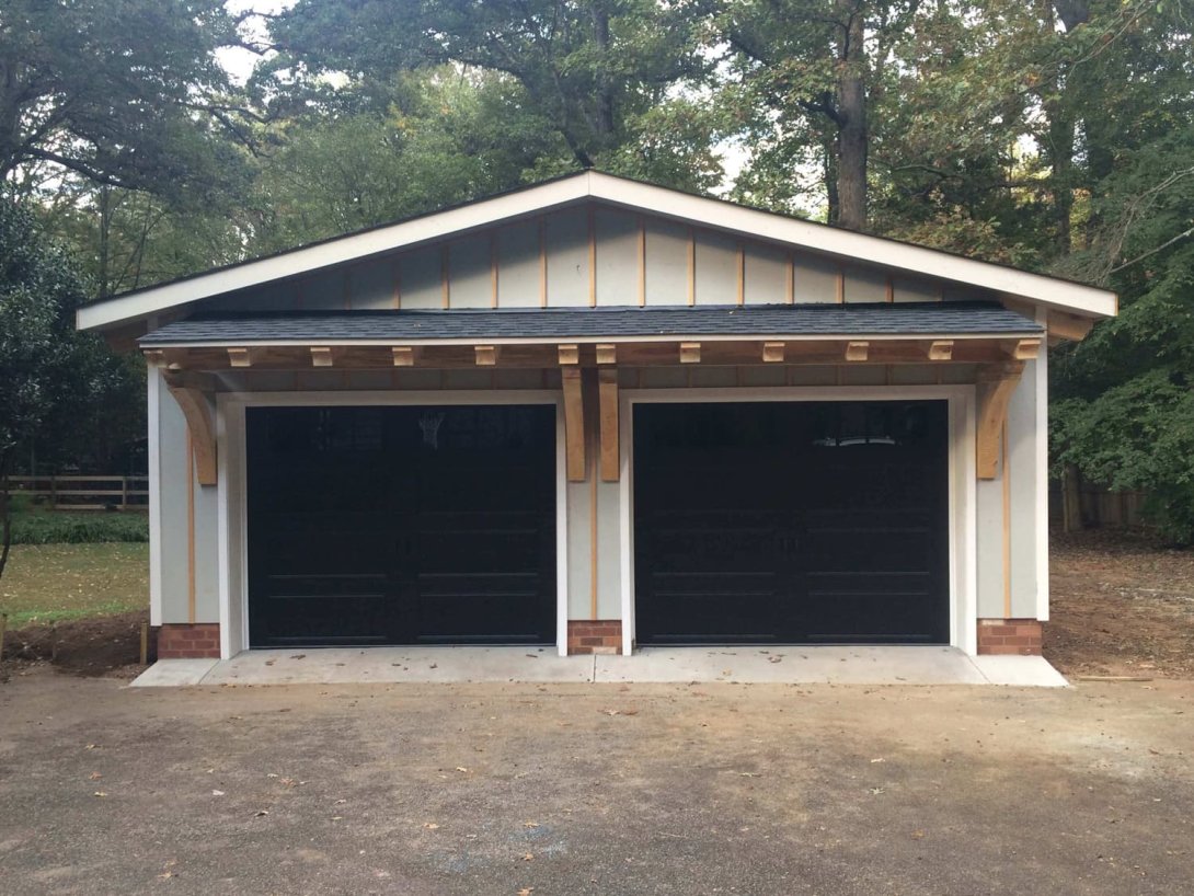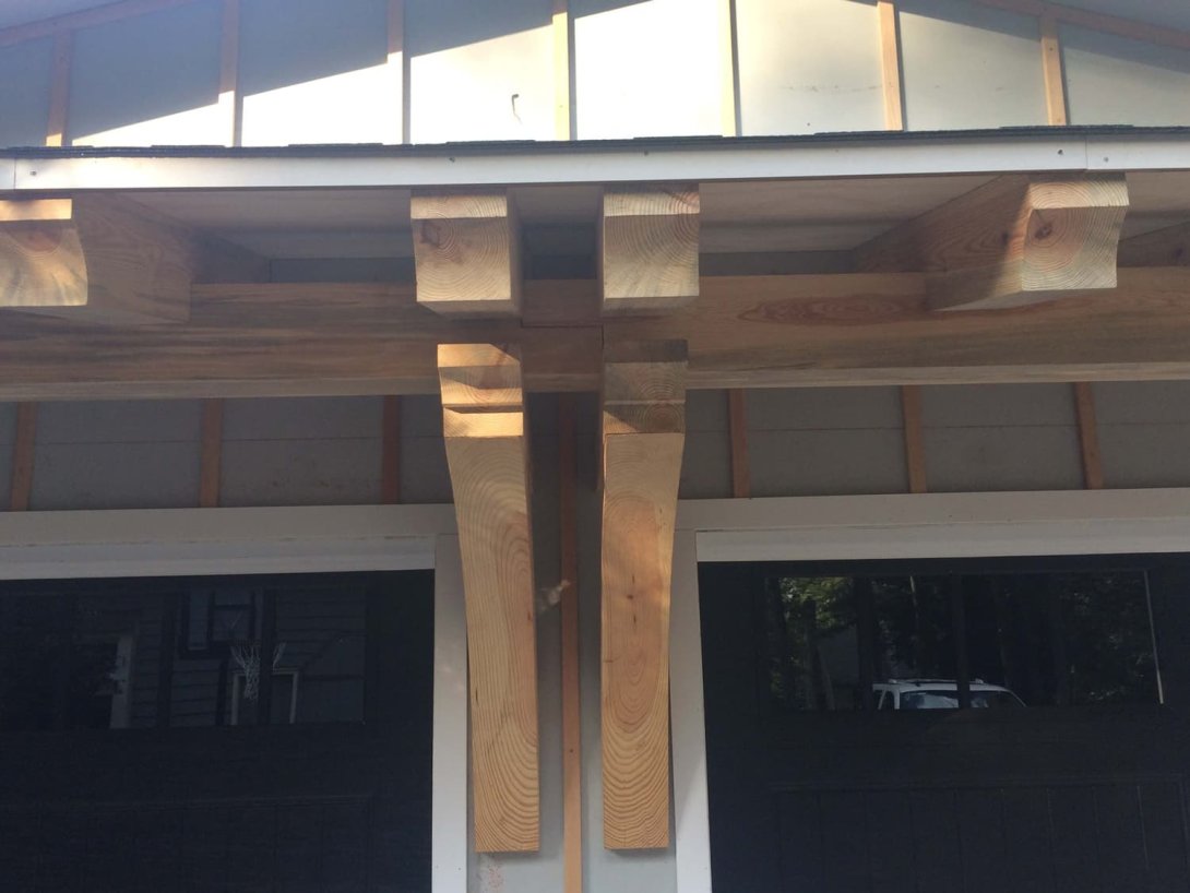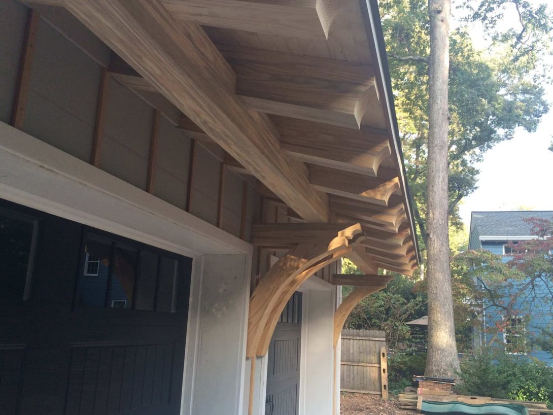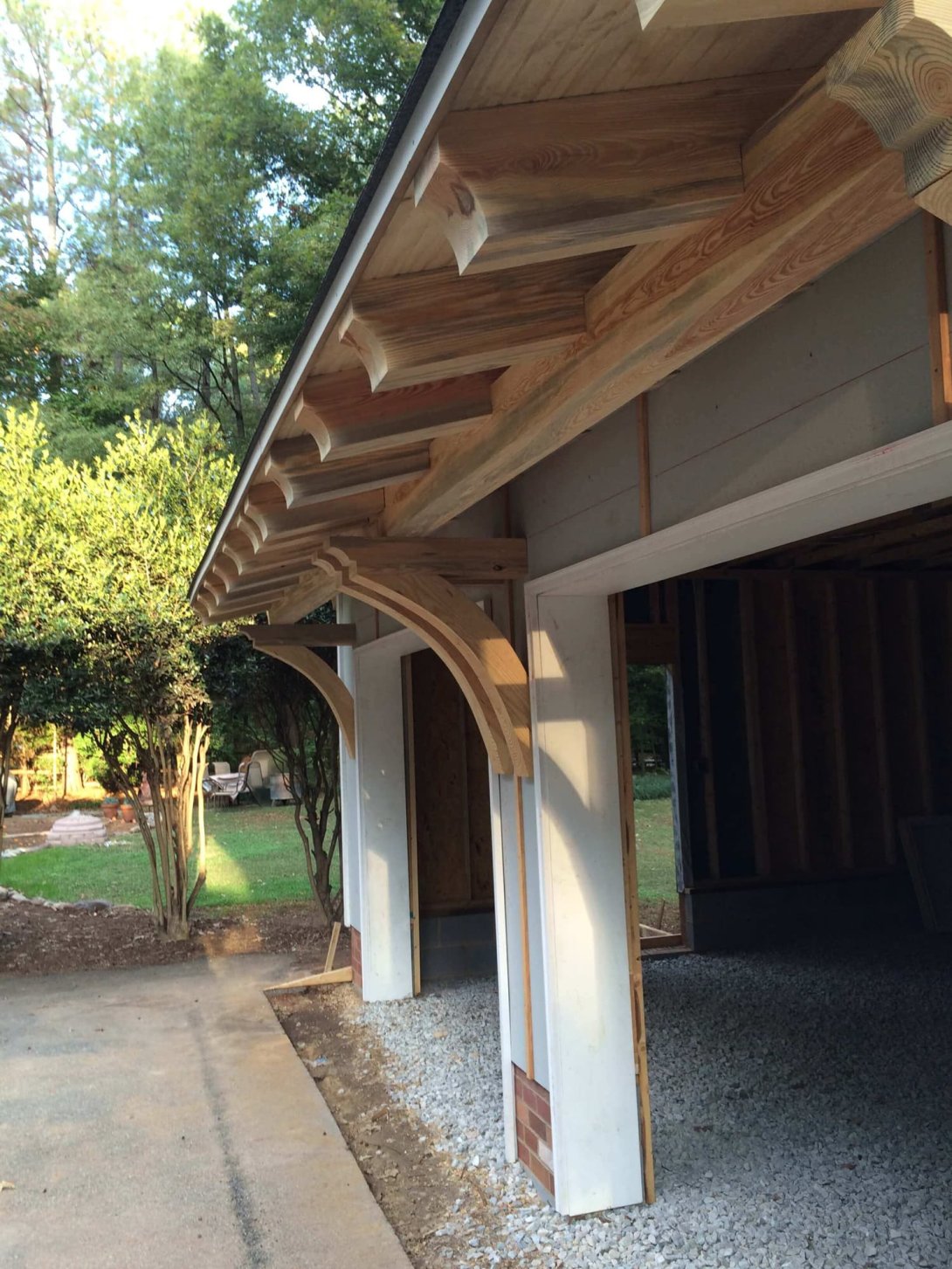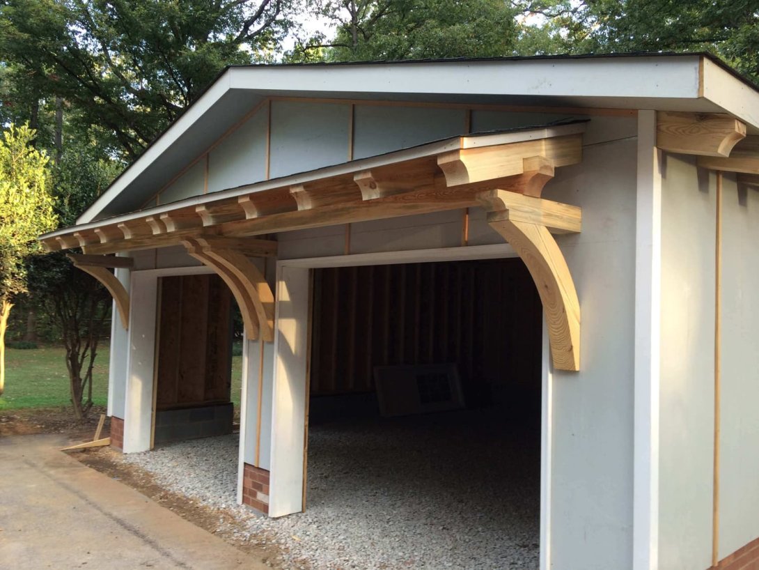 This collection of projects is a celebration of the Arts and Crafts style, showcasing how custom heavy timber details can bring profound architectural character to any structure. The first project is a new two-car detached garage, defined by its striking timber awning complete with large, gracefully curved brackets and decorative exposed rafter tails.