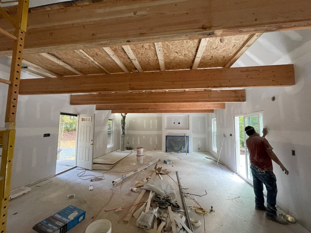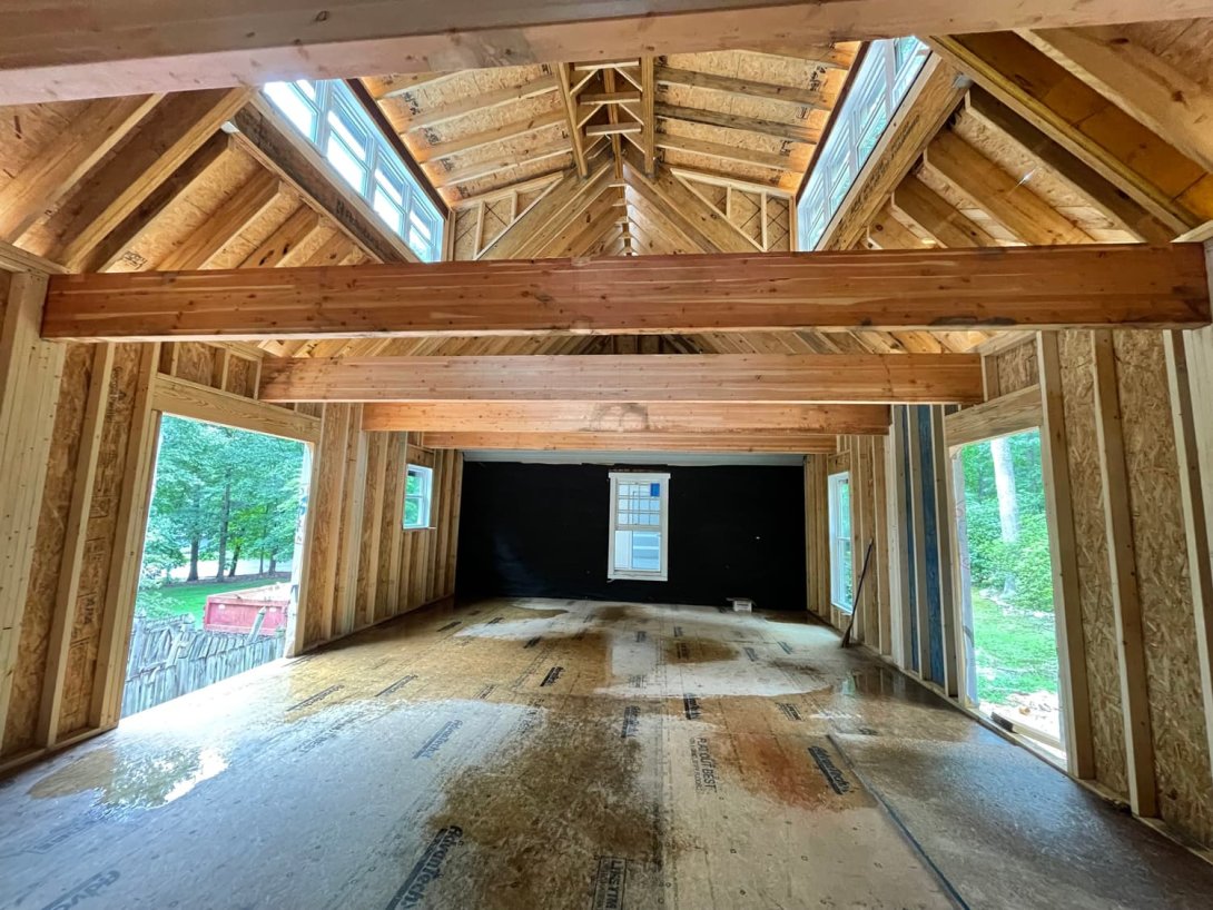 Inside, the main living area is a stunning, light-filled space defined by a dramatic vaulted ceiling that soars to the roof peak. Large, exposed structural beams span the room, adding a touch of rustic yet modern character. The design makes clever use of the vertical volume with a functional loft area for sleeping or storage. High clerestory windows flood the space with natural light, while a planned fireplace will provide a cozy focal point, completing this beautiful, self-contained home for comfortable multi-generational living.