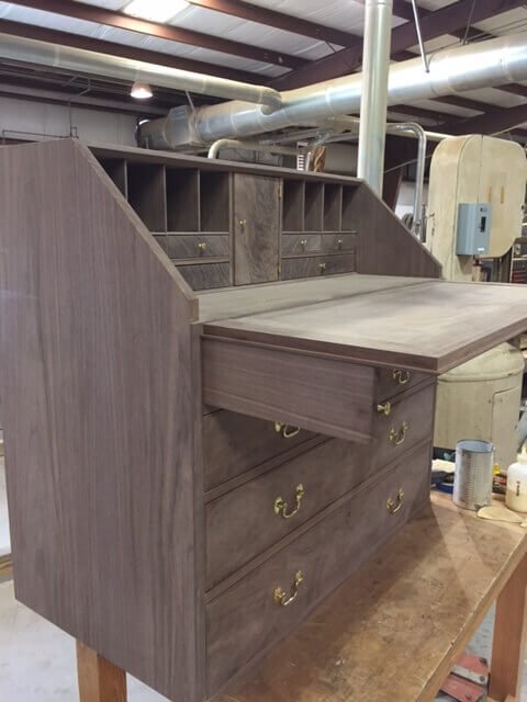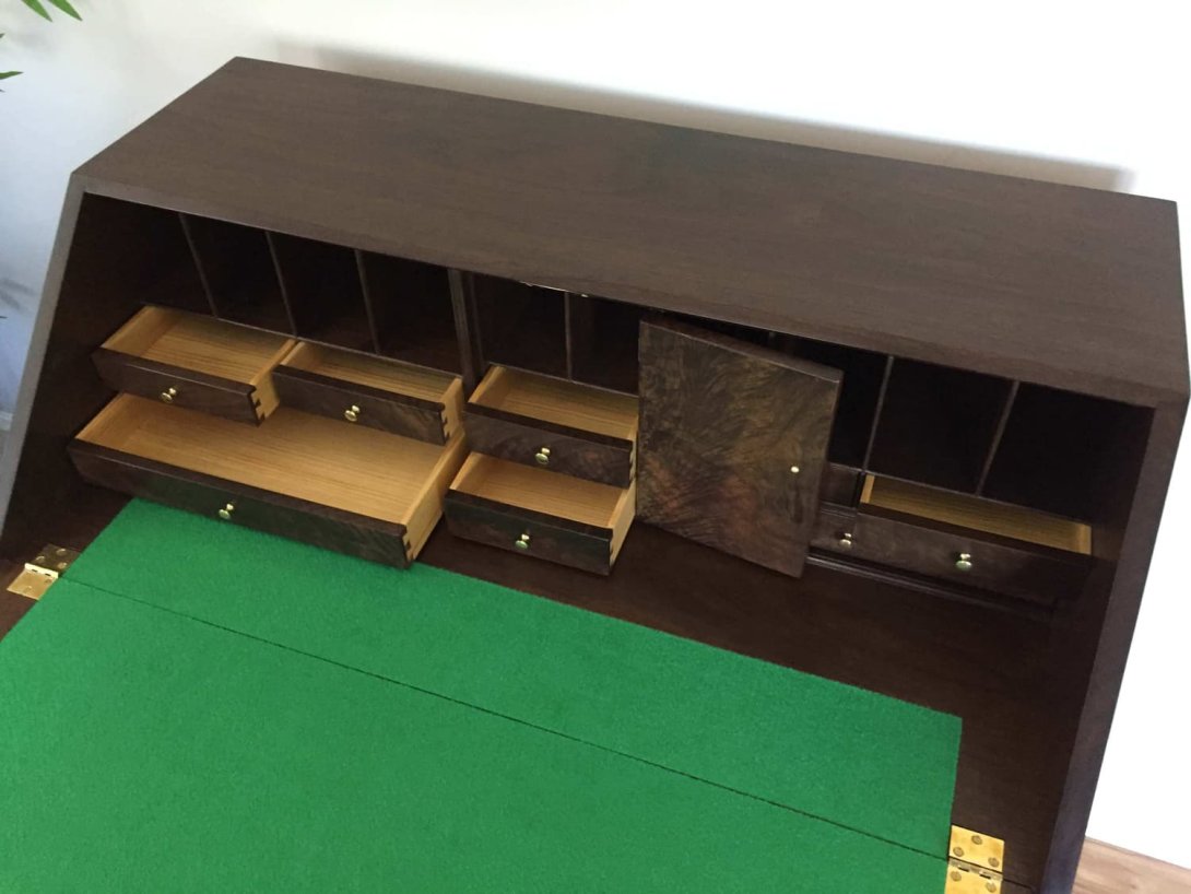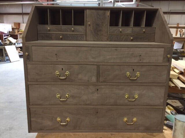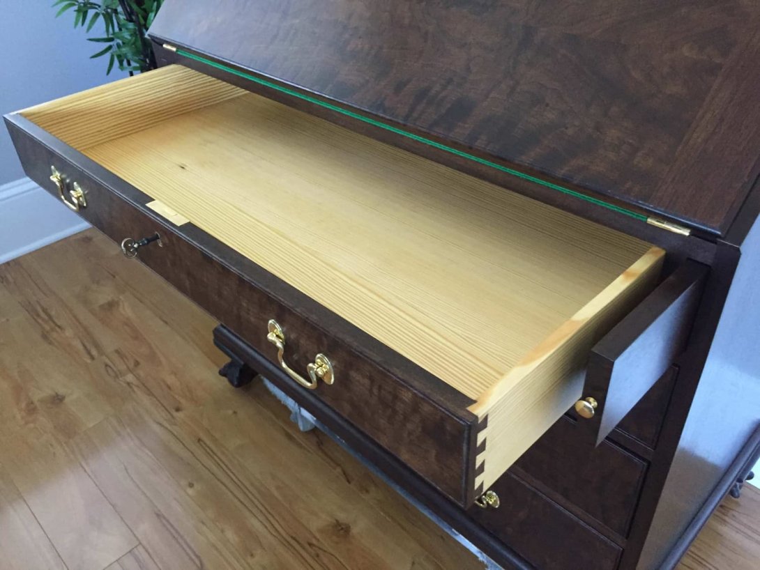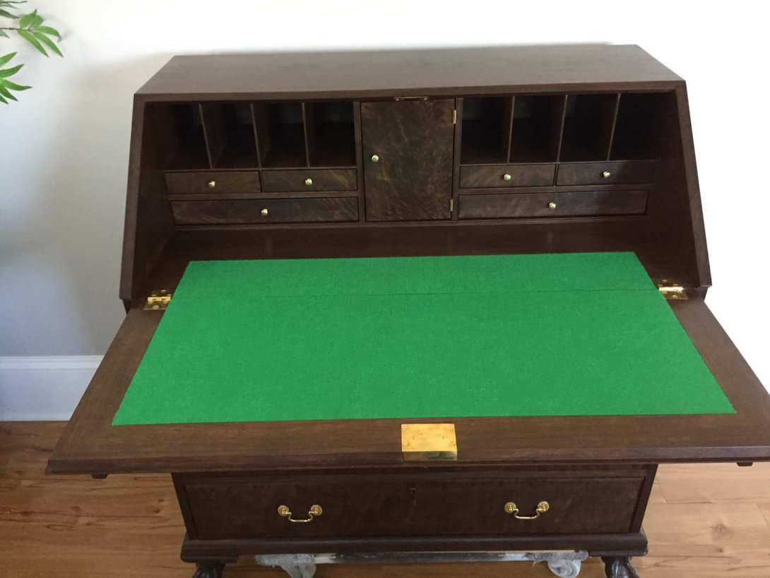 This project is a stunning reproduction of a classic 18th-century slant-front desk, meticulously crafted using time-honored woodworking techniques. The exterior is fashioned from rich, solid walnut, celebrated for its beautiful grain and deep, warm finish. Authenticity shines in every detail, from the period-perfect brass bail pulls and locking drawers to the traditional green felt writing surface.