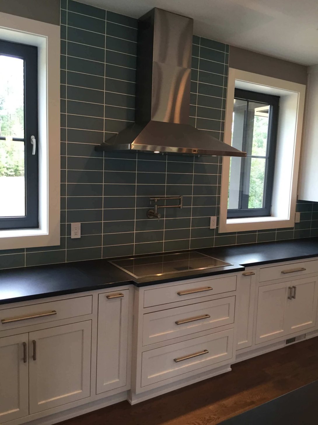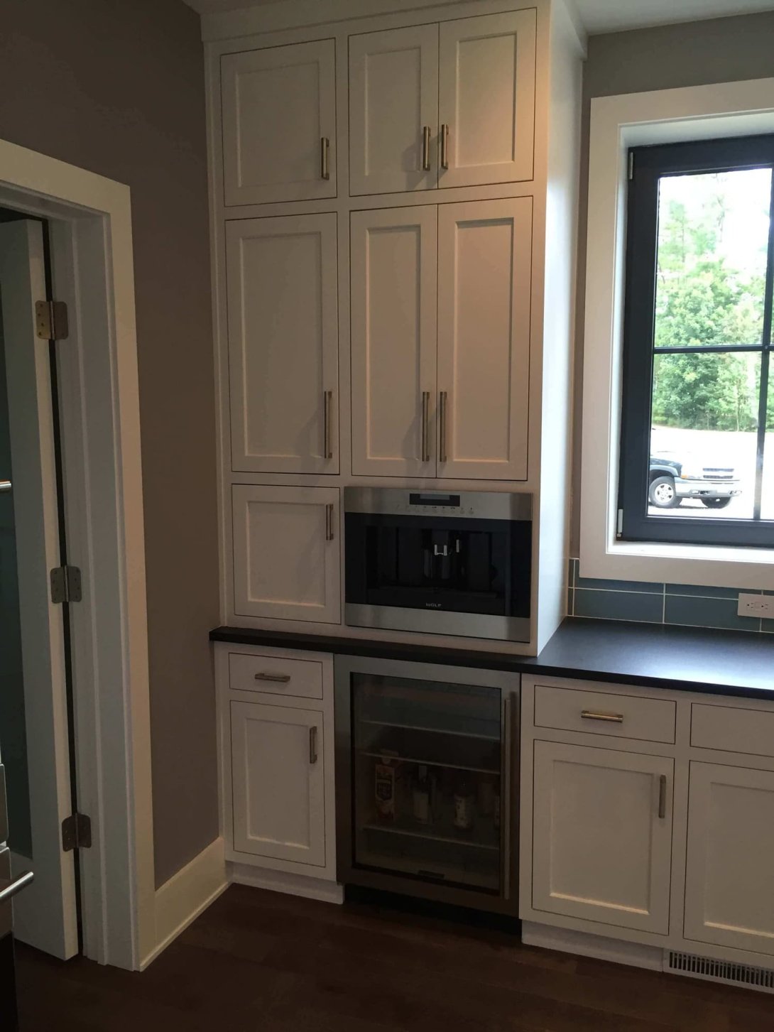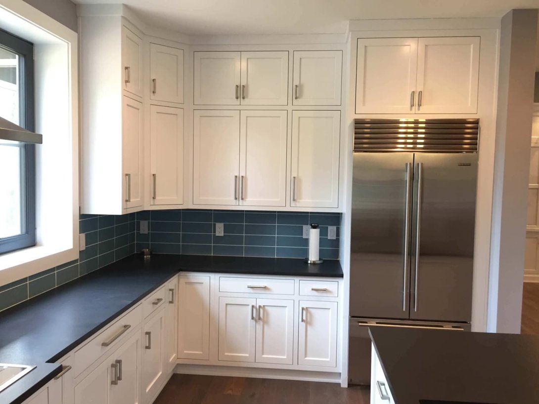 This kitchen remodel exemplifies modern elegance and functional design, transforming the heart of the home into a bright and inviting space. The kitchen features custom white Shaker-style cabinetry that extends to the ceiling, offering abundant storage and a seamless, clean-lined look. Rich black countertops provide an eye-catching contrast, while a stunning teal glass tile backsplash adds a pop of color and contemporary flair. Premium stainless steel appliances, including a built-in double oven, spacious refrigerator, integrated coffee system, and beverage fridge, elevate both style and functionality.