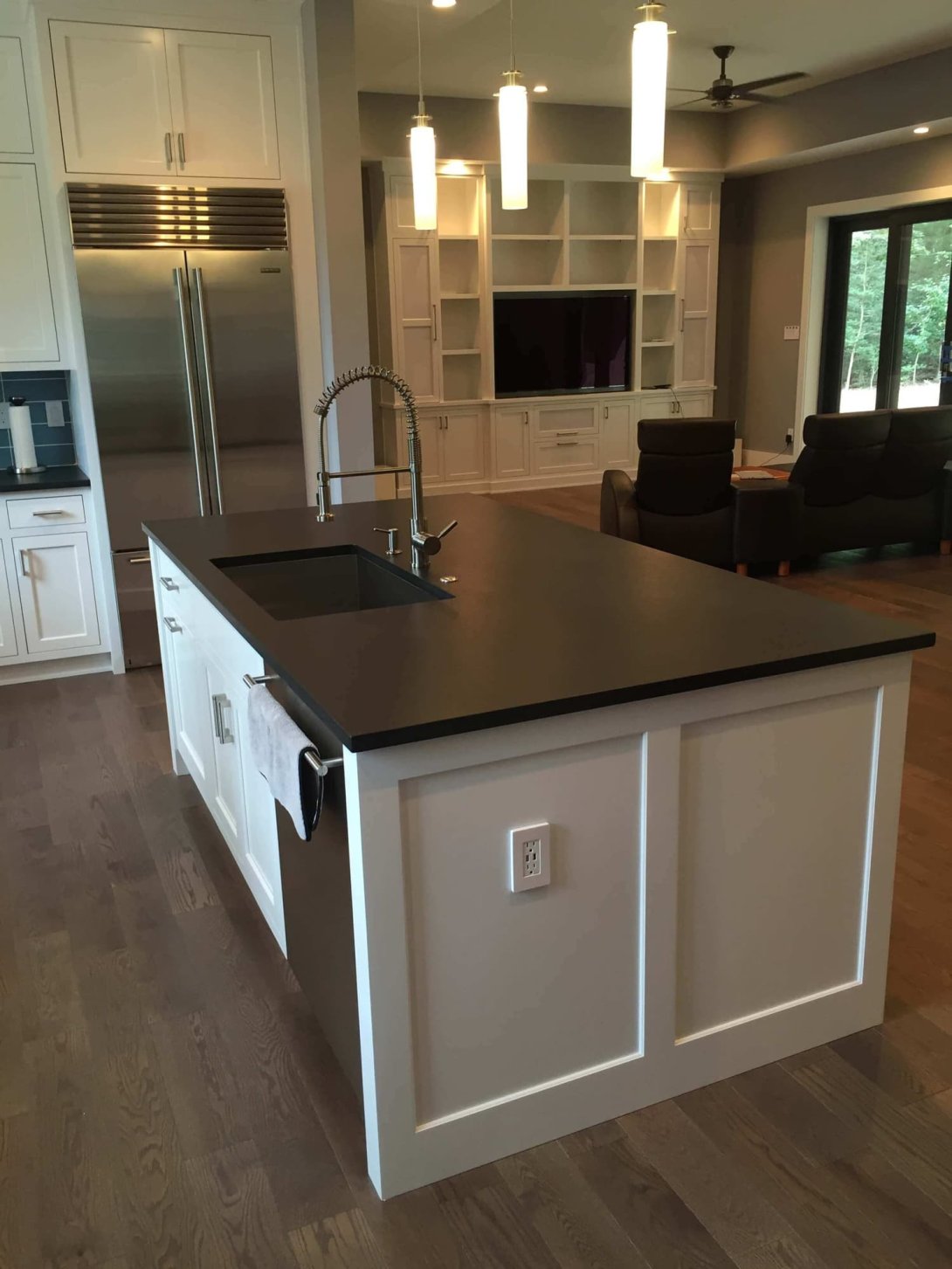 A generous central island anchors the open layout, topped in matching black and outfitted with a deep under-mount sink, high-end fixtures, and seating space for gathering or casual dining. Modern pendant lighting and wide-plank wood floors contribute warmth and sophistication, while thoughtful details—like soft-close drawers, brushed metal hardware, and ample work surfaces—make the kitchen as practical as it is beautiful. Flowing naturally into the adjacent living space with custom built-in media cabinetry, Tran’s remodeled kitchen is perfectly suited for everyday living and ideal for entertaining.