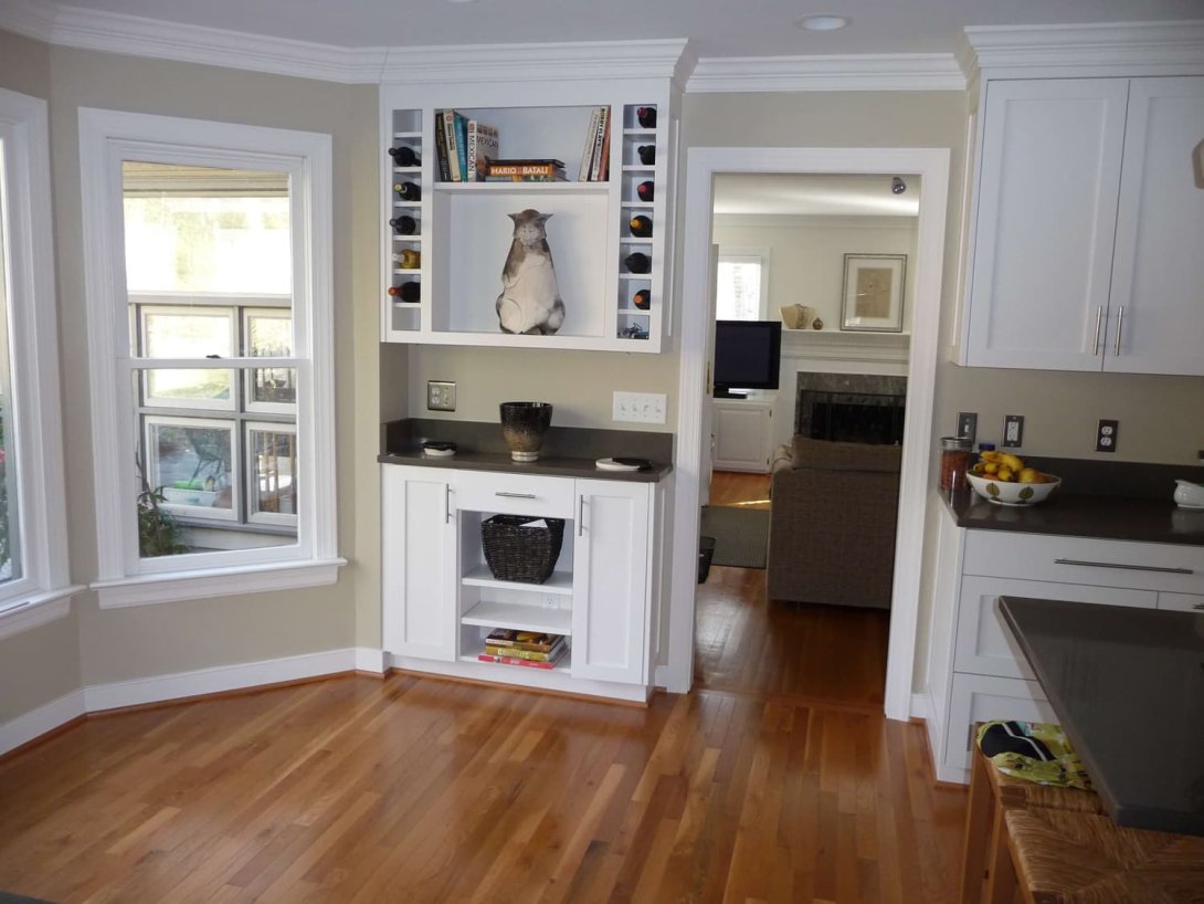 A central island provides both an efficient prep area and a casual spot for gathering, thoughtfully equipped with deep drawers and convenient seating. Natural light streams through multiple windows, illuminating the open layout and highlighting the gleaming wood floors that extend into adjacent living spaces. Integrated display shelving and wine storage add personality and practicality, making this kitchen both a welcoming family hub and an entertainer’s dream