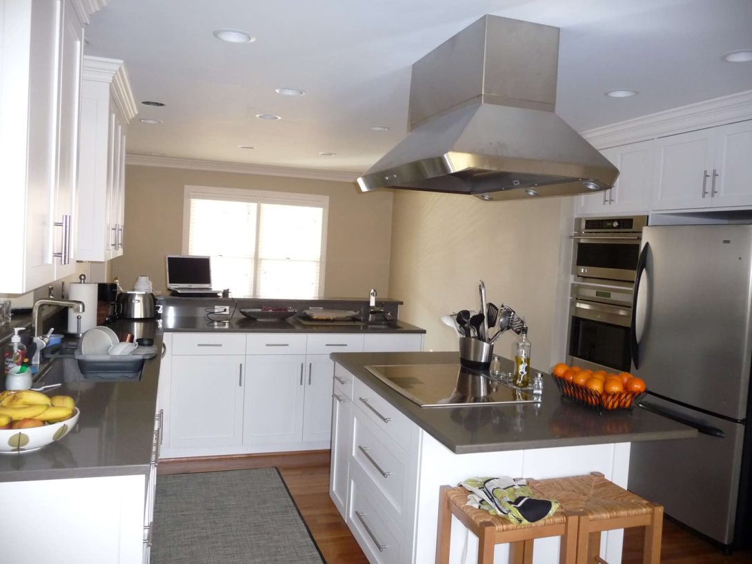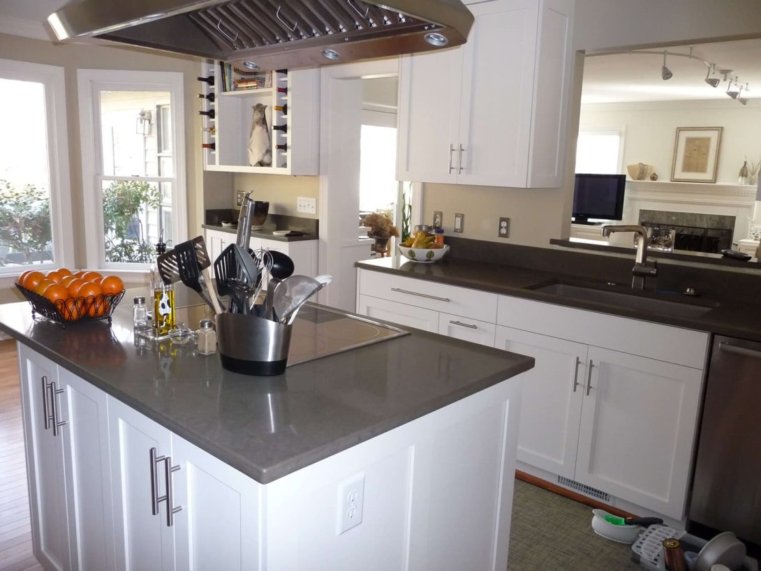 This kitchen remodel presents a bright and functional culinary space with a classic yet contemporary flair. Crisp white cabinetry with clean Shaker lines anchors the design, complemented by sleek, understated hardware for a modern touch. Durable grey countertops offer ample workspace and pair elegantly with the stainless steel appliances, including a professional-grade vent hood and double oven setup for maximum cooking versatility.