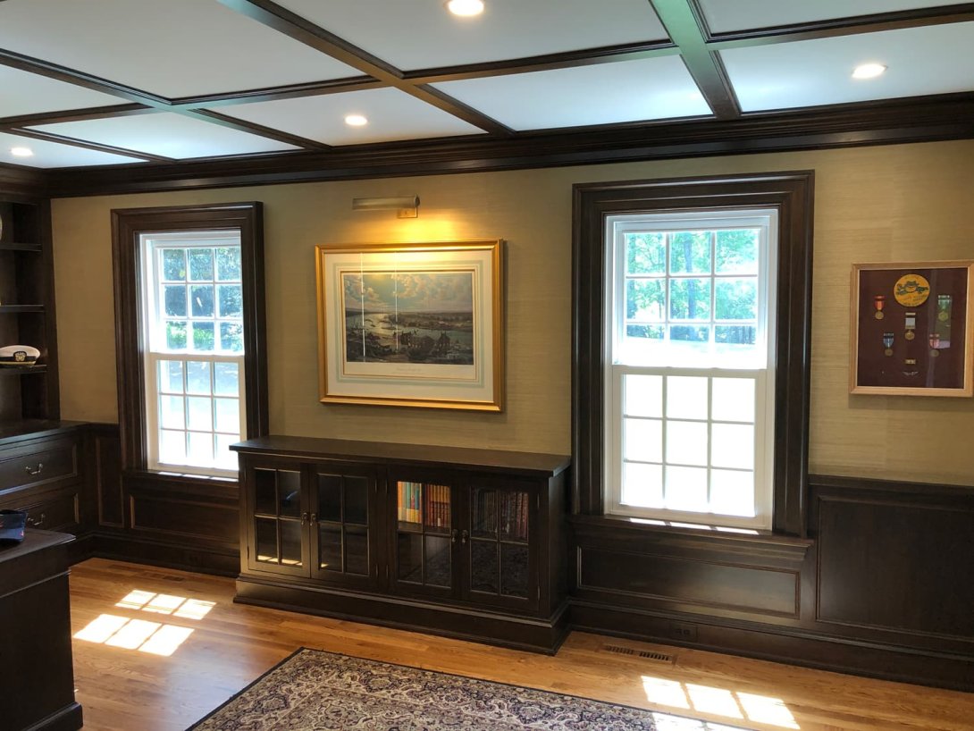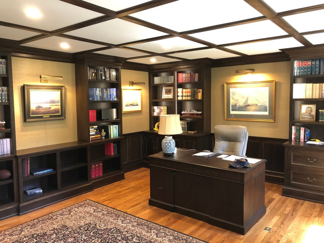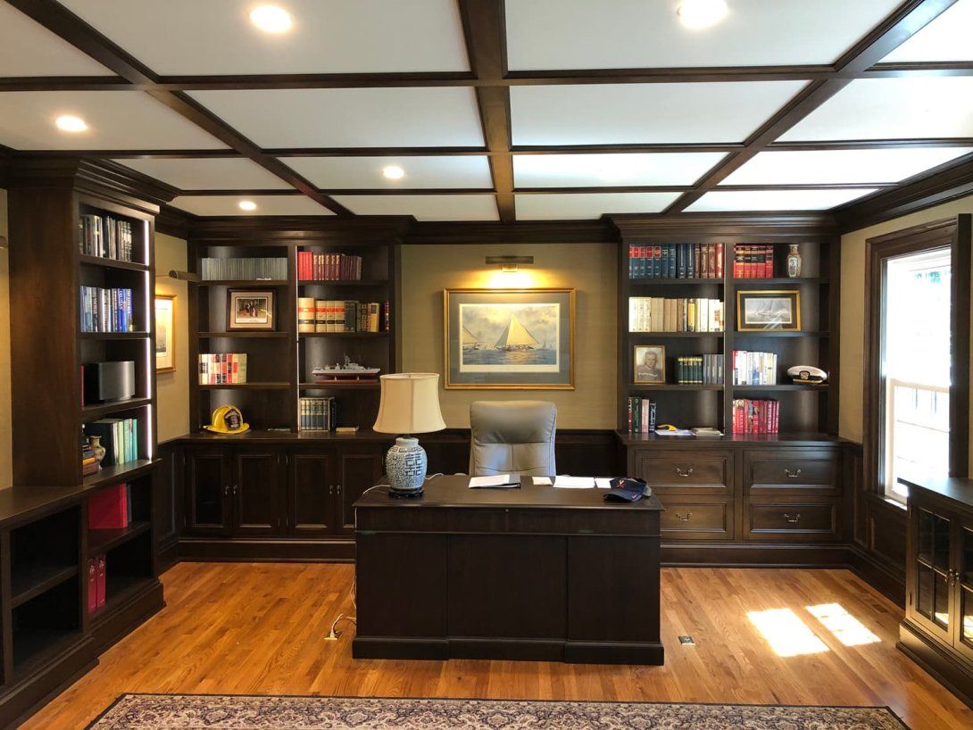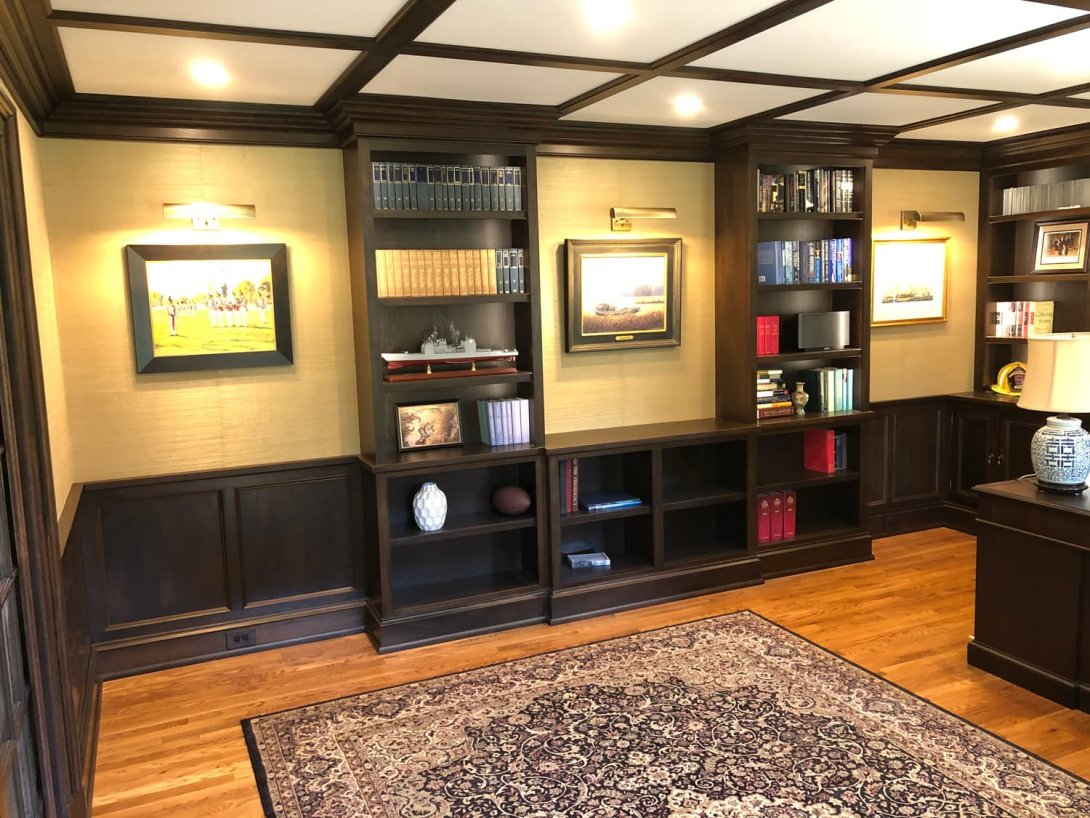 Step into a sanctuary of timeless elegance with this custom-designed home library, a testament to our dedication to exquisite craftsmanship. We meticulously crafted rich, dark-stained woodwork that seamlessly envelops the space, from the floor-to-ceiling bookshelves and elegant wainscoting to the stately coffered ceiling that draws the eye upward.