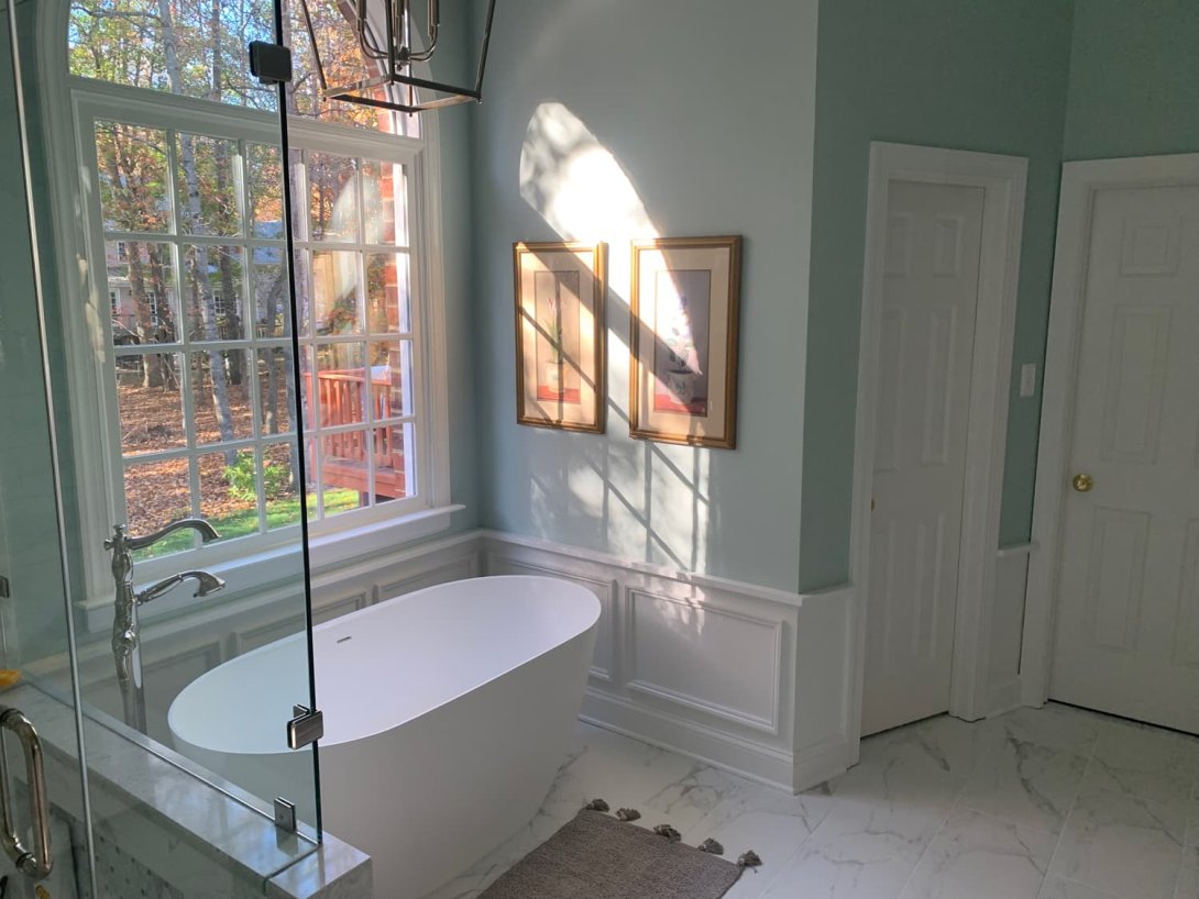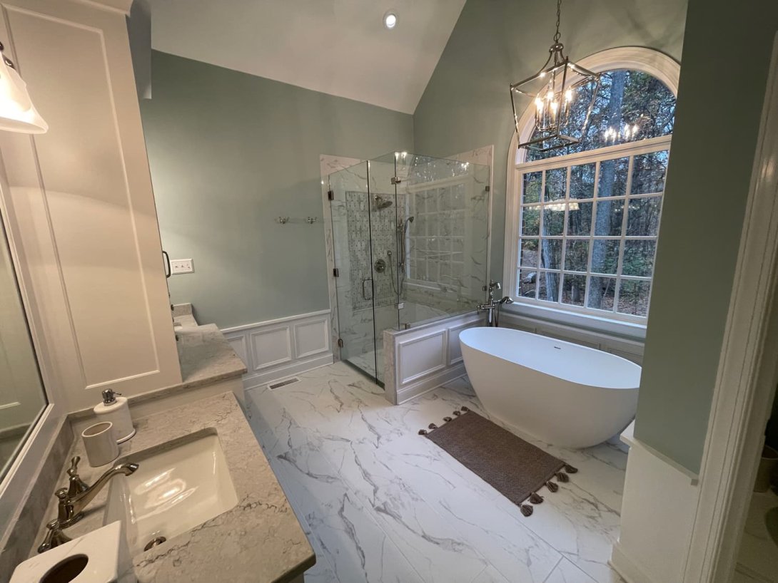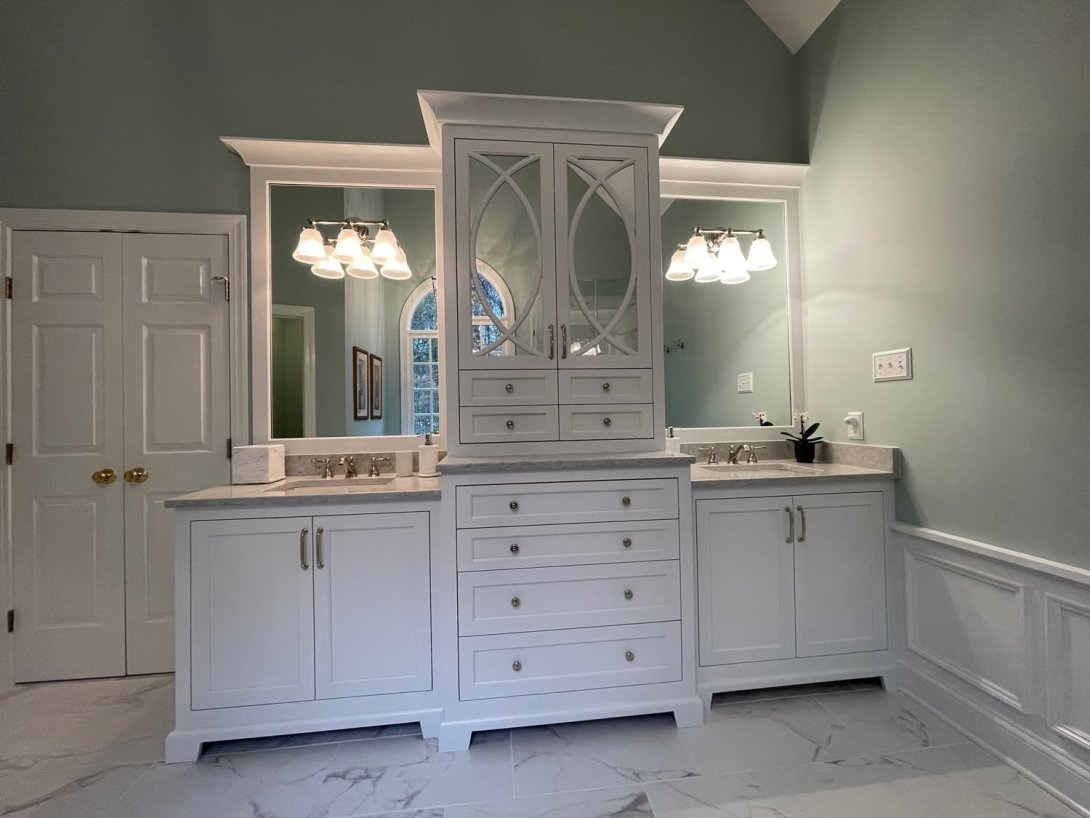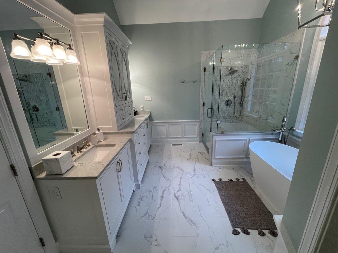 This master bath remodel is a true study in modern luxury and classic elegance, creating a serene and sophisticated spa-like retreat. The floor and double vanity countertops are a stunning white marble with intricate gray veining, providing a clean, bright, and timeless foundation. The walls are a calming, light sage green, contrasted by classic white wainscoting that adds traditional charm and visual texture. A custom-built, white double vanity features a central cabinet for abundant storage, flanked by two sink areas with polished nickel fixtures, tying into the luxurious feel.