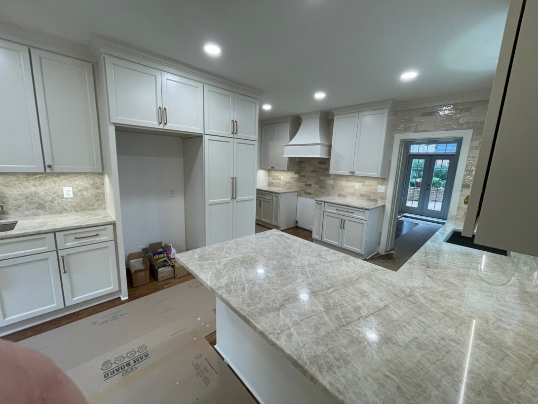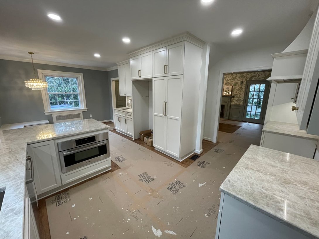 This Northside Richmond renovation reimagined the heart of the home with a timeless, modern design. The kitchen now features custom cabinetry in a crisp painted finish, paired with elegant marble-look countertops that add both durability and sophistication. A large peninsula and expanded work surfaces maximize prep and gathering space, while integrated storage solutions keep the layout efficient and uncluttered. Subtle backsplash tilework, under-cabinet lighting, and premium fixtures elevate the space, blending form and function seamlessly.