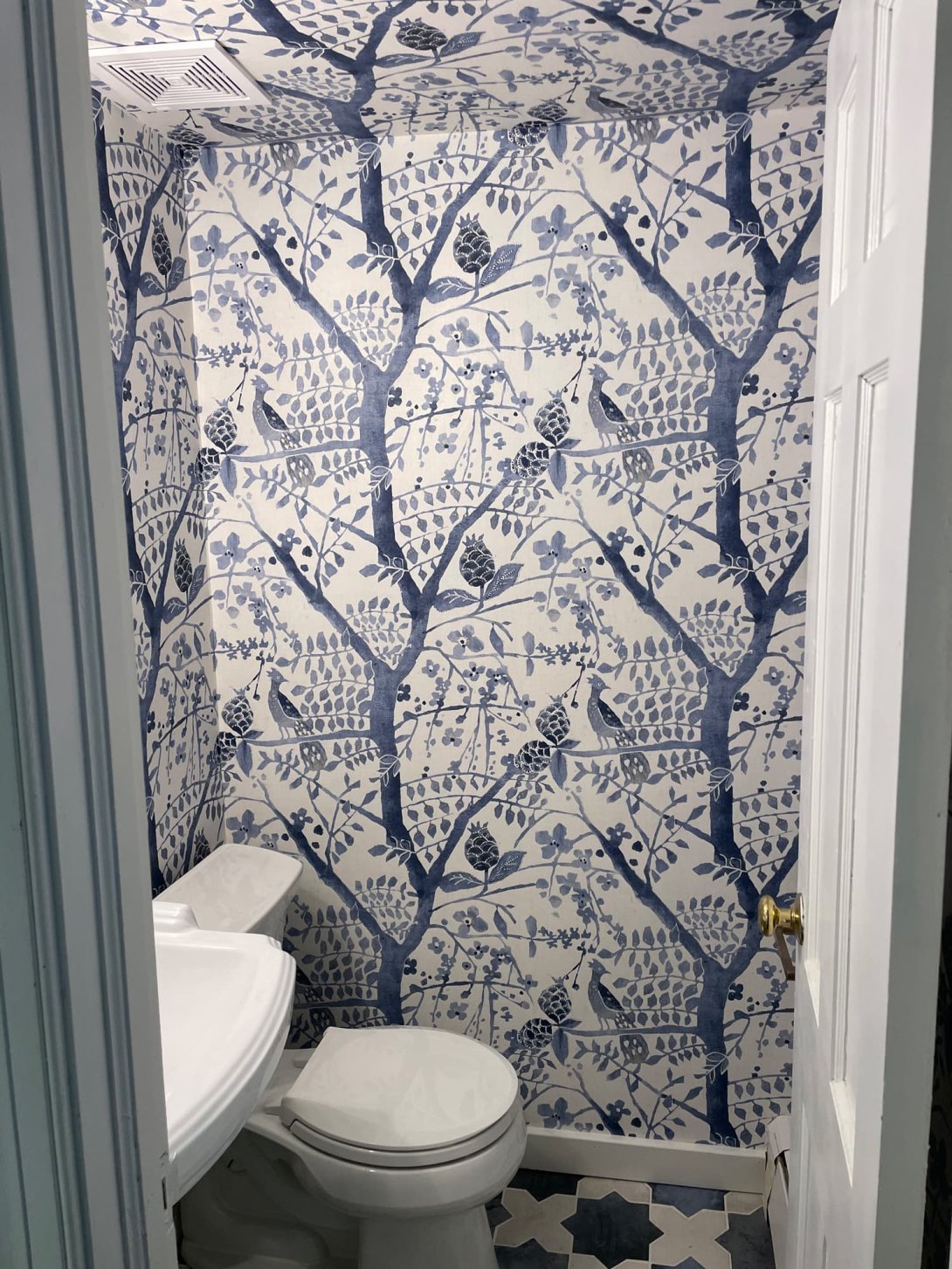 The half-bath received an equally striking transformation. Bold blue-and-white wallpaper with a nature-inspired motif turns the compact space into a statement room, complemented by patterned tile flooring and classic pedestal fixtures. This balance of playful design and practical detailing gives the home both everyday comfort and a touch of luxury.