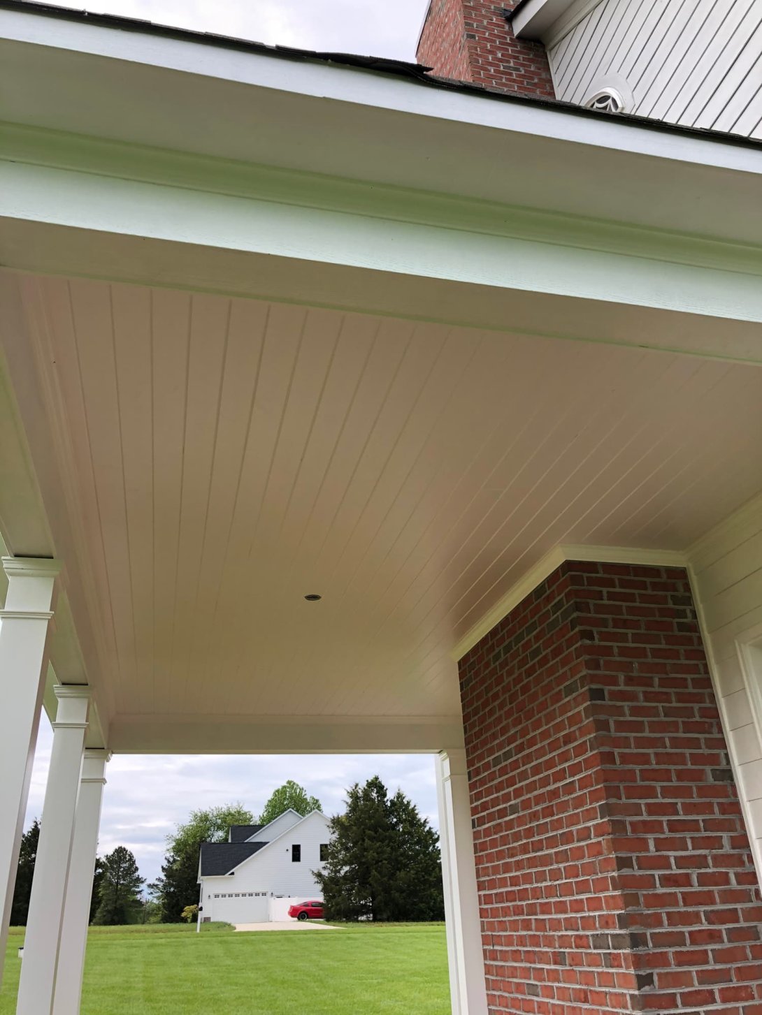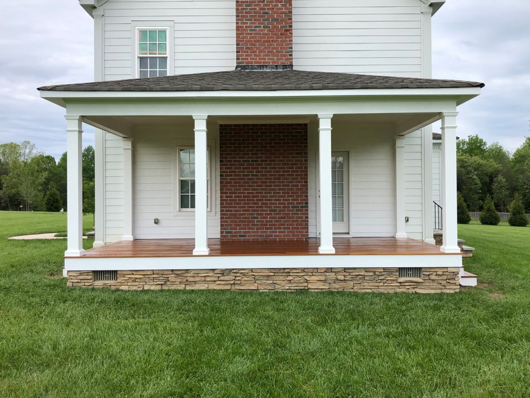 Substantial, stately, and classically detailed square columns now provide a sense of permanence and elegance. The old floor was replaced with stunning, rich-toned hardwood decking, offering a warm contrast against the crisp white structure and brick chimney. The ceiling was beautifully finished with timeless white beadboard, completing the clean, polished look. This dramatic remodel opens up the space and creates a truly graceful and inviting outdoor room that perfectly complements the home.