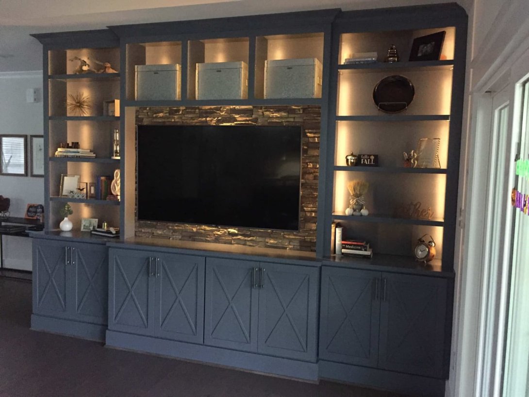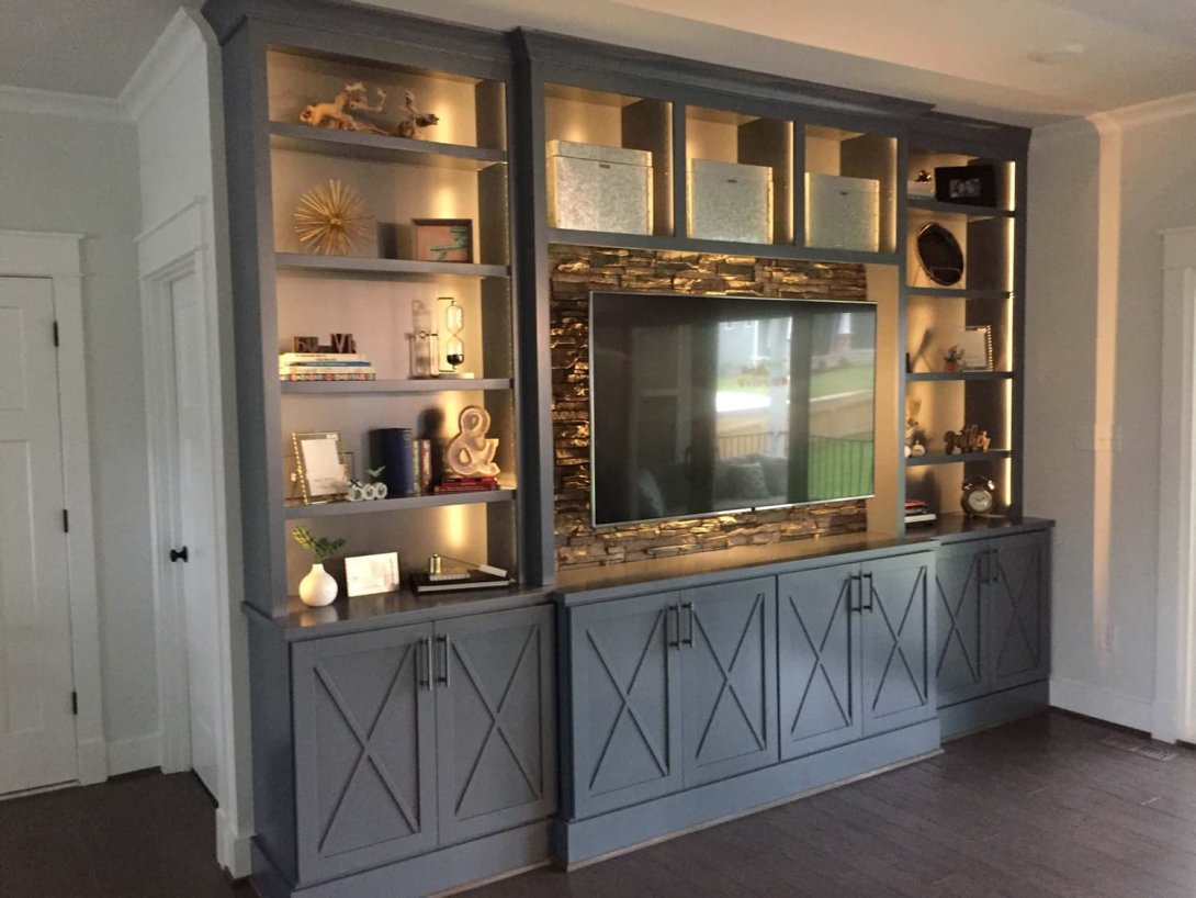 This custom entertainment center creates a dramatic focal point, masterfully blending contemporary design with rustic, natural textures. The substantial, floor-to-ceiling unit is finished in a sophisticated slate blue, giving it a modern yet inviting feel. The lower cabinets feature distinctive cross-buck (X-style) doors that add a touch of refined farmhouse charm.