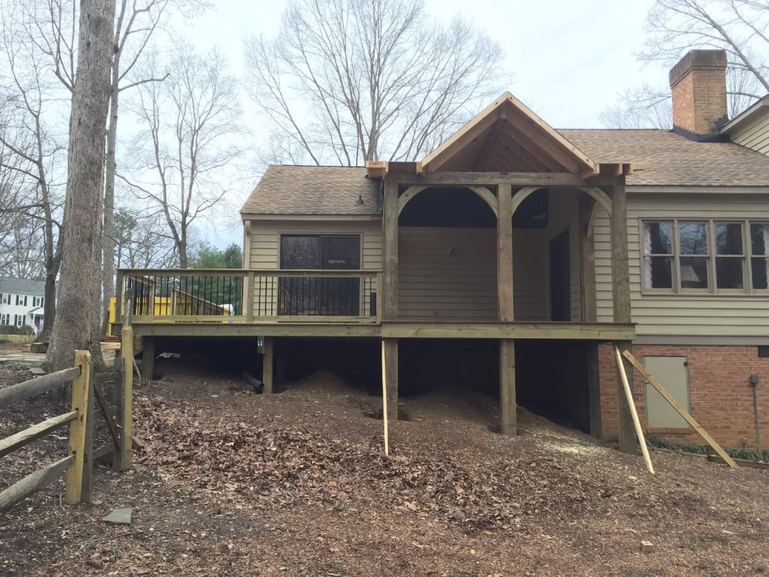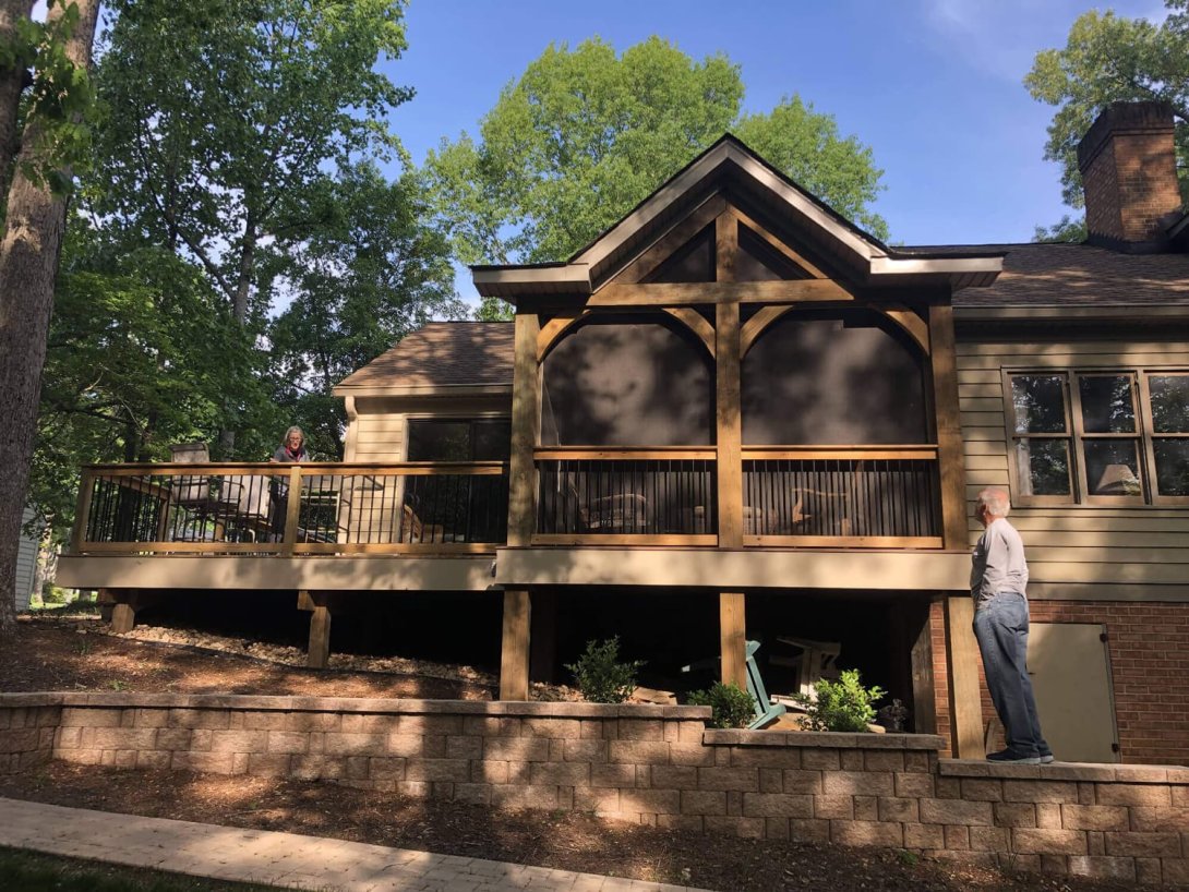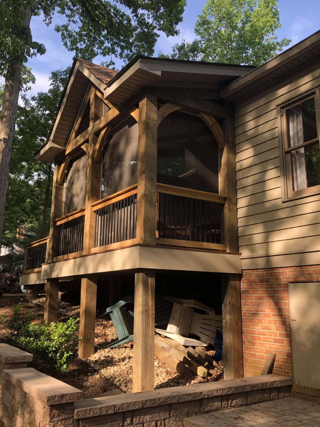 This project is a stunning showcase of rustic elegance, featuring a new open-air deck and a magnificent timber frame screened porch. The porch is the architectural centerpiece, constructed with massive, rough-sawn wood posts and beams that create a powerful, grounded presence. Graceful, curved knee braces form beautiful arches within the sturdy frame, adding a touch of classic, artisanal craftsmanship.