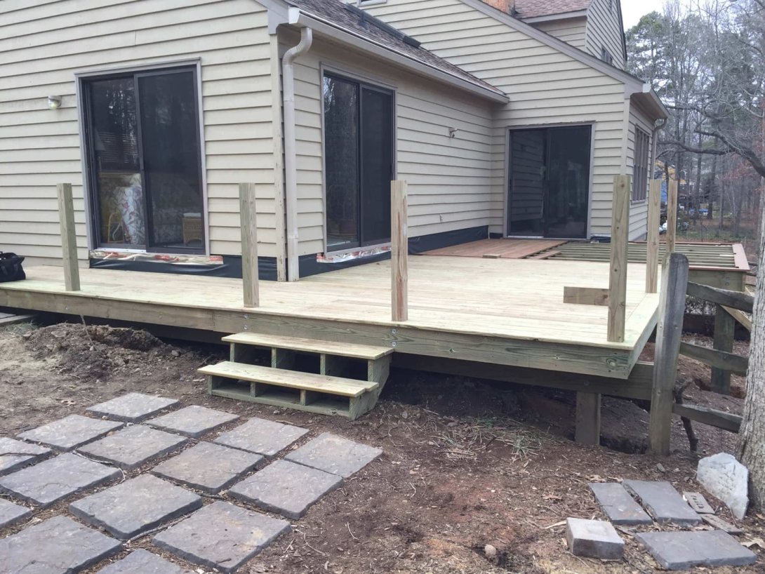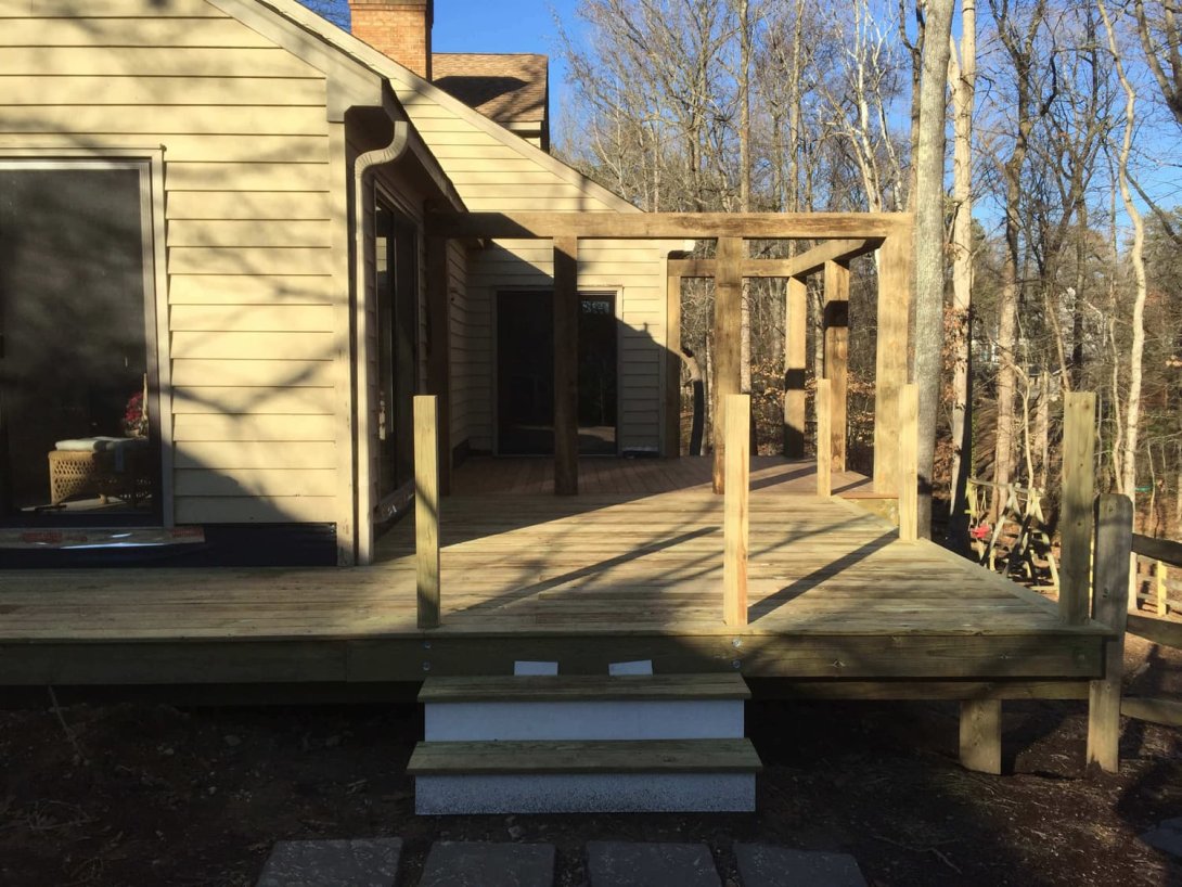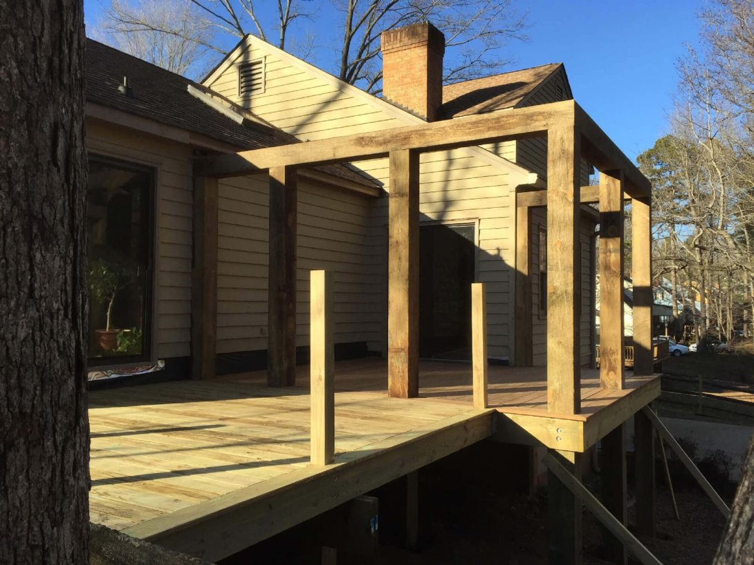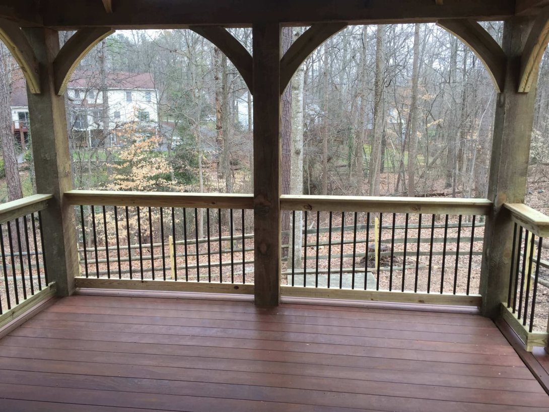 This project is a stunning showcase of rustic elegance, featuring a new open-air deck and a magnificent timber frame screened porch. The porch is the architectural centerpiece, constructed with massive, rough-sawn wood posts and beams that create a powerful, grounded presence. Graceful, curved knee braces form beautiful arches within the sturdy frame, adding a touch of classic, artisanal craftsmanship.