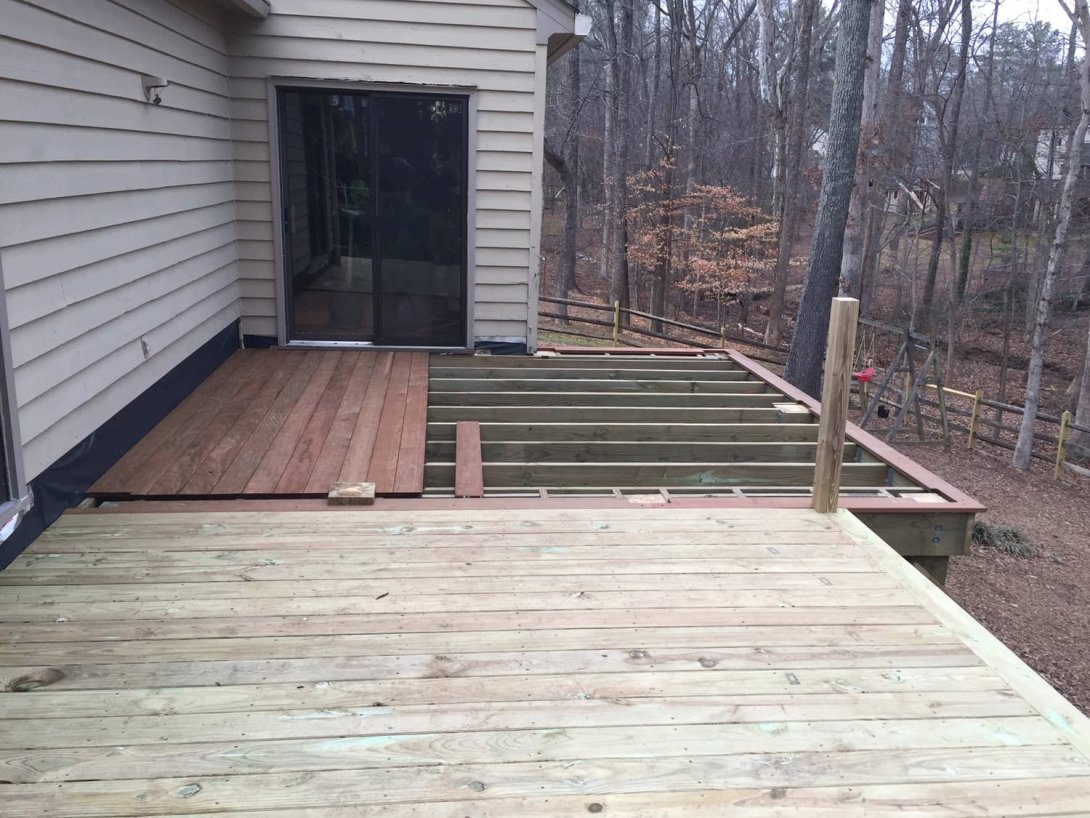 This expansive covered space is fully screened, providing a spacious, insect-free outdoor room for three-season enjoyment. The project thoughtfully combines the open deck with the protected porch, using rich, dark-stained hardwood for the porch floor. The entire structure is unified by a railing with sleek black metal balusters and is beautifully integrated into the landscape with a new stone retaining wall at its base.