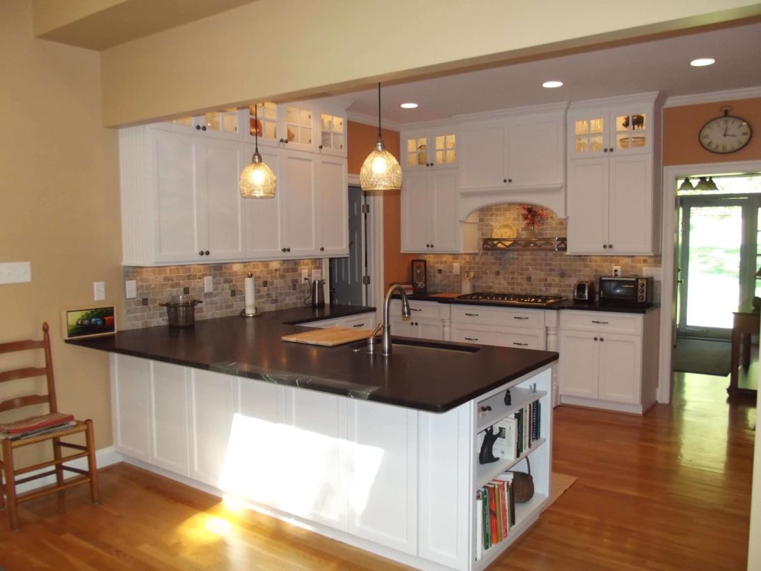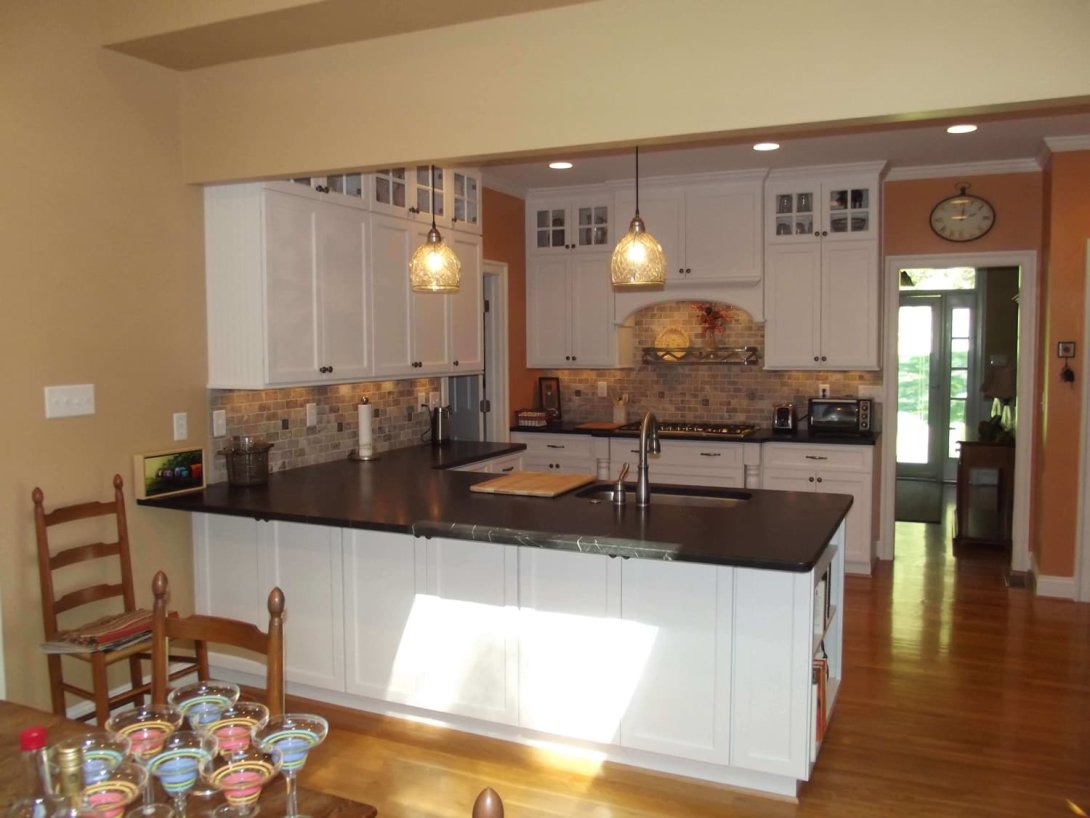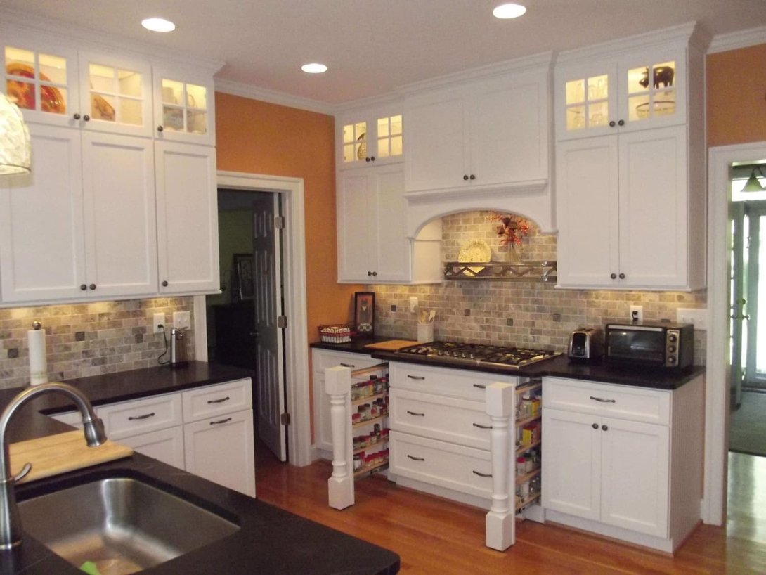 This remodel turned a traditional kitchen into a warm, functional, and elegant gathering space. Crisp white cabinetry with glass-front upper panels brings brightness and display opportunities, while the rich stone backsplash adds texture and depth. Custom cabinetry features include hidden pull-outs for spices and storage, maximizing both efficiency and convenience.