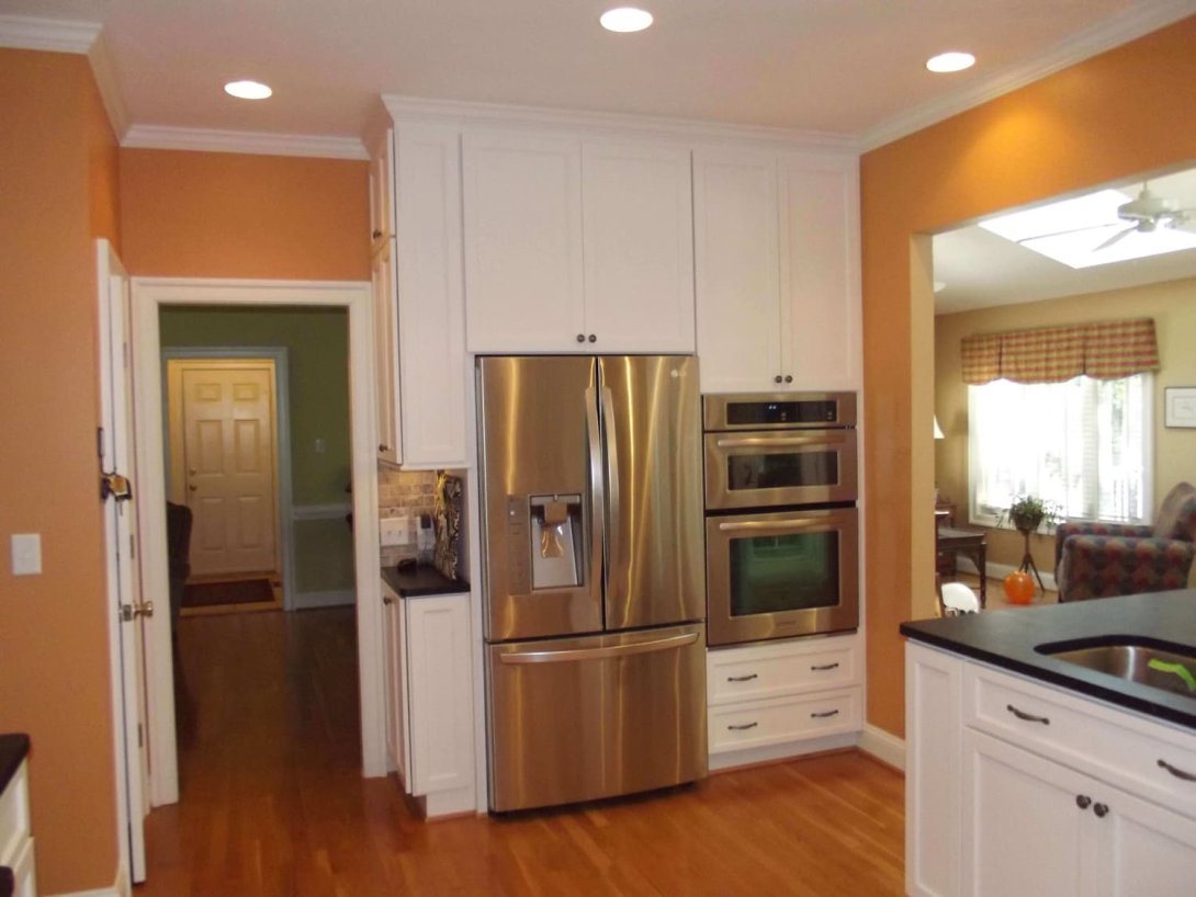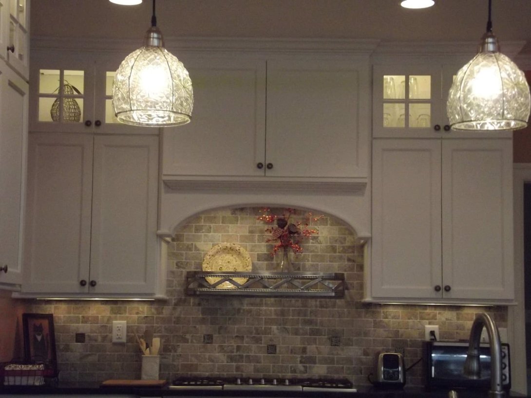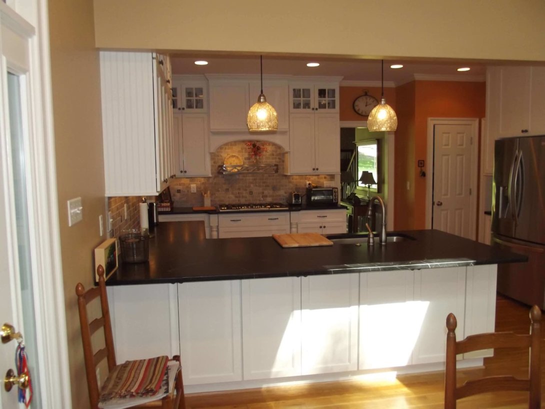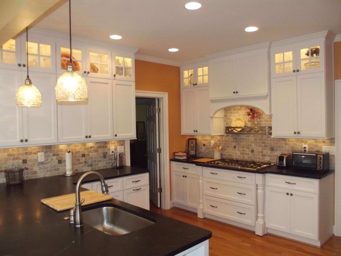 This remodel turned a traditional kitchen into a warm, functional, and elegant gathering space. Crisp white cabinetry with glass-front upper panels brings brightness and display opportunities, while the rich stone backsplash adds texture and depth. Custom cabinetry features include hidden pull-outs for spices and storage, maximizing both efficiency and convenience.