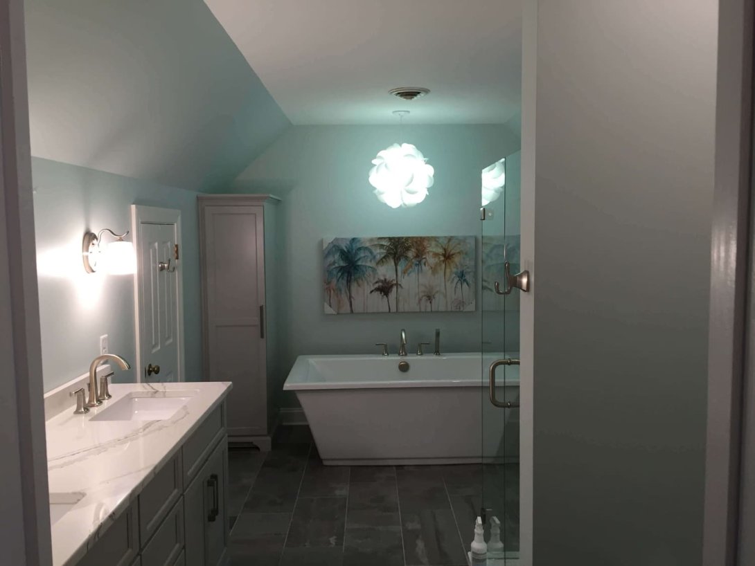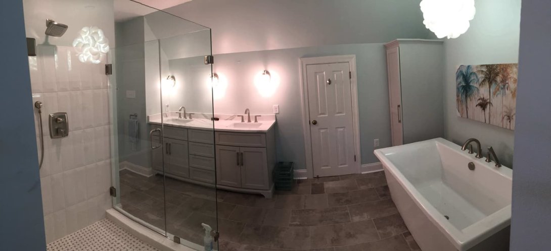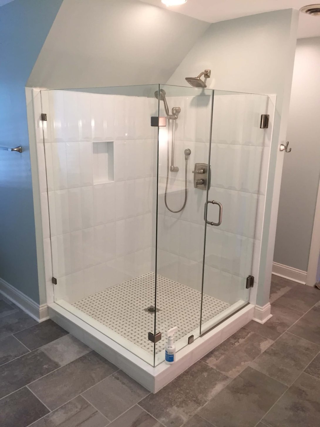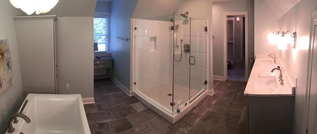 This bathroom remodel on Salsibury Brigstock Rd expertly navigates a challenging sloped ceiling to create a serene and spacious master bath. The design is grounded by large-format gray slate tiles on the floor, providing a modern, neutral foundation. The eye is immediately drawn to the large, custom glass-enclosed shower, cleverly designed to fit within the angled space without feeling cramped. Inside, the walls are clad in a classic white subway tile, while the floor features a mosaic of small, hexagonal tiles for both a stylish look and enhanced grip. Brushed nickel fixtures, including a rainfall showerhead, add a touch of timeless sophistication.