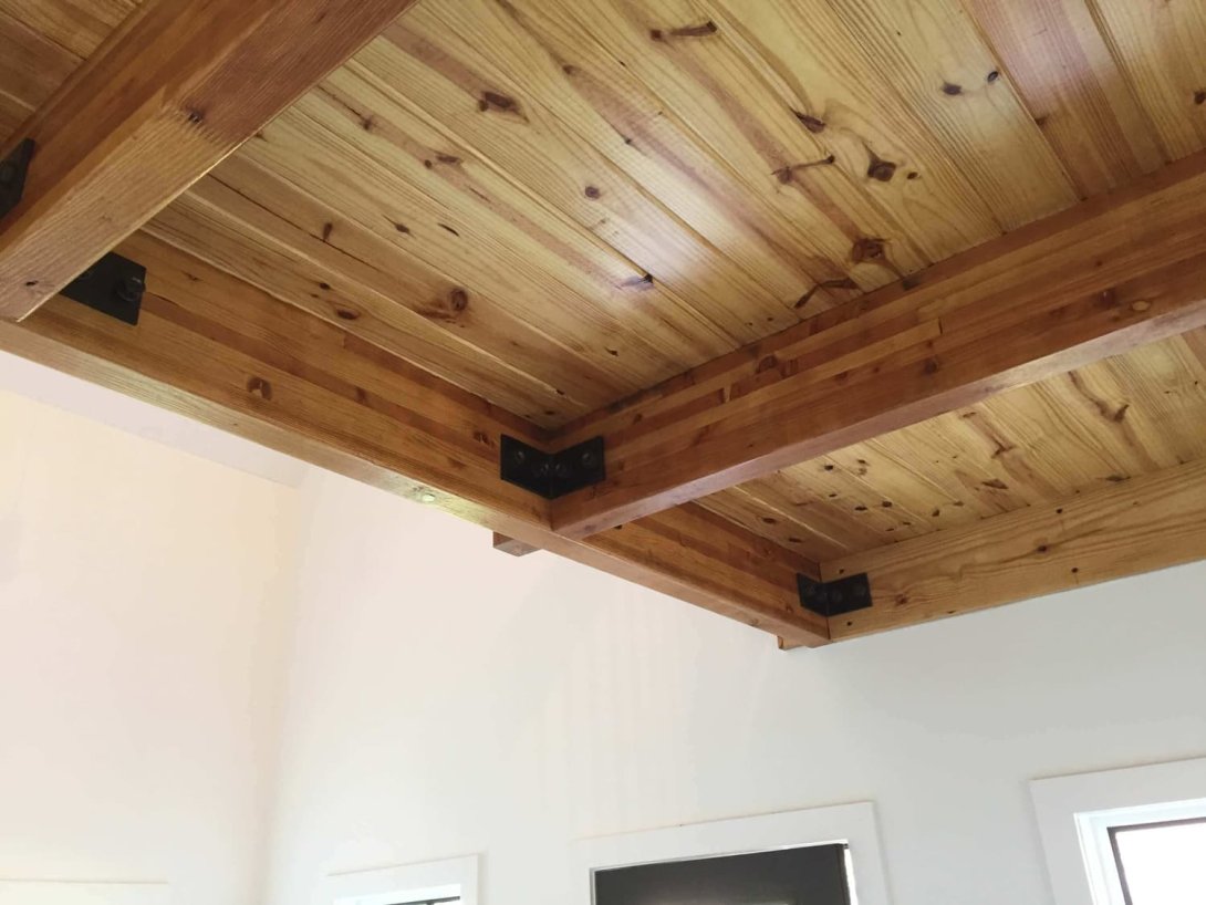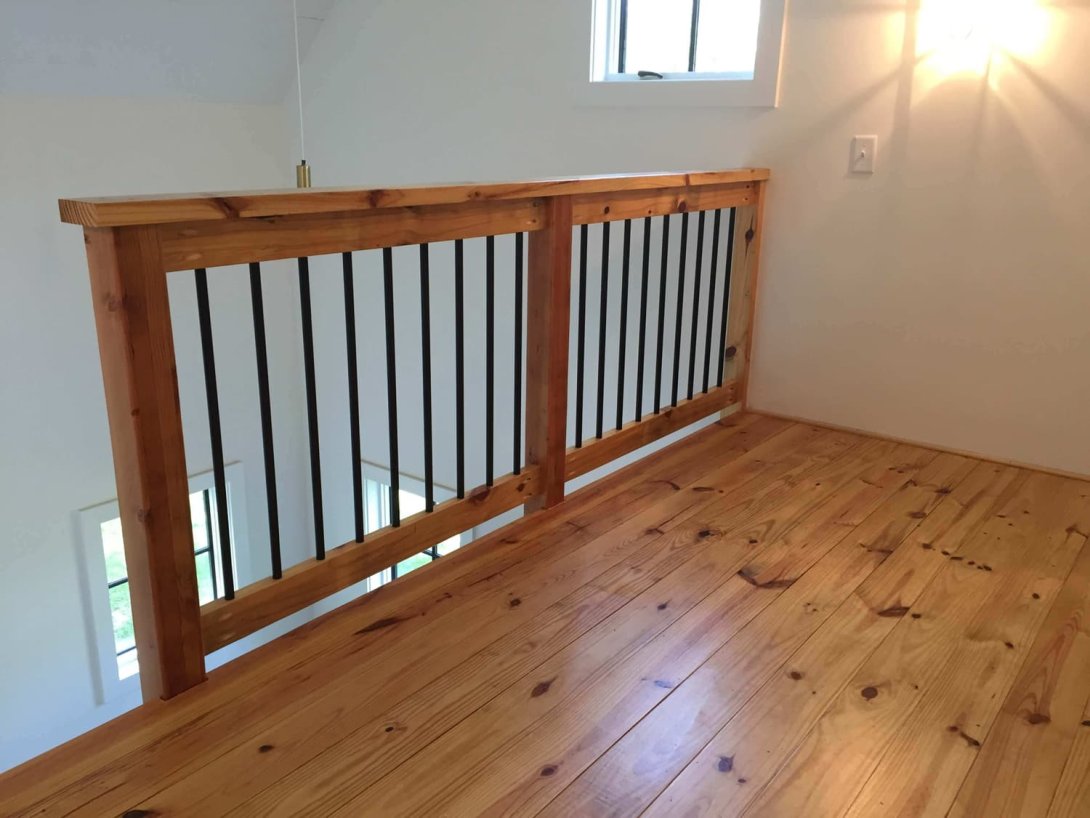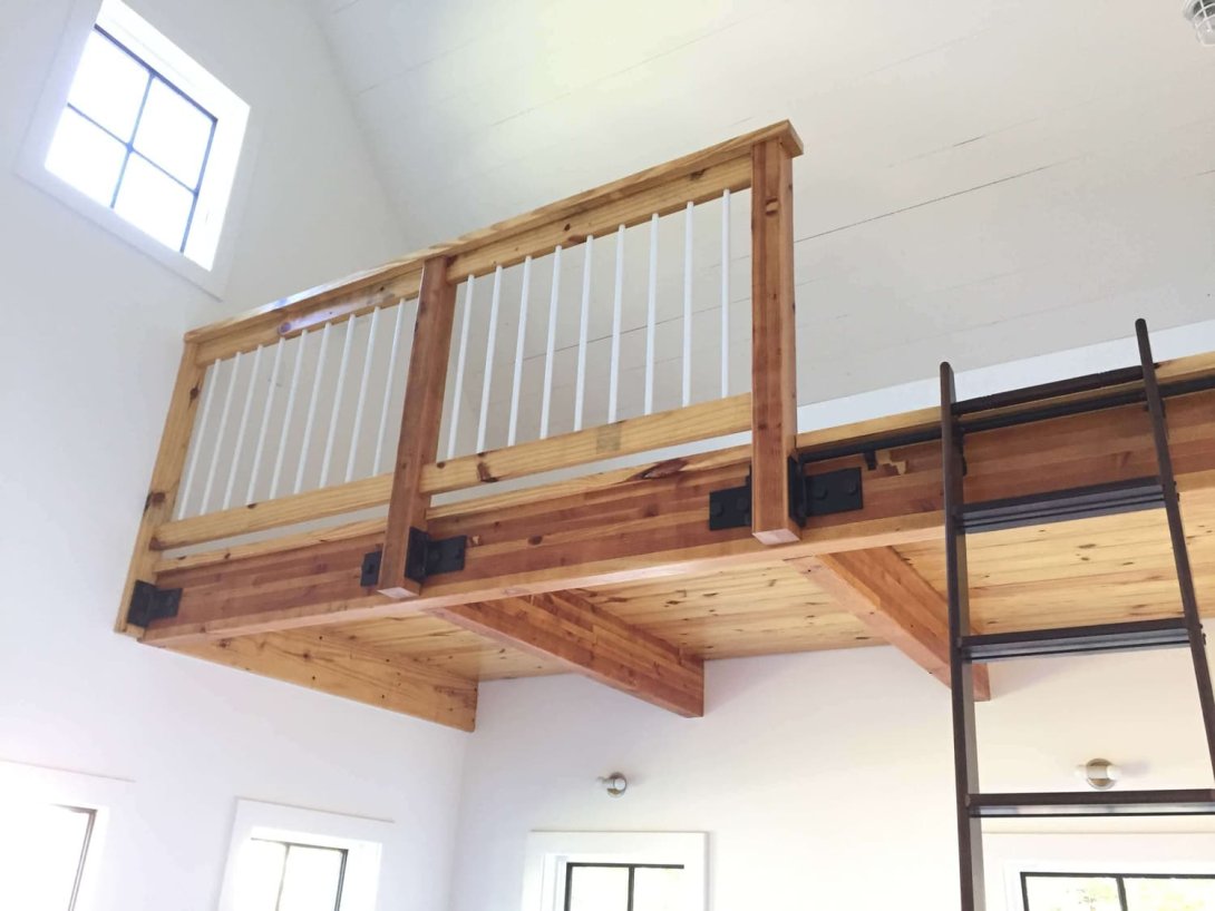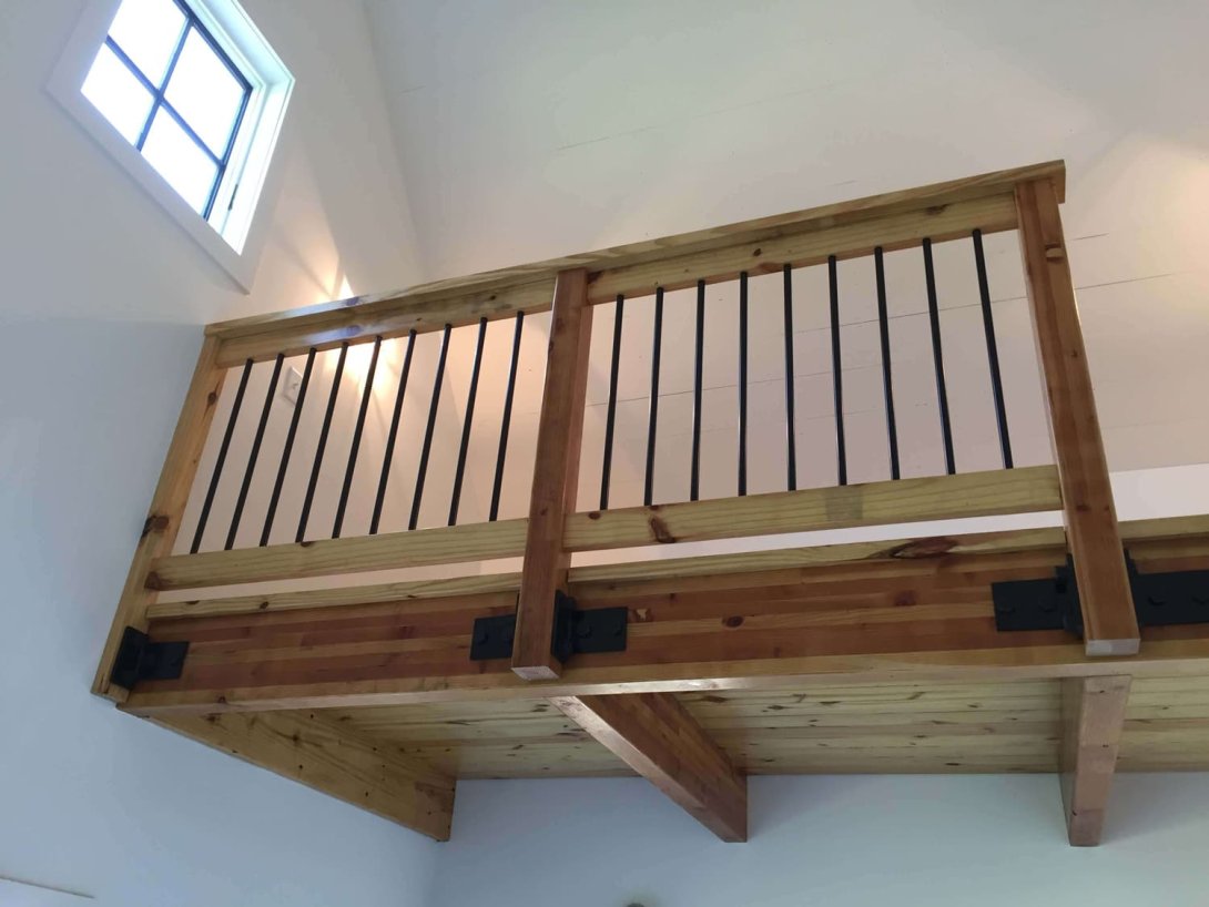 The centerpiece of the interior is the substantial sleeping or storage loft, crafted from warm, natural pine. Its exposed wood beams and floorboards, accented with decorative black metal hardware, provide a rich, rustic contrast to the bright white walls. A custom railing with sleek black balusters ensures safety while completing the rustic-modern aesthetic. This charming space is a true backyard oasis, perfect for a studio, office, or quiet escape.