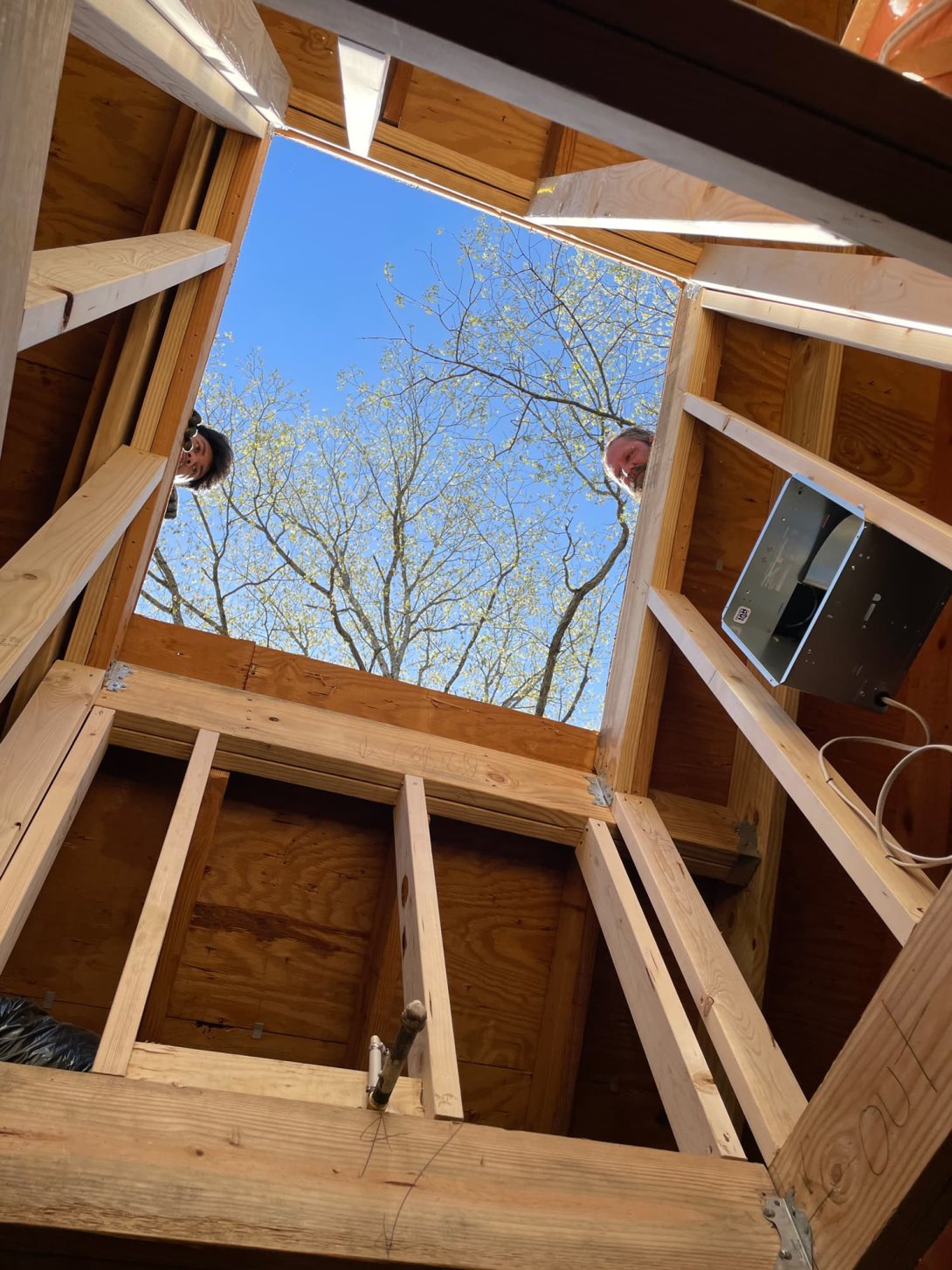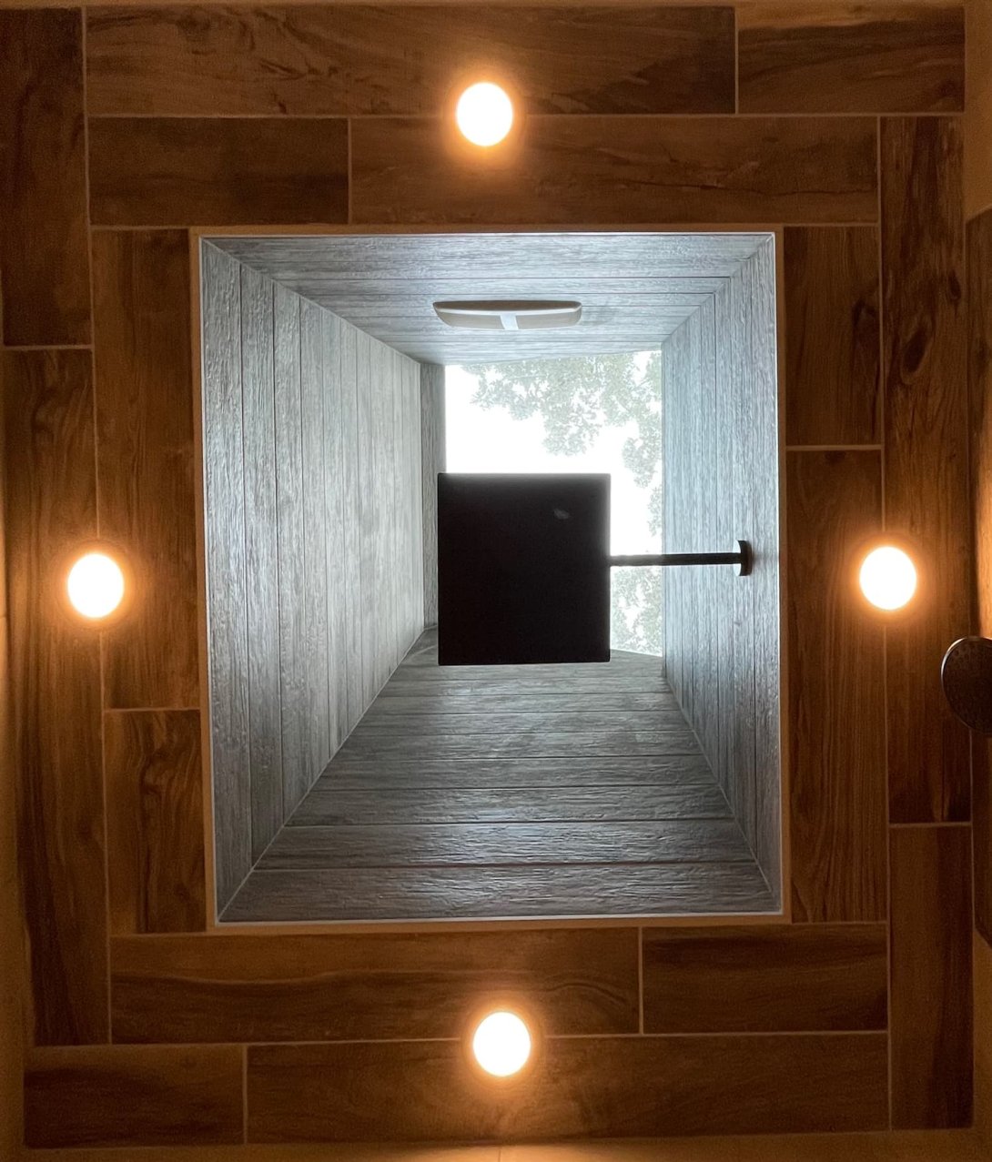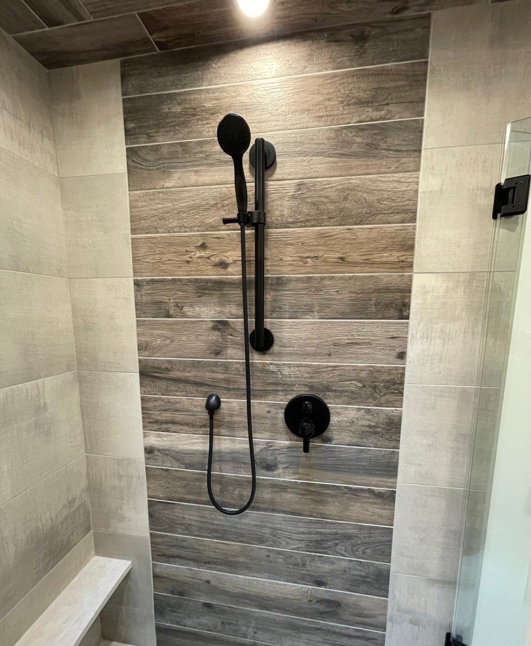 This Starlight Shower remodel is a triumph of creative design, transforming a simple bathroom into a tranquil, light-filled oasis. The most striking feature is the custom skylight shaft, which draws the eye upward and floods the shower with natural light, creating a feeling of showering under the open sky. The design uses contrasting tile patterns to define the space: a light, neutral-toned large-format tile on the walls creates a sleek backdrop, while a rustic wood-plank style tile on the ceiling and a vertical accent wall in the shower adds warmth and texture.