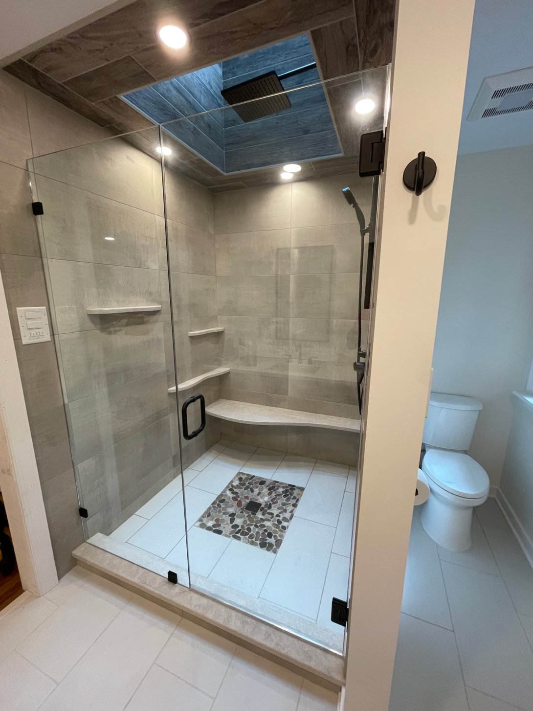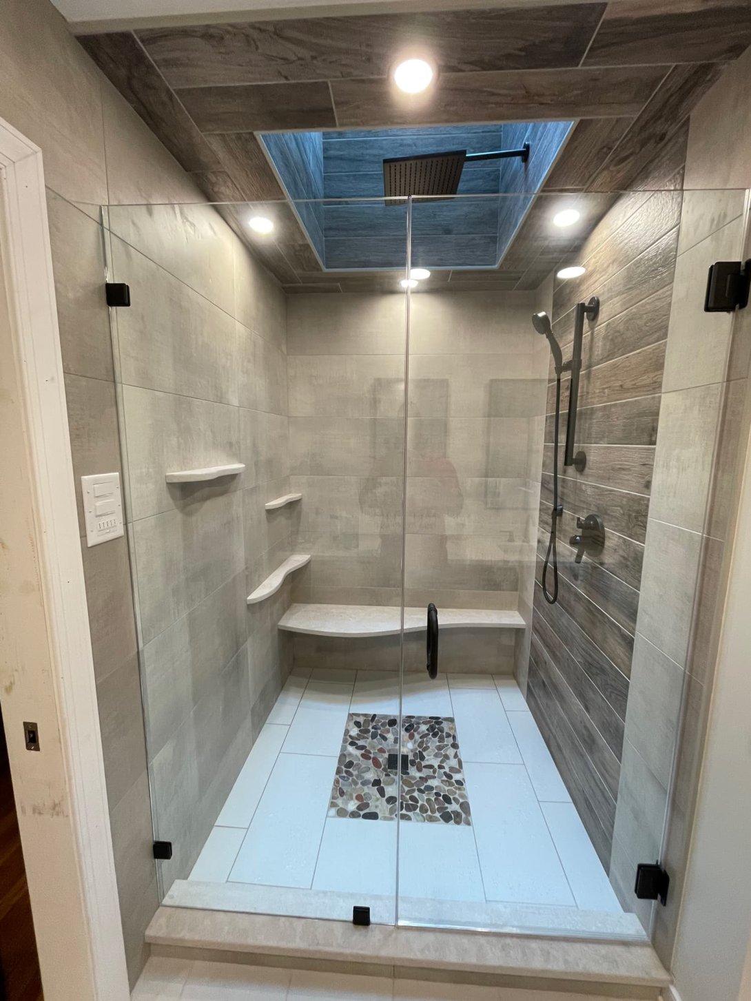 The floor is a thoughtful mix of materials, with a clean white tile complemented by a central mosaic of polished river stones, adding a unique, spa-like feel. The shower is both comfortable and practical, with a built-in bench and multiple storage niches carved directly into the tiled walls. Matte black hardware, including a rain shower head, a handheld sprayer, and frameless glass enclosures, provides a modern, clean-lined finish. This space demonstrates how a bold, innovative feature, like the custom skylight, can redefine a room, making a daily routine feel like a luxurious escape.