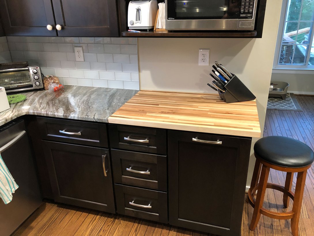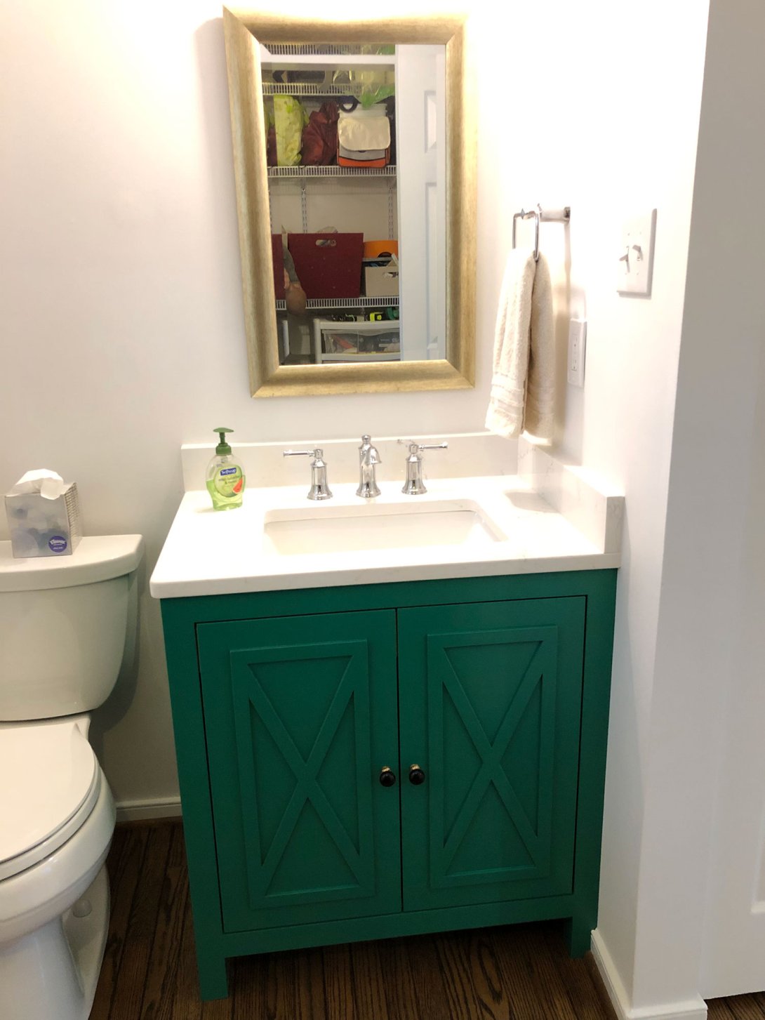 The new footprint also includes a stylish powder room, which features a handsome dark green vanity with a distinctive cross-buck design. A small modification to the kitchen, adding a warm butcher block counter section, completed this seamless and valuable expansion of the home's main-floor living space.
