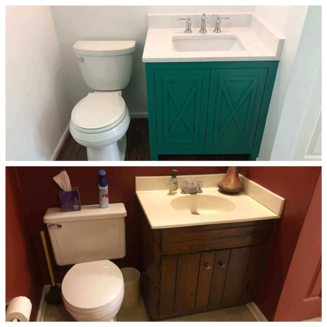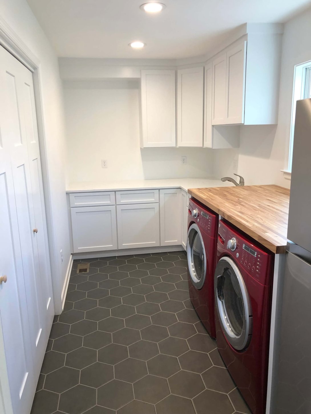 The kitchen was tastefully updated with dark espresso-finished Shaker cabinets and granite countertops. A dated powder room was given a fresh, modern personality with a bold new teal vanity. Finally, the laundry room was completely reimagined into a bright, highly functional space featuring crisp white cabinetry, a warm butcher block countertop, and stylish hexagonal floor tile.