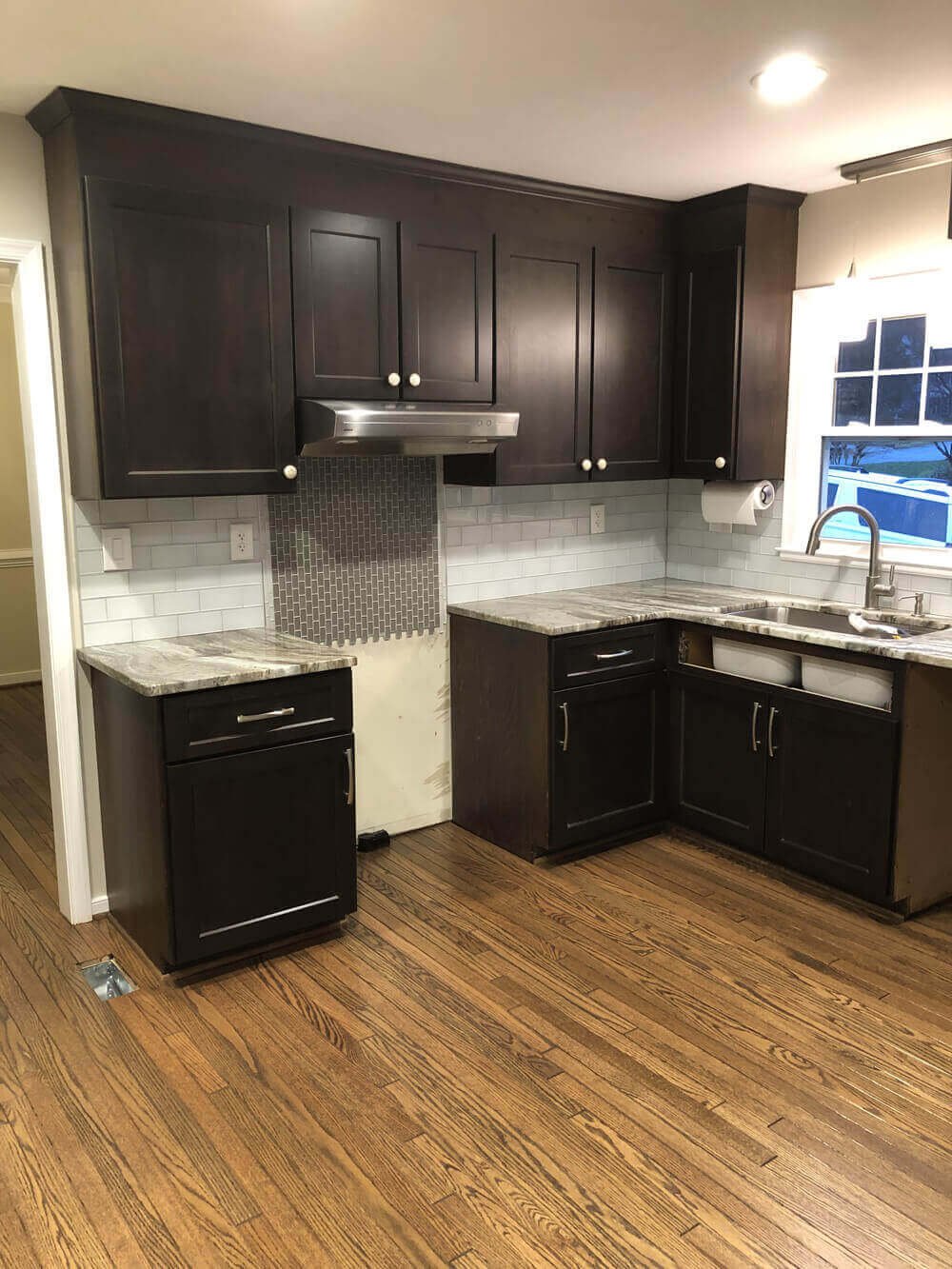 This project involved a comprehensive series of renovations that transformed this home both inside and out, significantly enhancing its curb appeal and interior function. The exterior work began with a new asphalt driveway and a custom-designed paver stone walkway, gracefully framed by a beautiful stacked-stone retaining wall. Inside, the main living areas were grounded with newly installed hardwood floors, finished in a rich, warm stain.