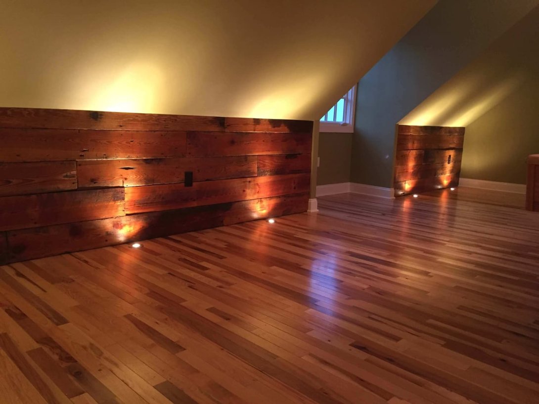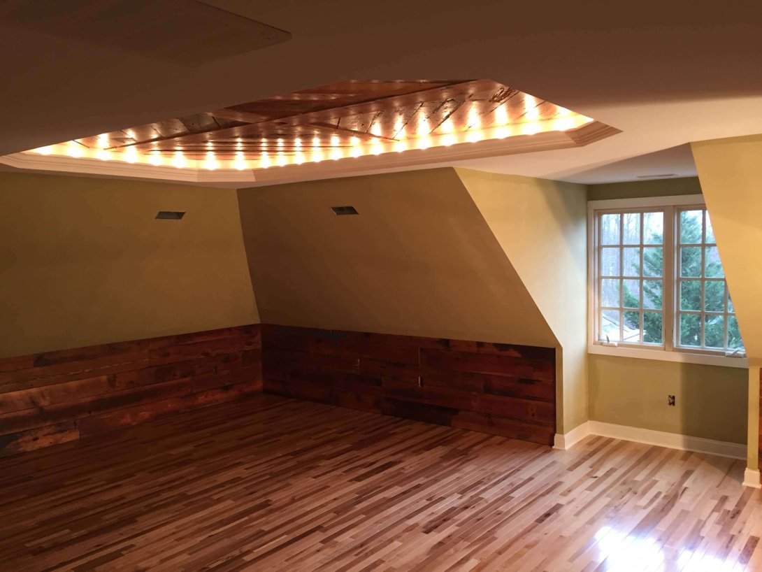 This stunning rustic element is carried overhead into a large tray ceiling feature, creating a dramatic focal point. A sophisticated, multi-layered lighting design is key, with hidden cove lighting illuminating the ceiling tray and custom uplights installed directly into the floor to graze the textured wood walls with a warm glow. New hardwood floors complete this stylish and highly functional bonus room, perfect for entertainment and relaxation.
