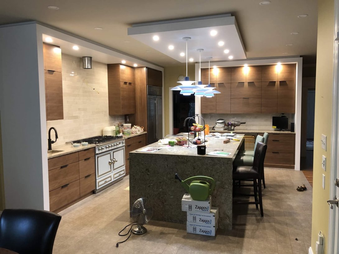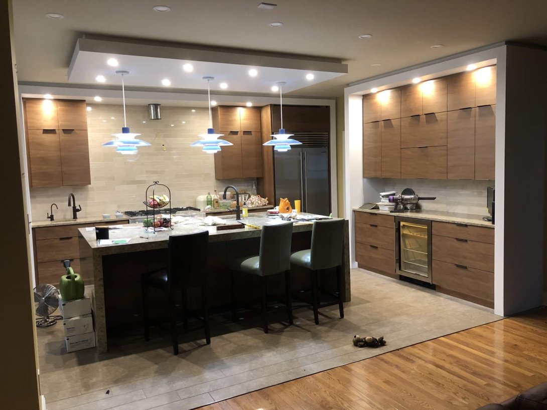 High-end appliances, including a chef-grade range and built-in refrigeration, are seamlessly integrated for both style and performance. Contemporary pendant lighting and recessed ceiling fixtures highlight the workspace and create layered ambiance throughout the room. A custom wine fridge and wet bar expand the kitchen’s functionality, making it equally suited for entertaining and daily living.