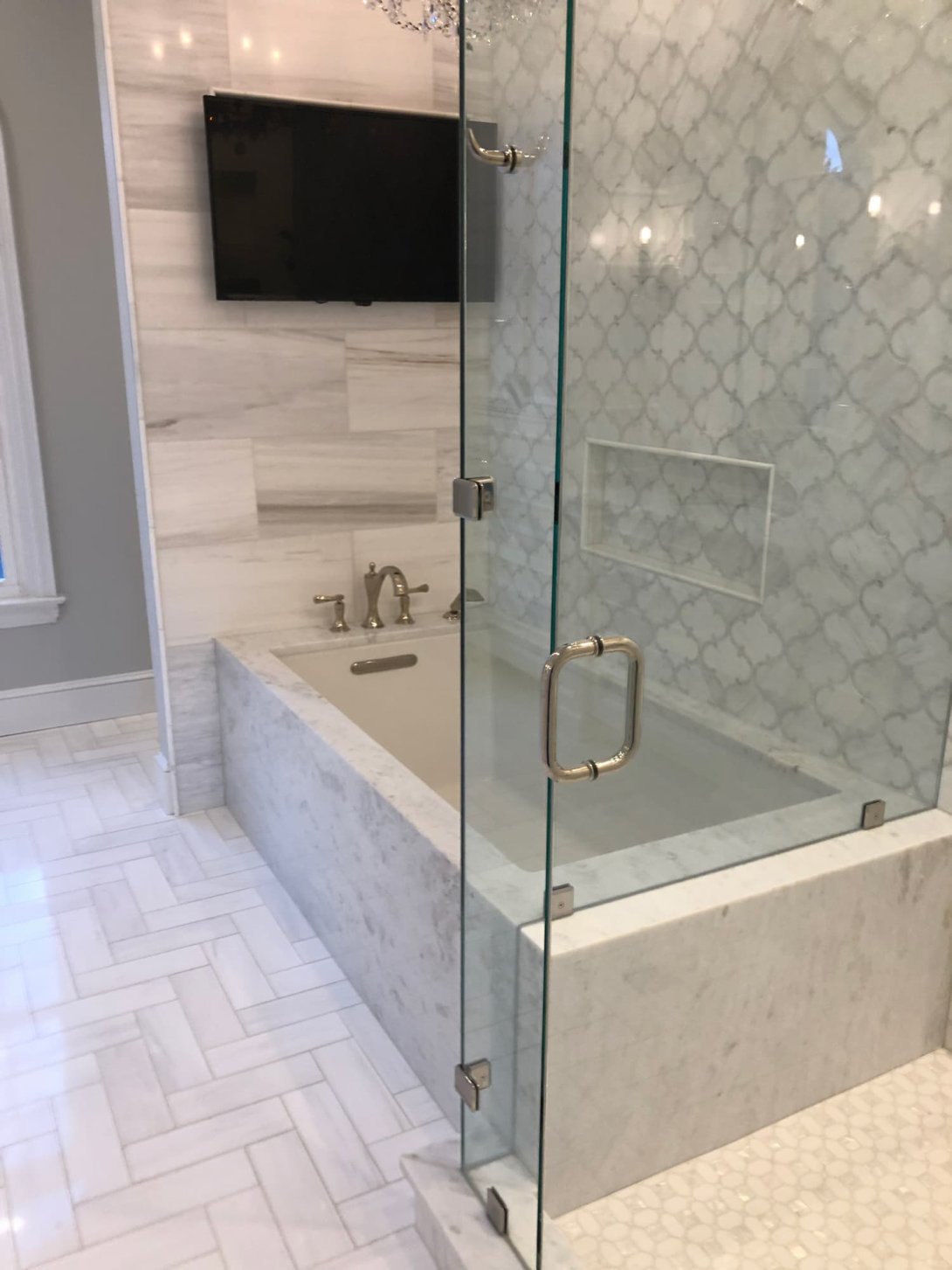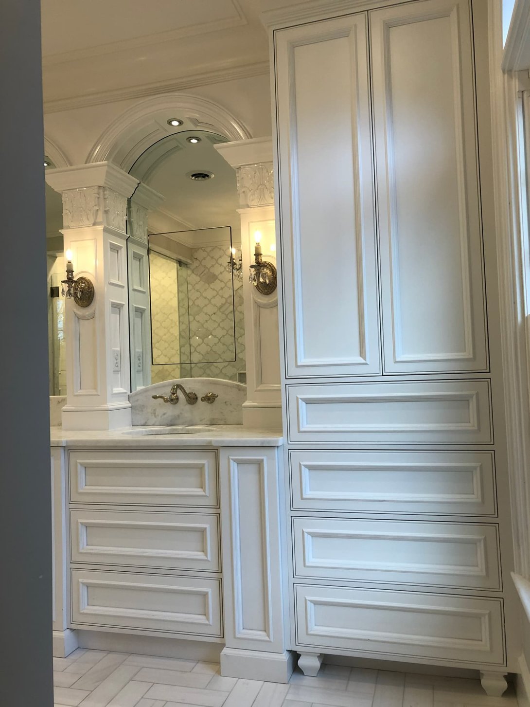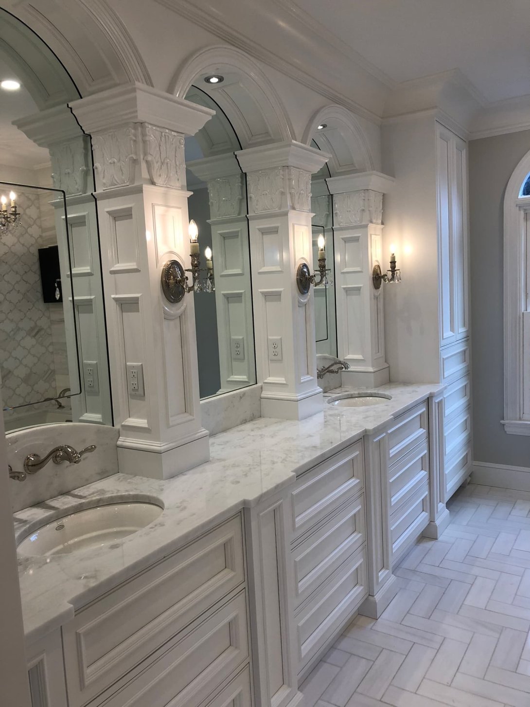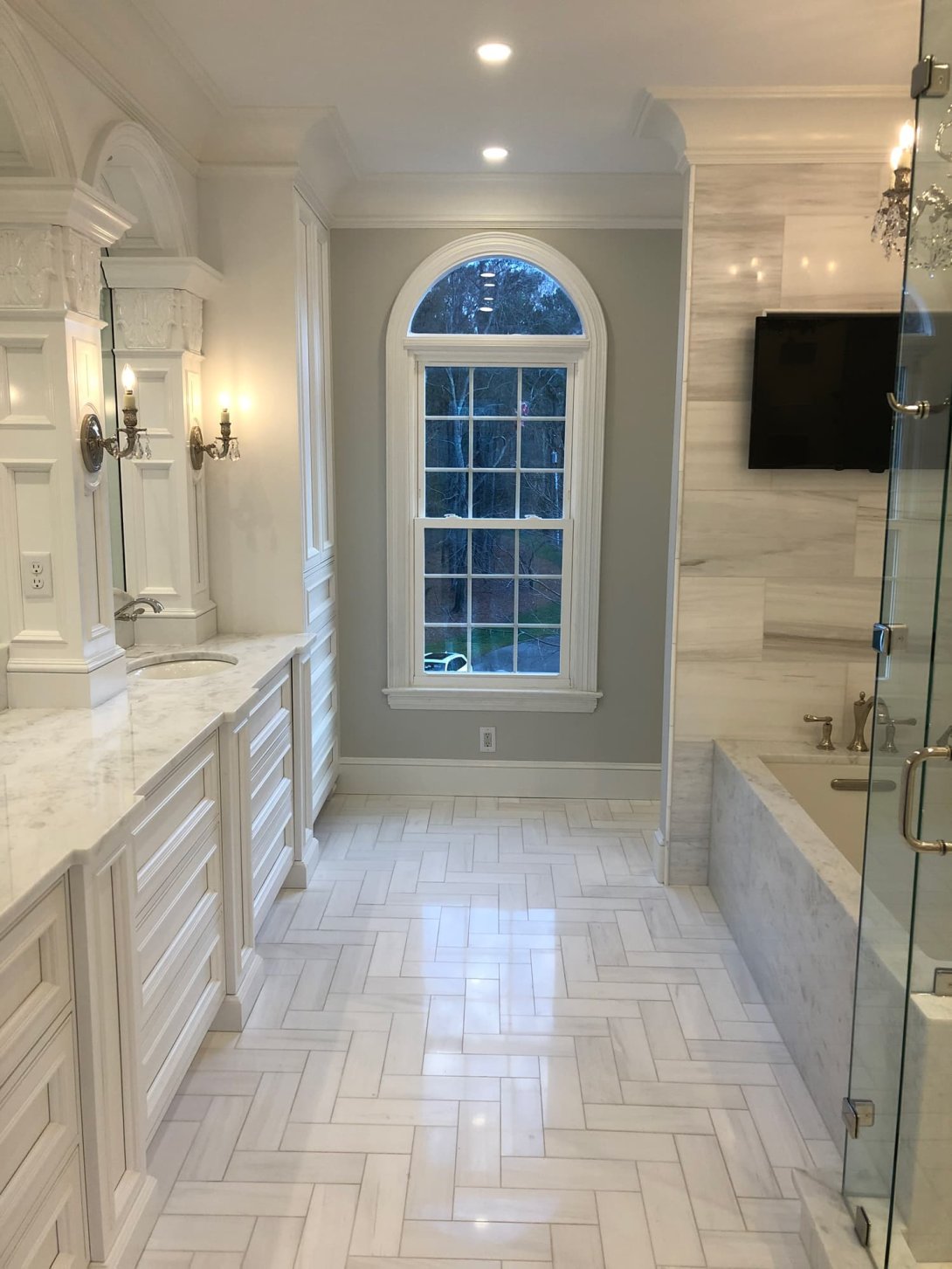 This traditional master bath renovation exudes timeless elegance and luxurious comfort, blending classic architectural details with modern amenities to create a truly lavish retreat. The expansive space features a striking herringbone pattern marble tile floor that extends throughout, laying a foundation of understated sophistication. The custom white cabinetry, meticulously crafted with intricate paneling and ornate fluted columns, defines the vanity area. Each vanity is topped with pristine white marble countertops and features elegant double sinks with classic polished nickel fixtures and delicate sconces that cast a soft, inviting glow. Arched mirrors above each sink echo the grace of the large arched window at the far end of the room, which floods the space with natural light.