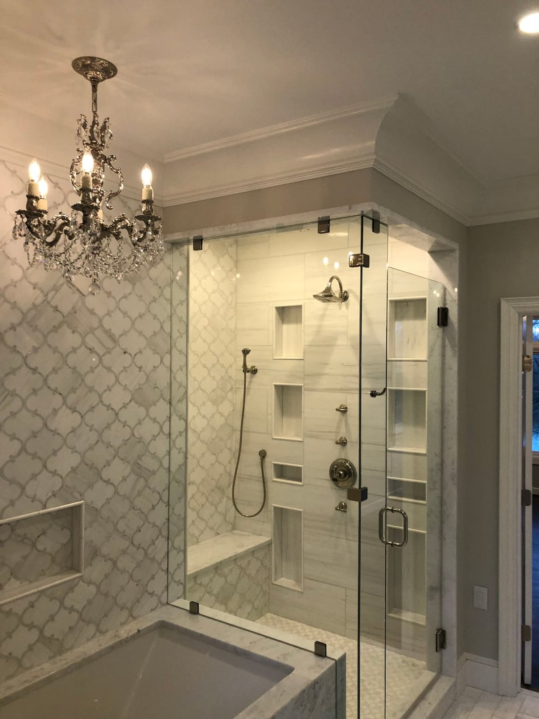 The wet room concept provides a seamless transition to the bathing area, which houses both a deep, luxurious soaking tub and an expansive walk-in shower. The shower is a masterpiece of design and functionality, featuring multiple shower heads, a built-in bench, and numerous integrated niches for storage, all encased in a frameless glass enclosure. Both the tub surround and select shower walls are clad in exquisite arabesque-patterned marble tiles, adding a layer of intricate detail and luxury, while other walls feature horizontal marble slabs for a clean, contemporary touch. A sparkling crystal chandelier adds a final touch of opulence, transforming this bathroom into a personal spa experience.